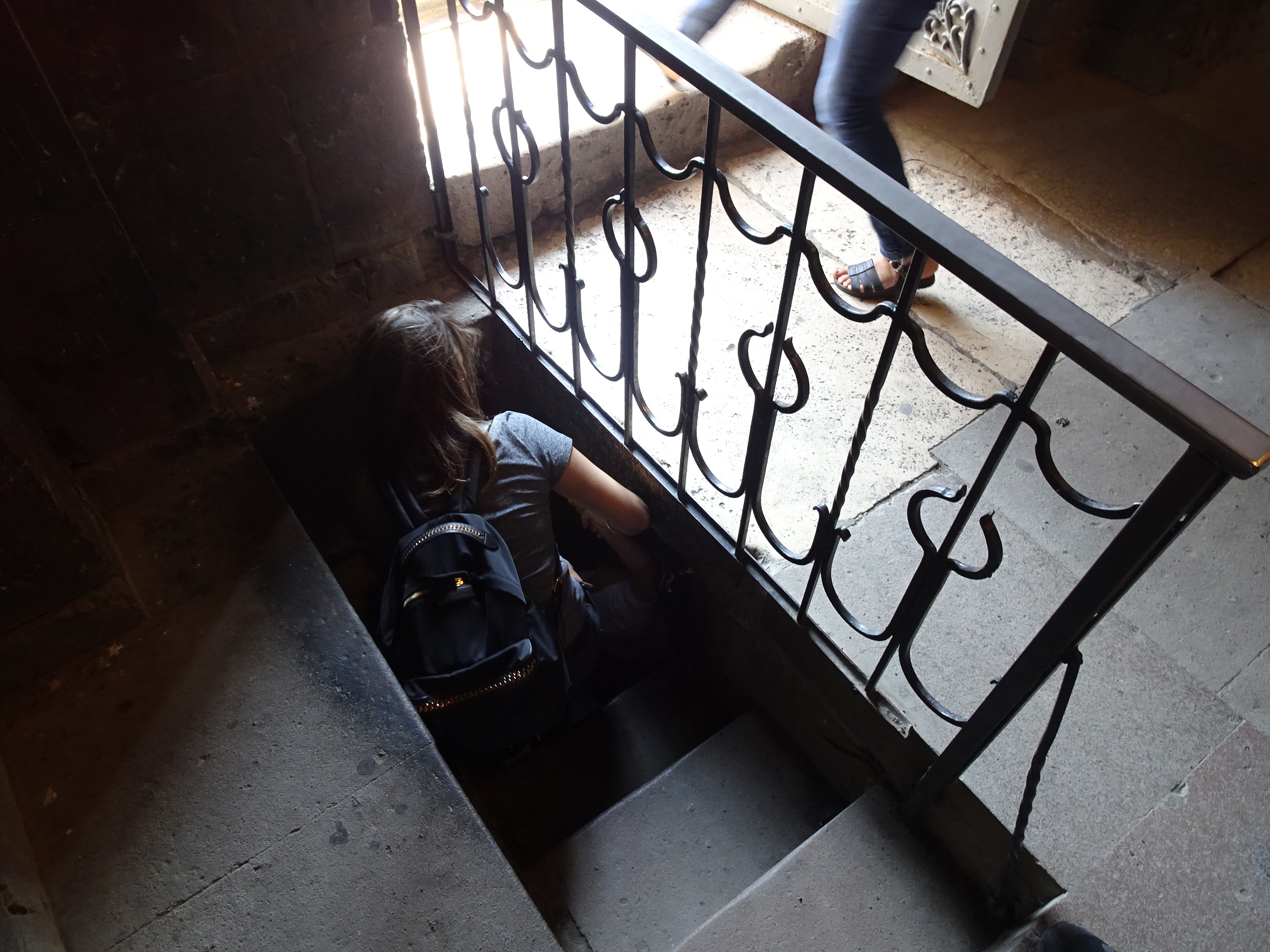 Biserica este construită pe două etaje, iar accesul la etajul superior se face doar pe niște trepte înguste suspendate. Am rămas puțin într-un „blocaj în trafic” așteptând ca ceilalți care urcau să își facă pozele pentru a putea ajunge sus.