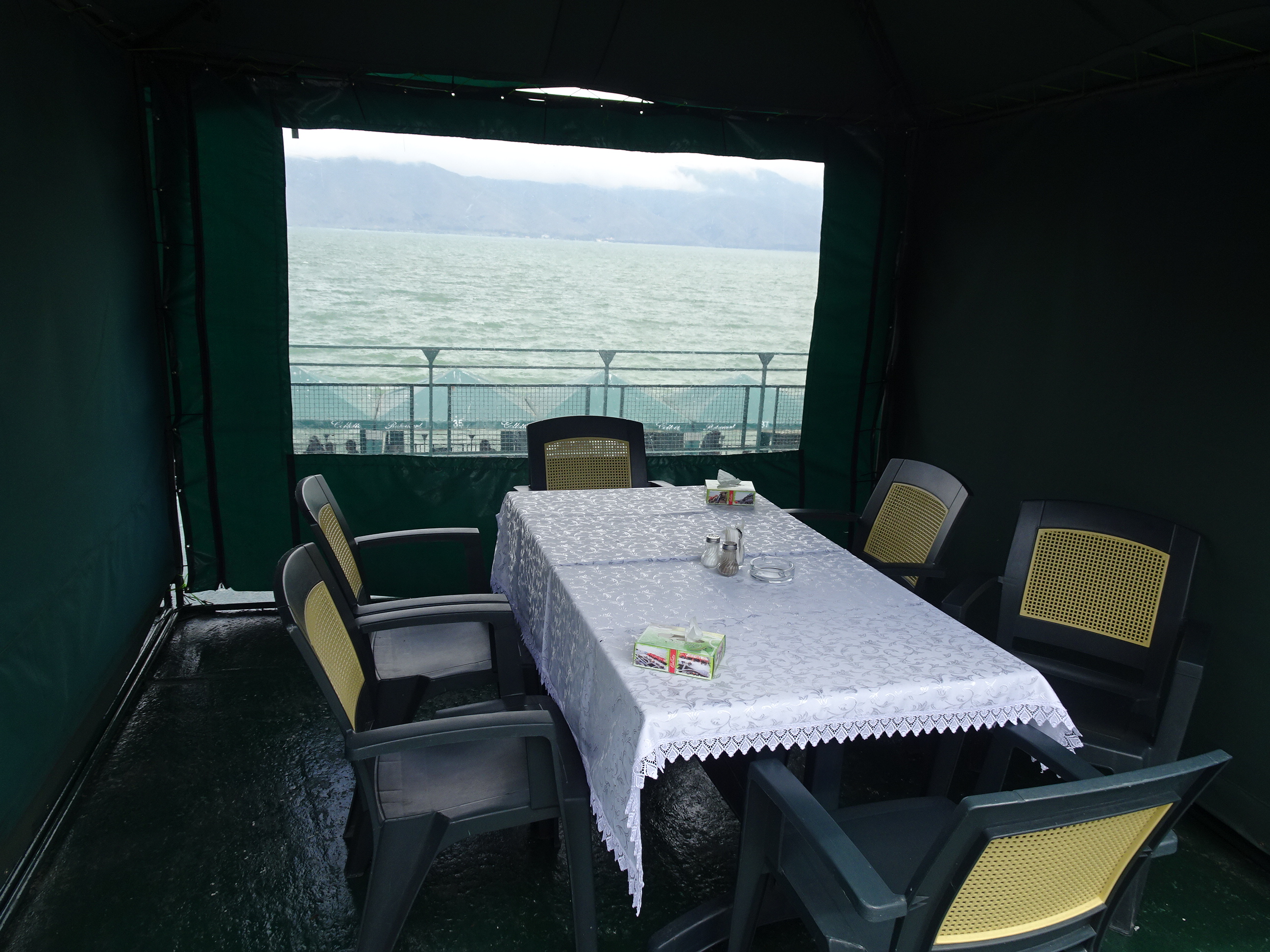 Masa noastră cu vedere și adăpost pentru vânt. Am mâncat un peste delicios proaspăt pescuit din lac.