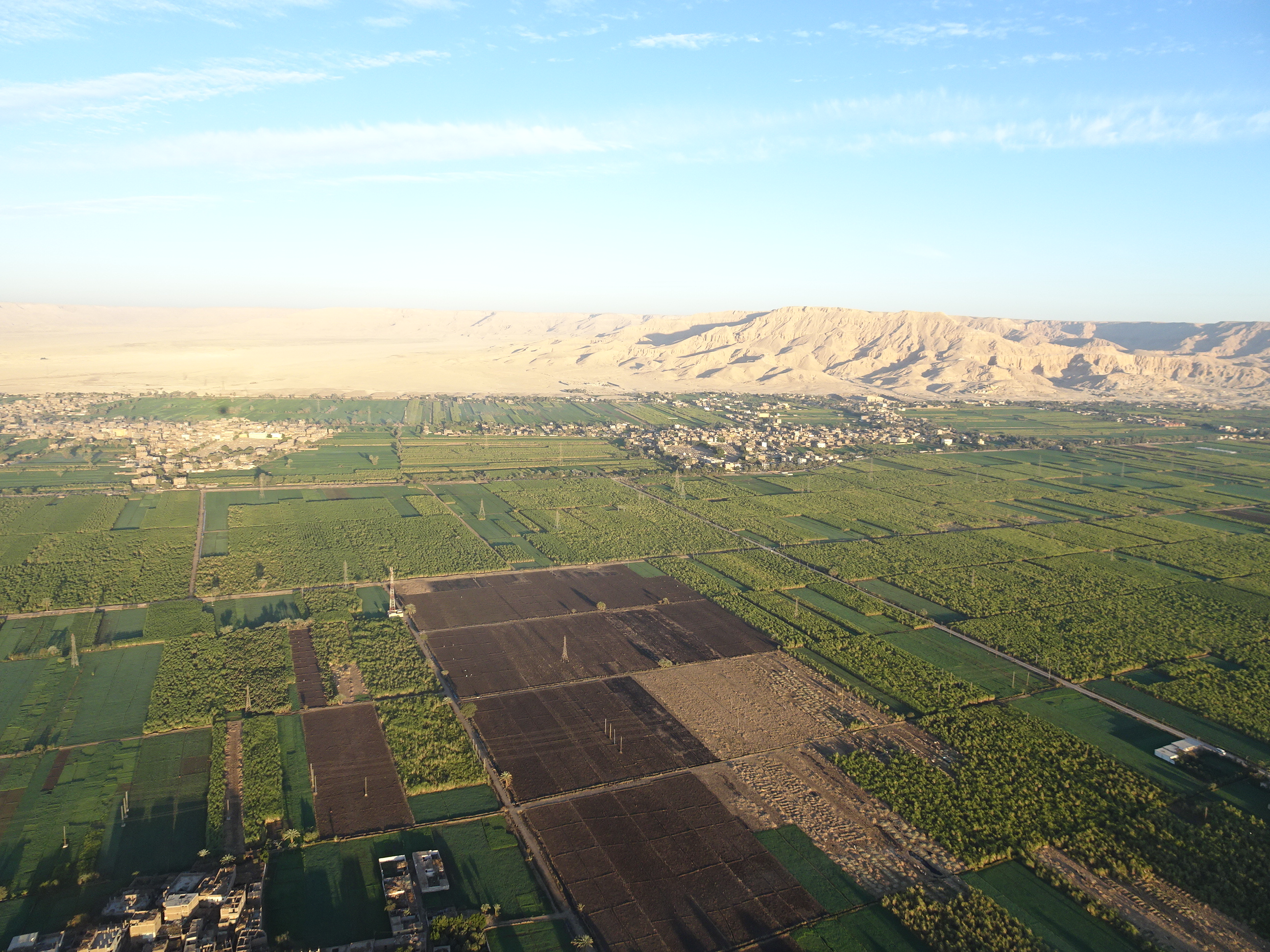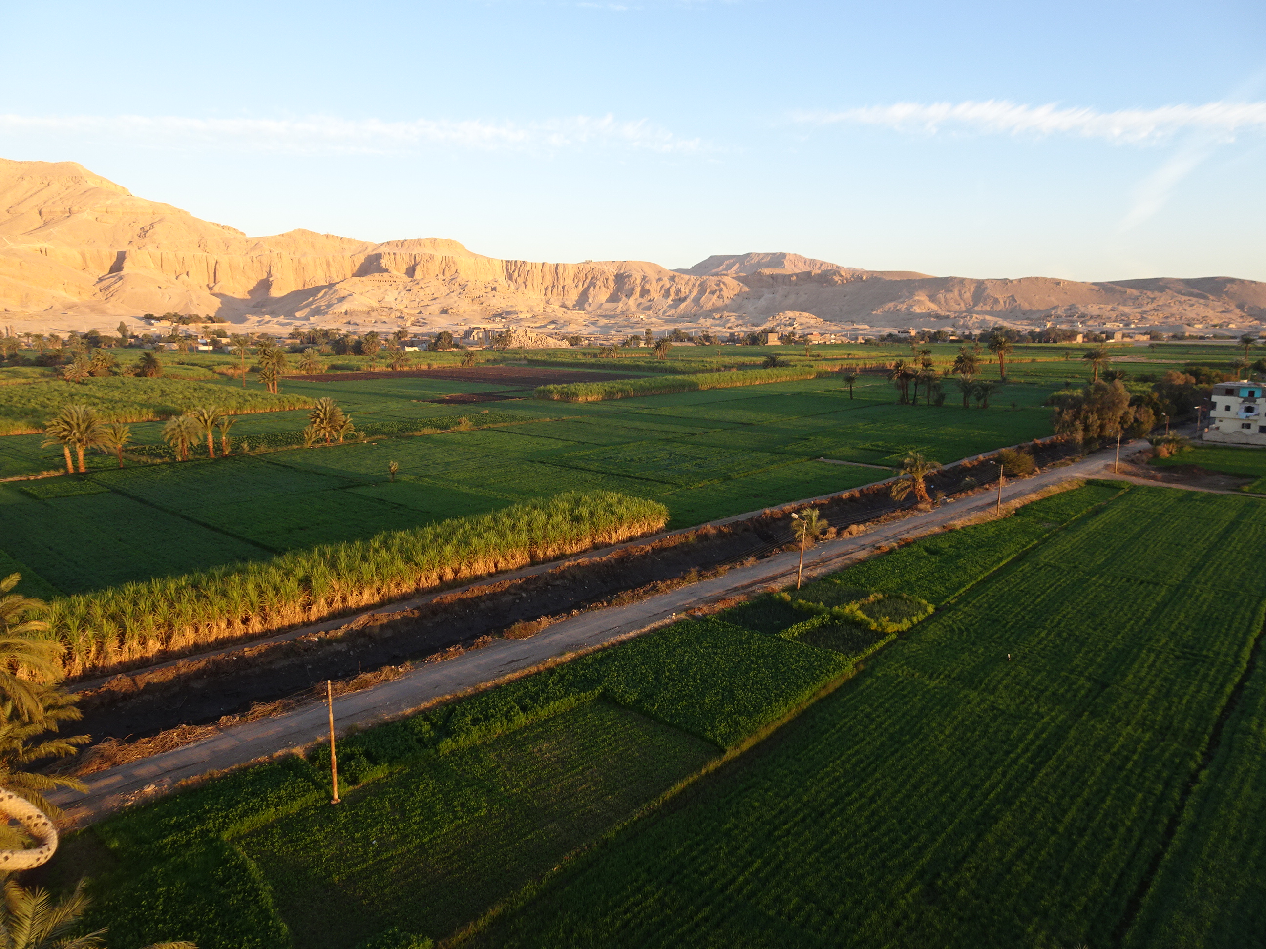 Am zburat întâi la joasă altitudine peste câmpurile agricole și destul de aproape de acoperișurile caselor. Valea Regilor se vede în depărtare.