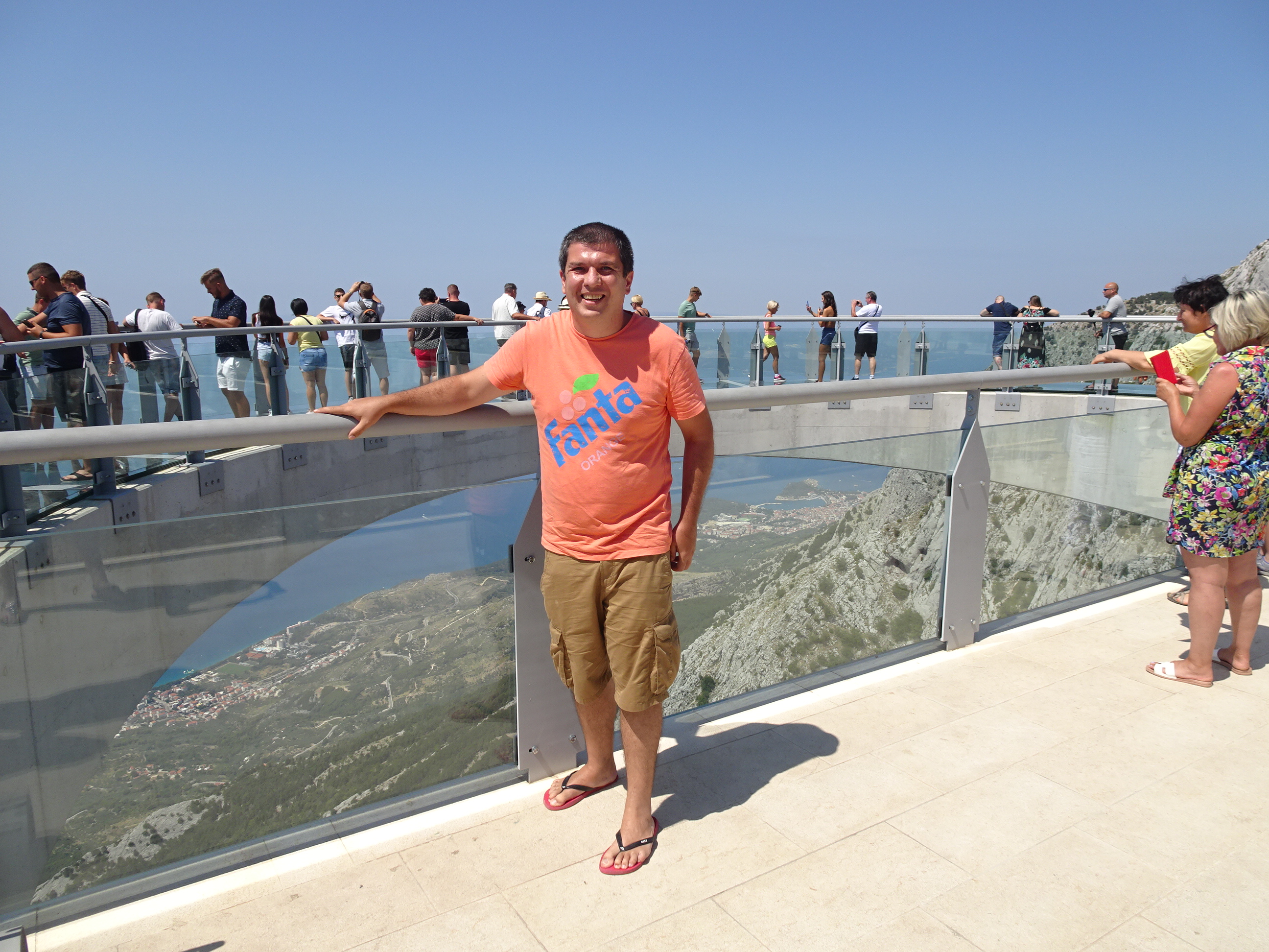 Era destul de aglomerat pe platforma de sticlă. Cred că numărul de vizitatori era mai mare de 50 (limita afișată). Partea mai grea era să mergi pe mijloc cu prăpastia de sute de metri în jos, pentru că mai toată lumea se agață de barele de protecție.