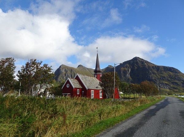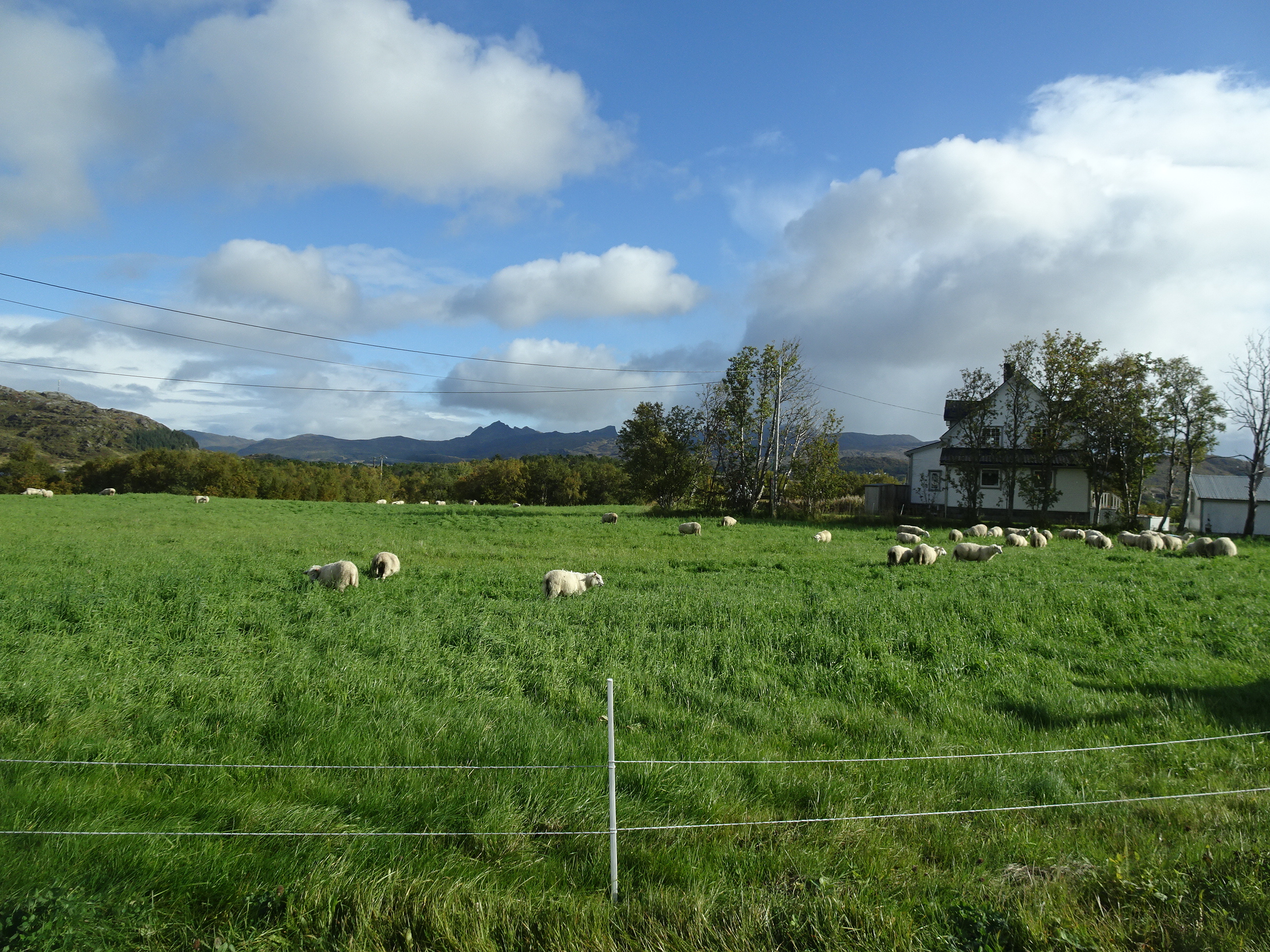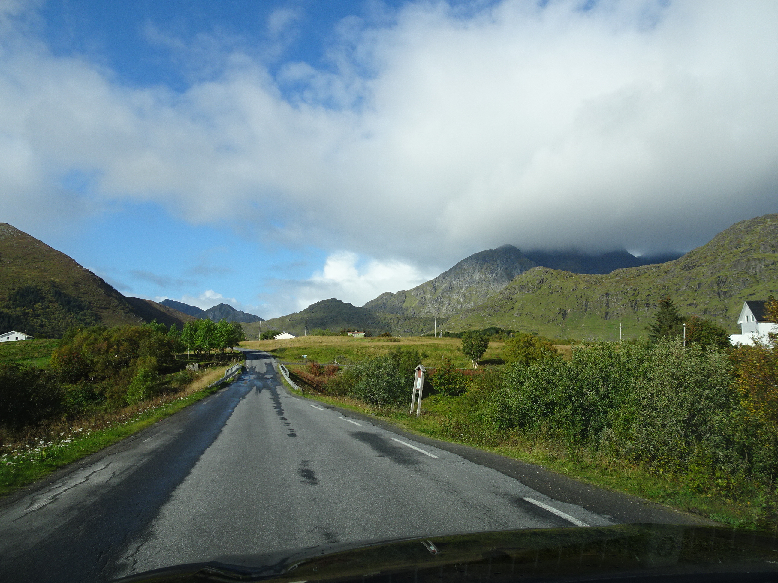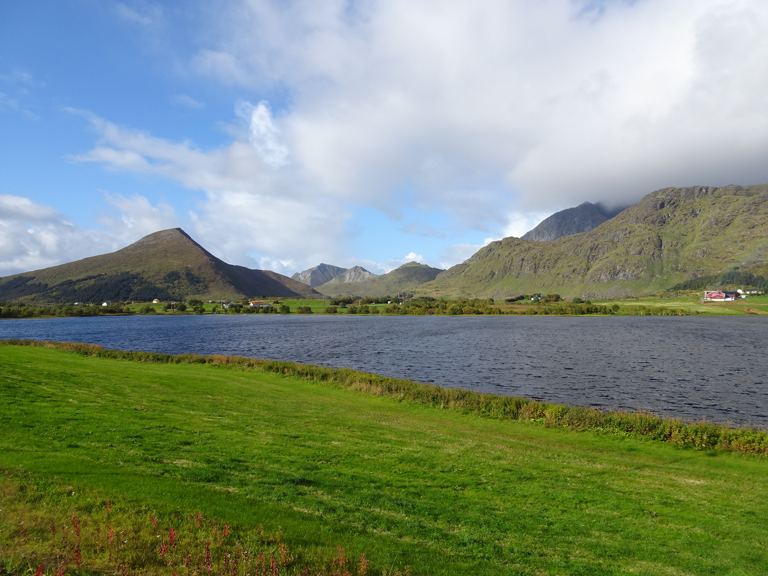 Ploile s-au rărit în a doua parte a zile. La soare, verdele pajiștilor și albastrul aprins al cerului din Lofoten creează contraste minunate.