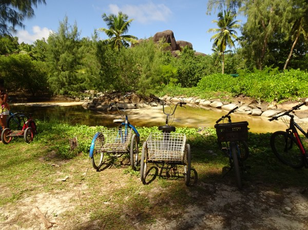 Pedalând pe străzile pitorești din La Digue. Pe insulă există doar câteva mașini, vreo 3 ale politiei, câteva ale hotelurilor și vreo 5 taxiuri. În rest, toată lumea se deplasează cu bicicletele sau pe jos.
