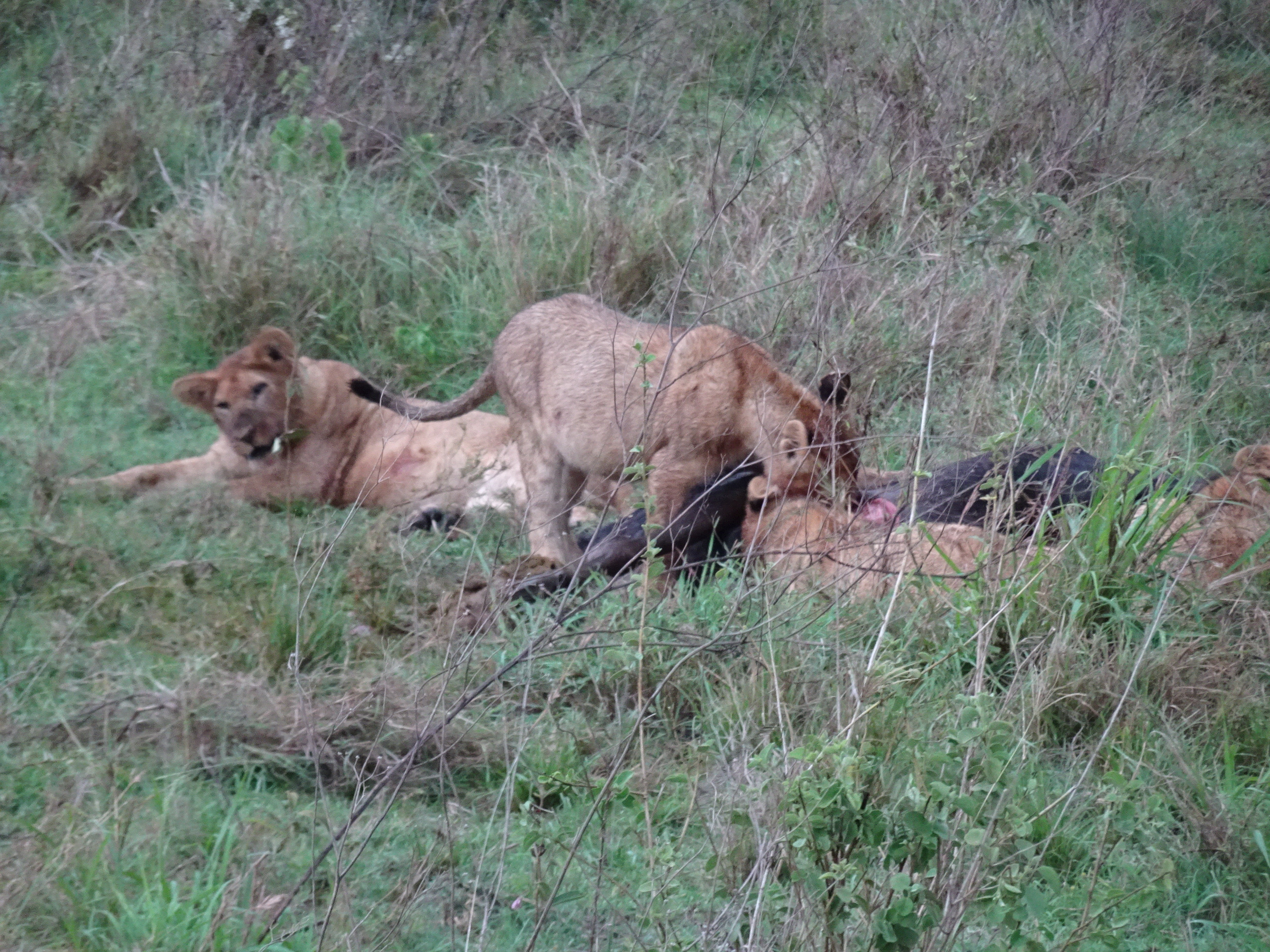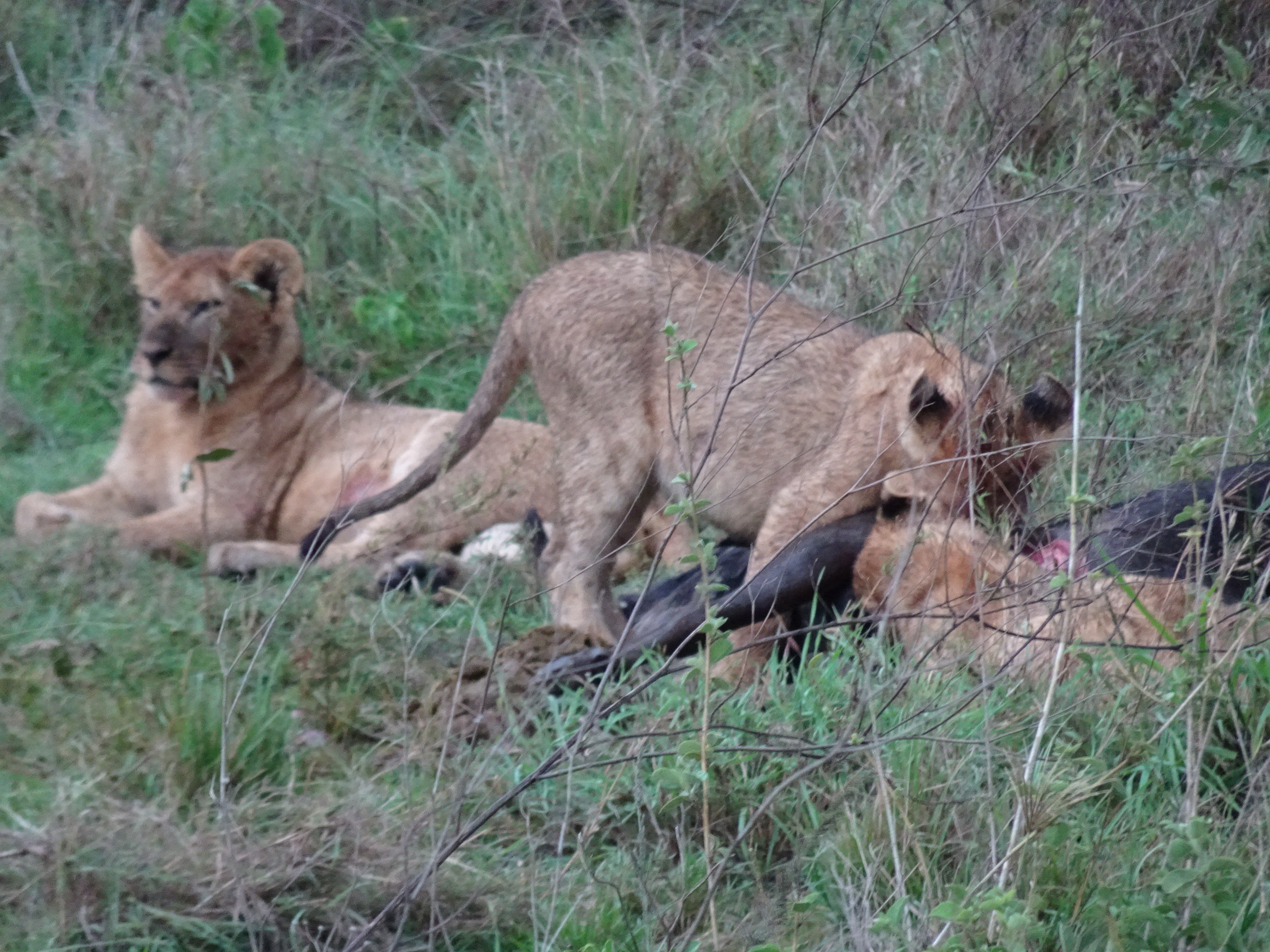 Masa de seara a puilor de lei: wildebeest proaspăt vânat de mama