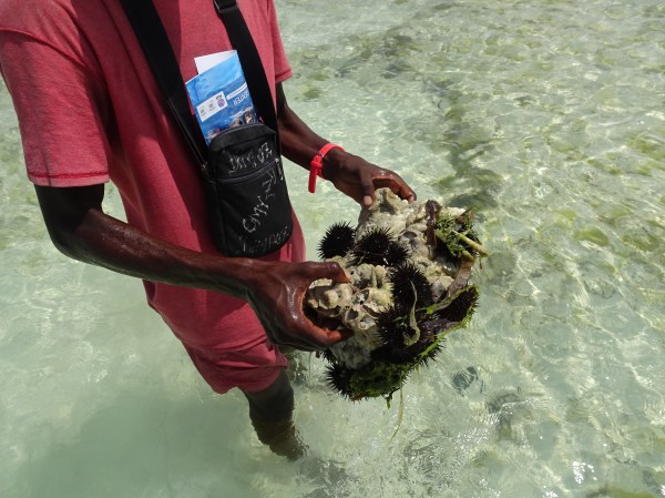 La câteva sute de metri de mal a început să apară fauna marină. Aici un arici de mare