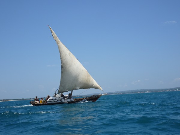 Pe mare – un dhow (barca tradițională) încărcat cu atât de multă marfă că nici nu știu cum plutea