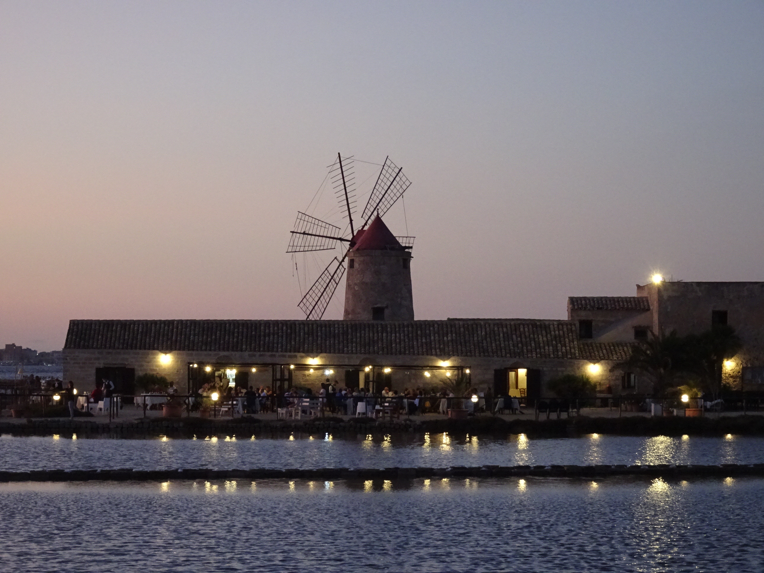 Mai pe seară am oprit la salinele de la sud de Trapani. Toată coastă de vest este renumită pentru producția de sare, iar pe lângă bazinele de decantare întinse pot fi zărite și o mulțime de mori de vânt.