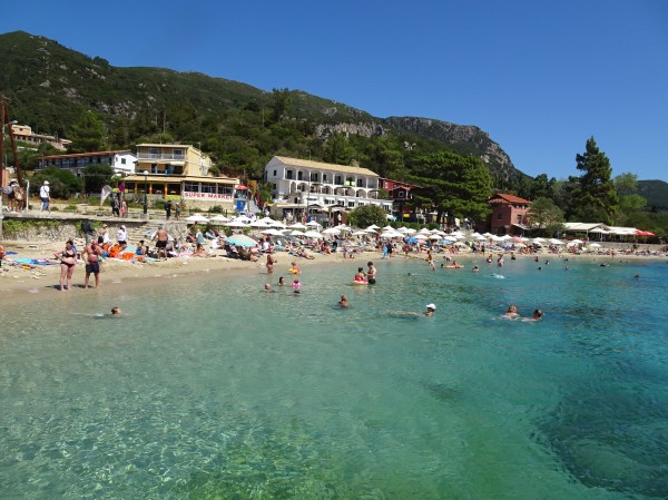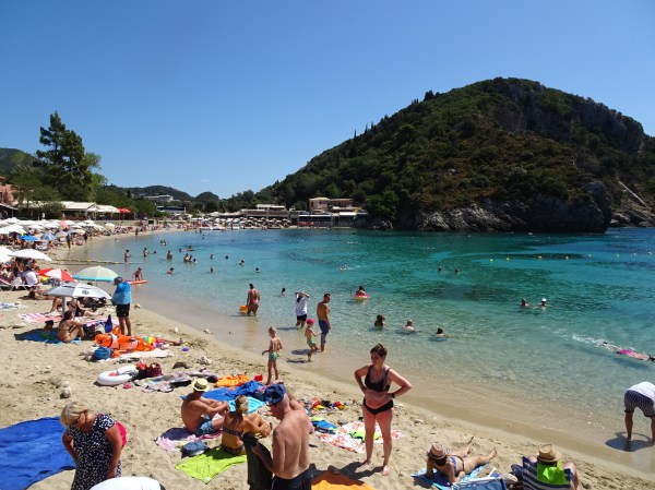 Mai departe am coborât pe plaja din Paleokastritsa. Aceasta este, zic eu, cea mai frumoasă plajă din Corfu. Problema este că este mereu aglomerată. Era mult prea multă înghesuială să rămânem și am decis să mergem în unul din golfurile alăturate (unde sunt alte plaje grozave, dar multe mai libere)