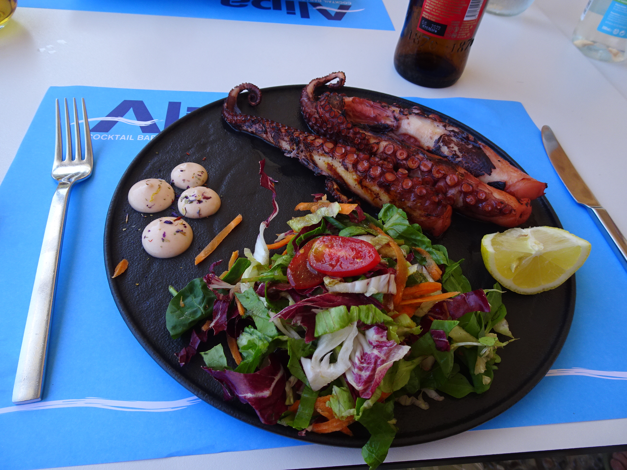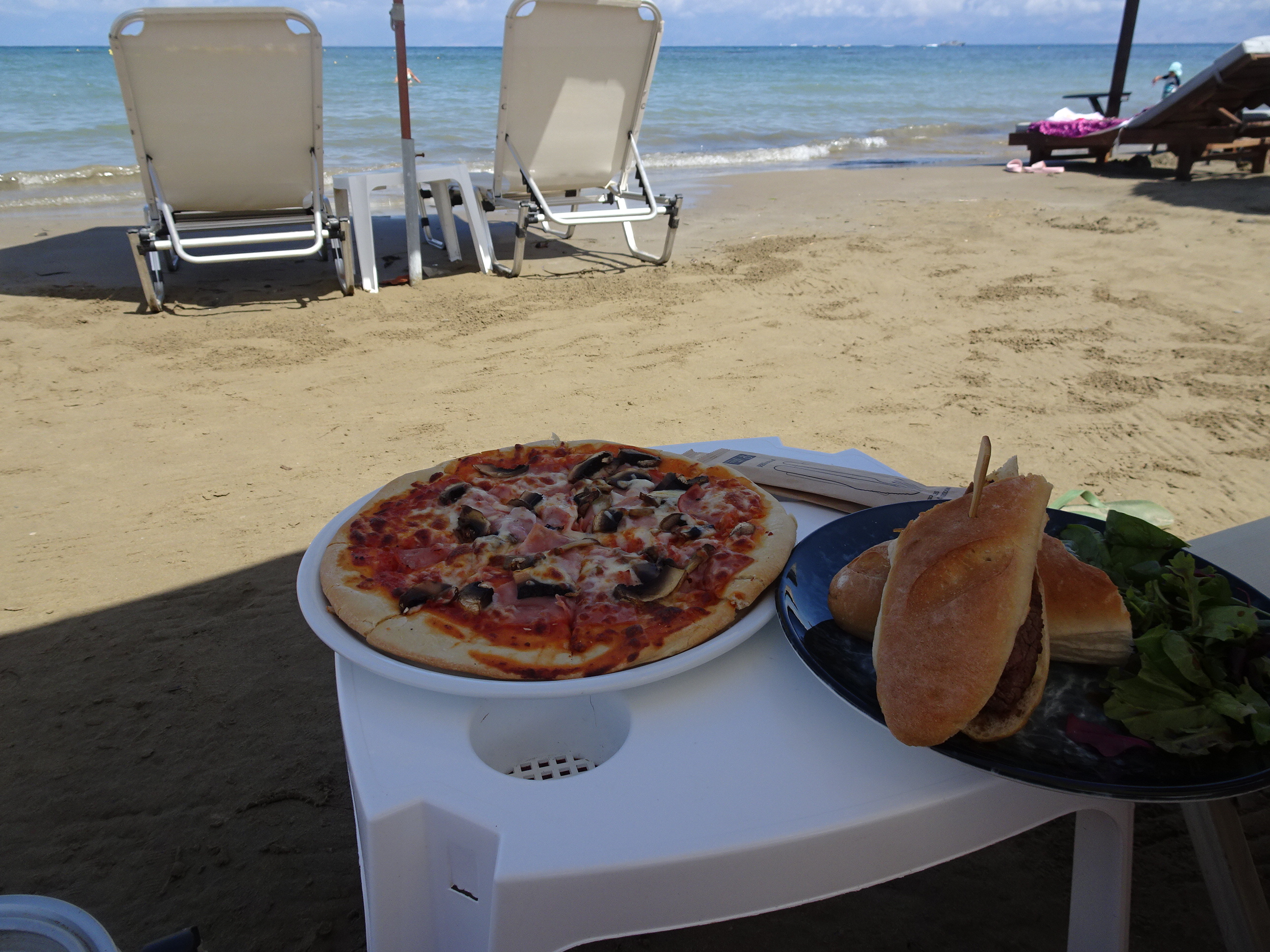 Șezlongurile la Sidari sunt în general gratuite. Fiecare tine de un bar și se așteaptă în schimb să faci consumație. Numai bine, că prânzul l-am servit chiar de pe șezlong.