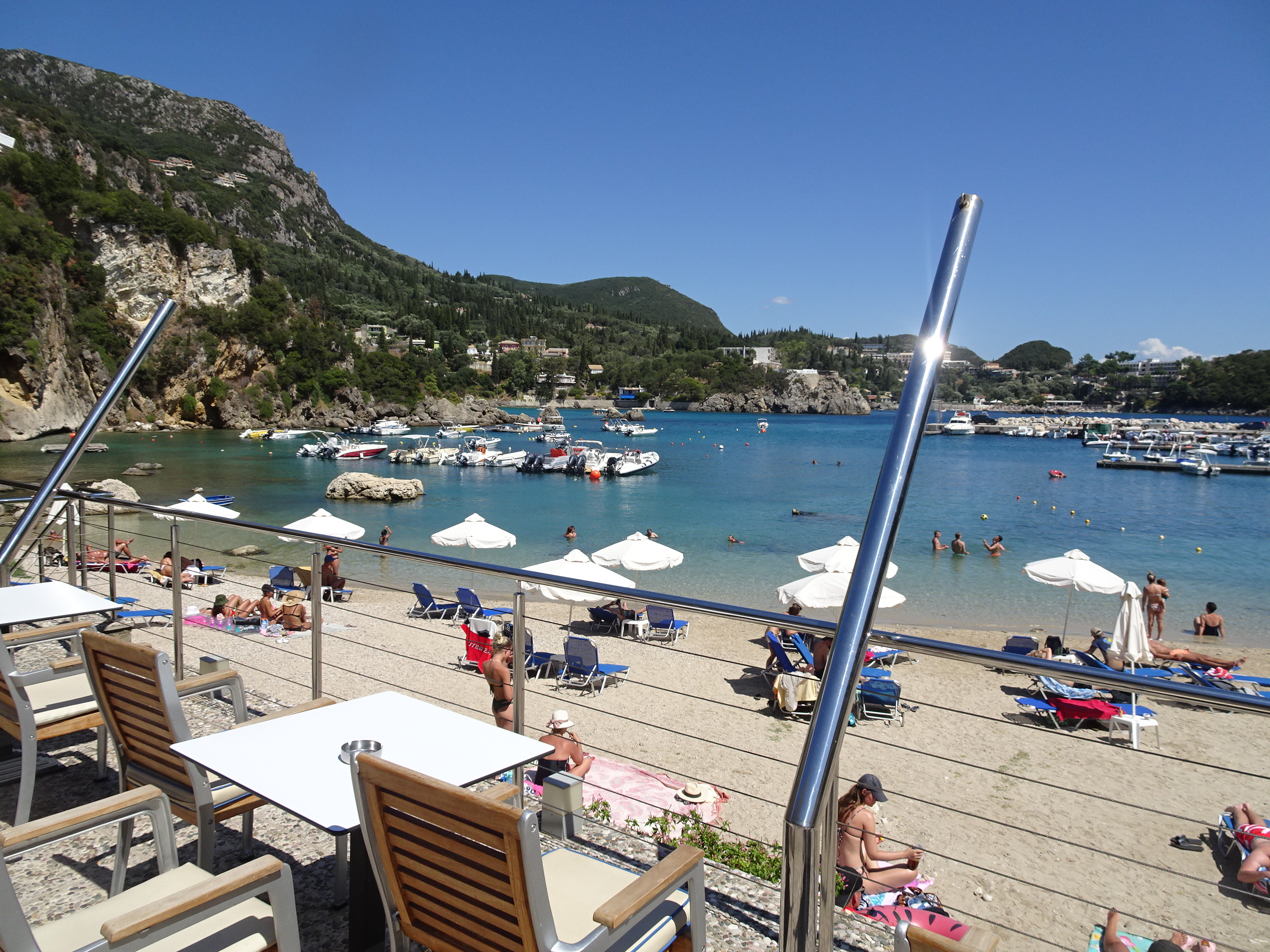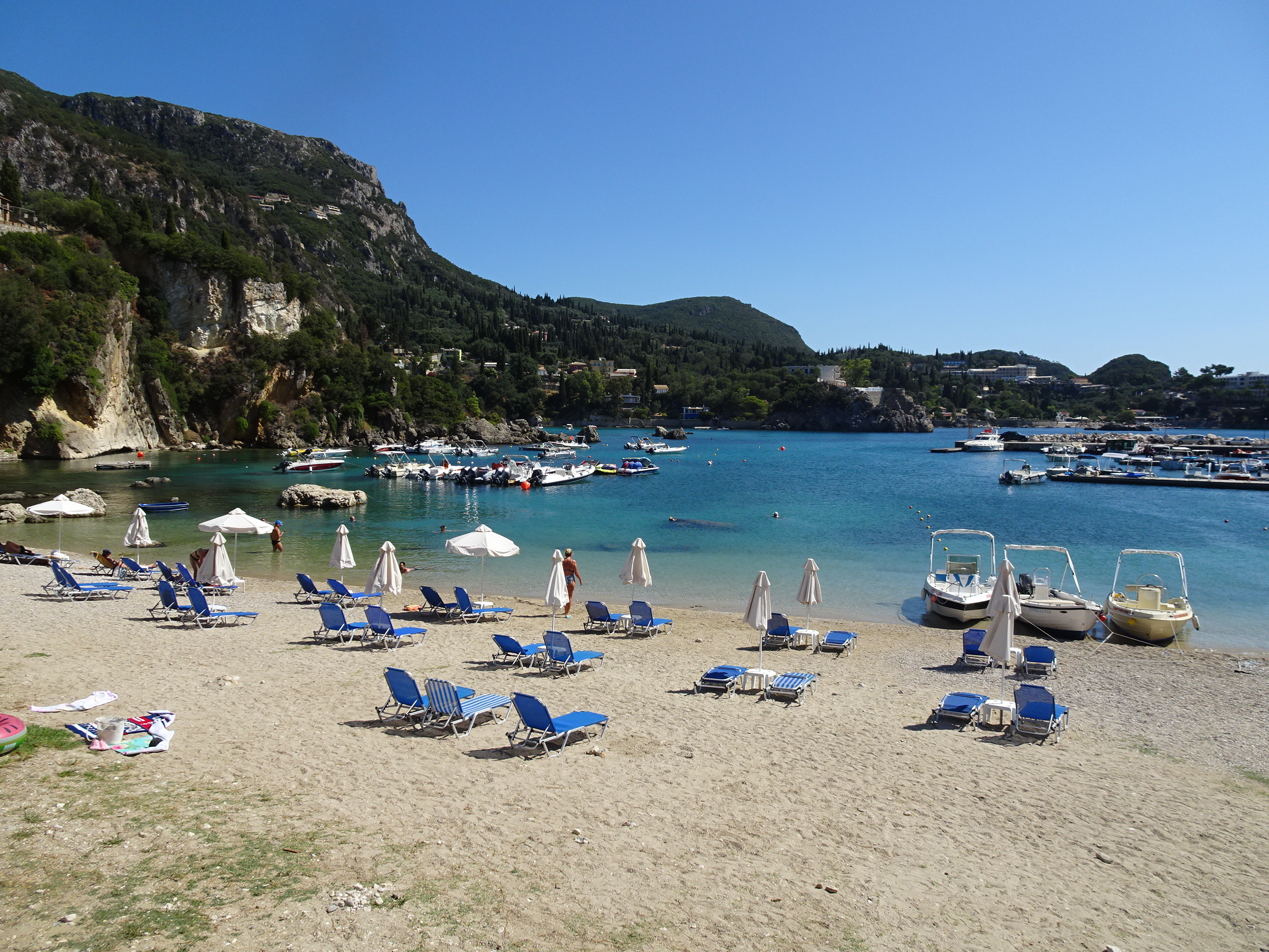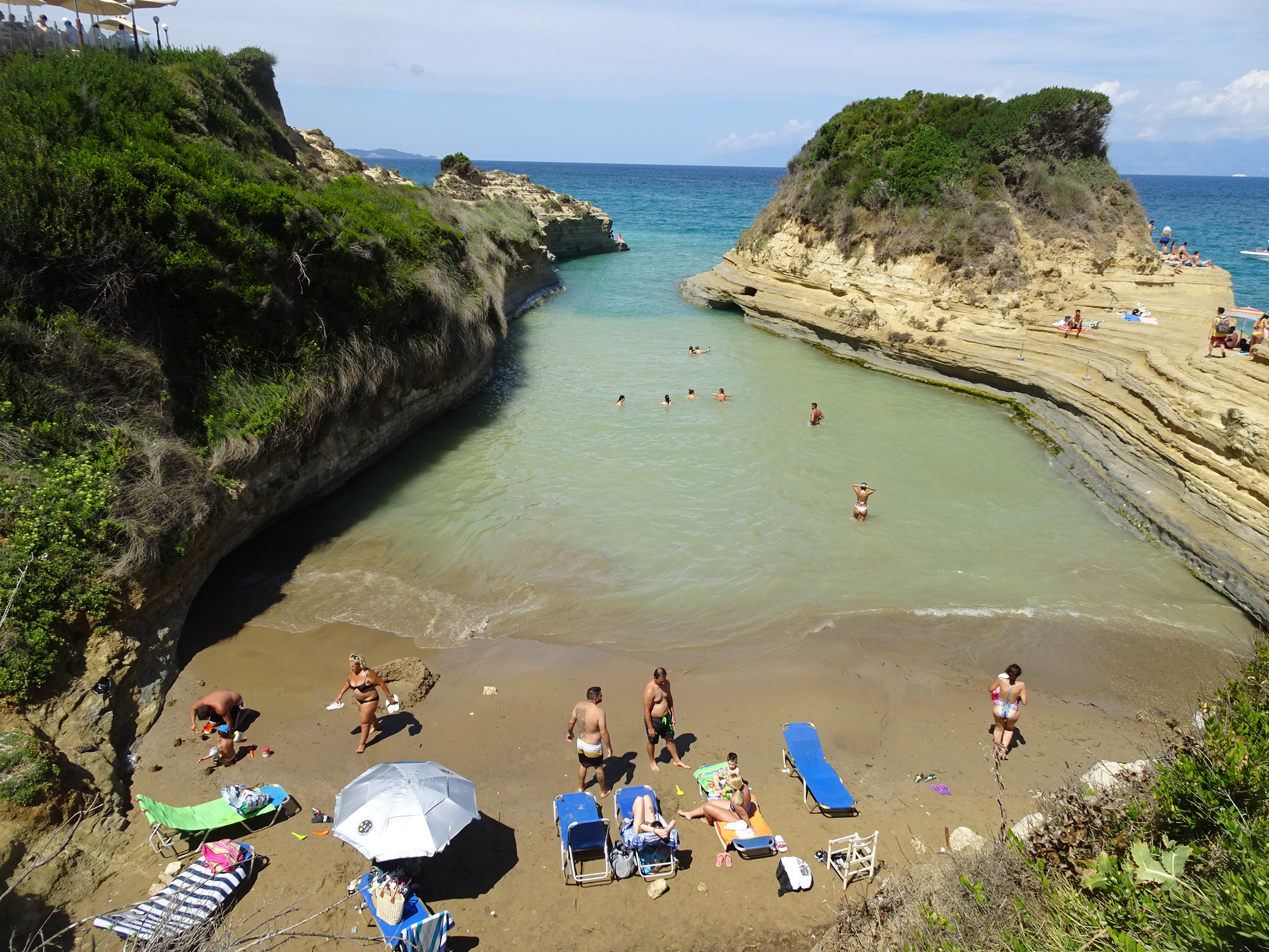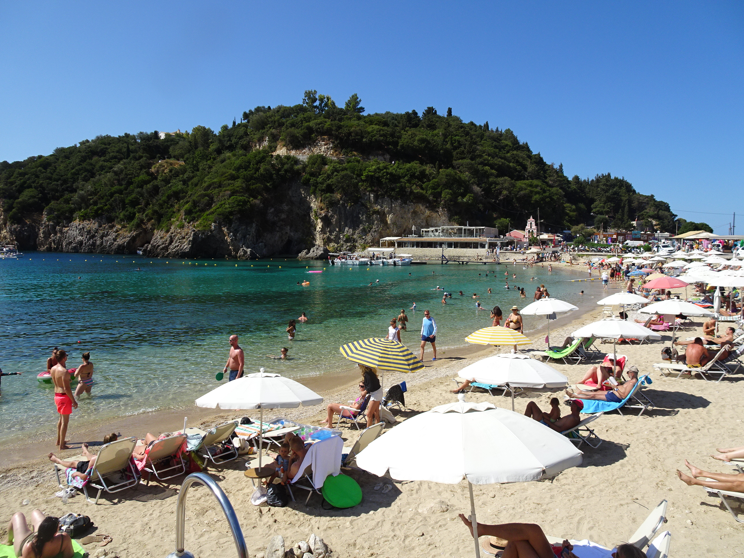 Mai departe am coborât pe plaja din Paleokastritsa. Aceasta este, zic eu, cea mai frumoasă plajă din Corfu. Problema este că este mereu aglomerată. Era mult prea multă înghesuială să rămânem și am decis să mergem în unul din golfurile alăturate (unde sunt alte plaje grozave, dar multe mai libere)