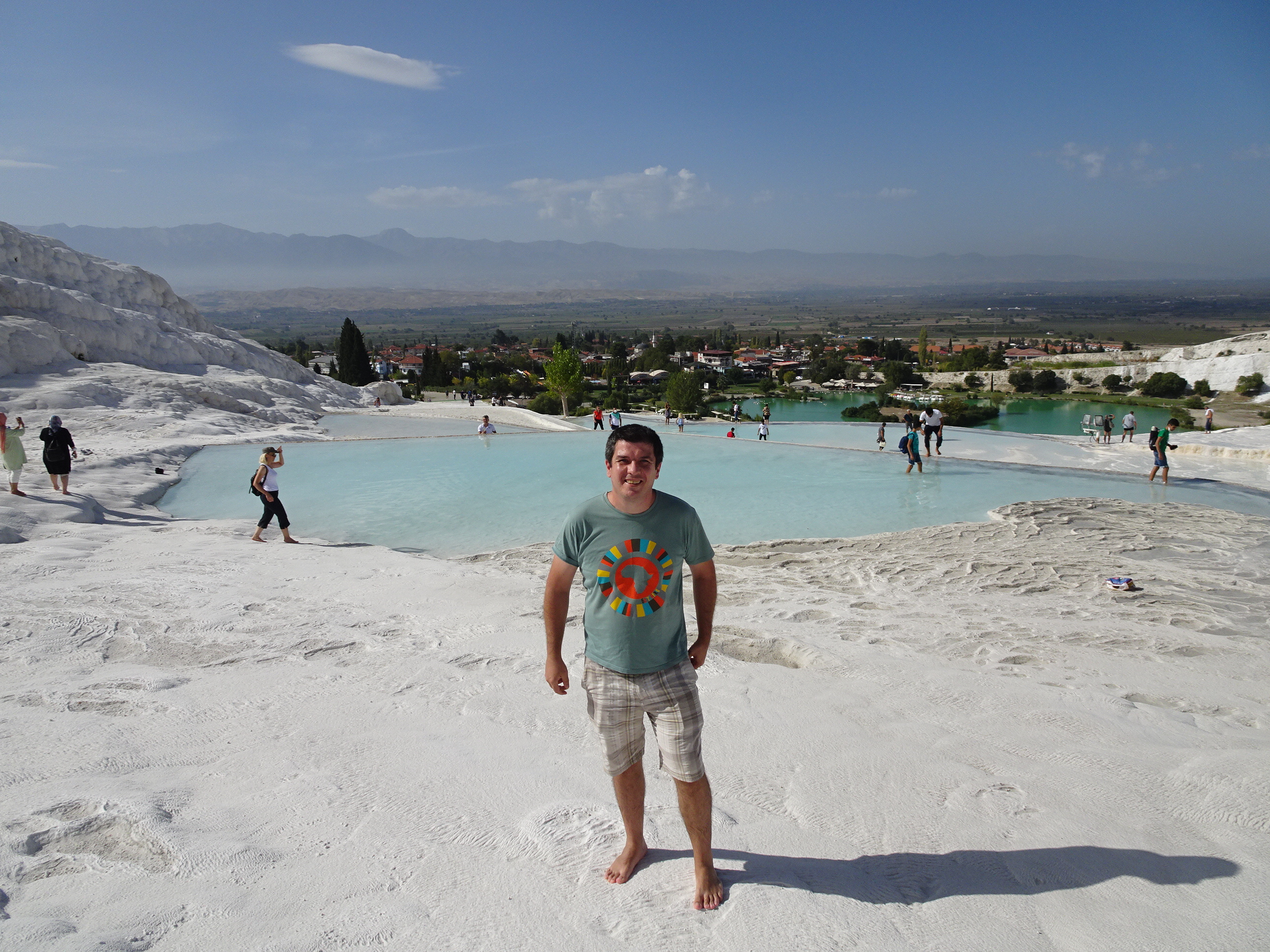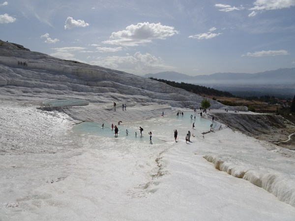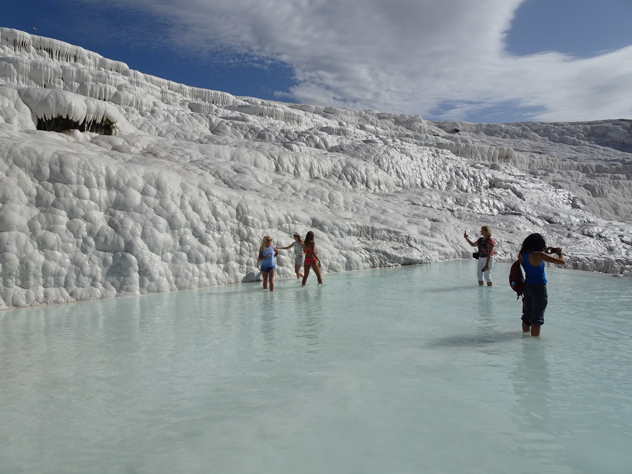 O dată sosit la Pamukkale, vederea muntelui alb te impresionează pe loc. Pamukkale înseamnă în traducere Castelul de Bumbac. Terasele albe au fost formate peste secole de izvoarele termale unice ce ies la suprafață acolo. Mineralele aduse de apa caldă s-au depus formând piscine naturale și această minunăție care face parte din patrimoniul mondial.