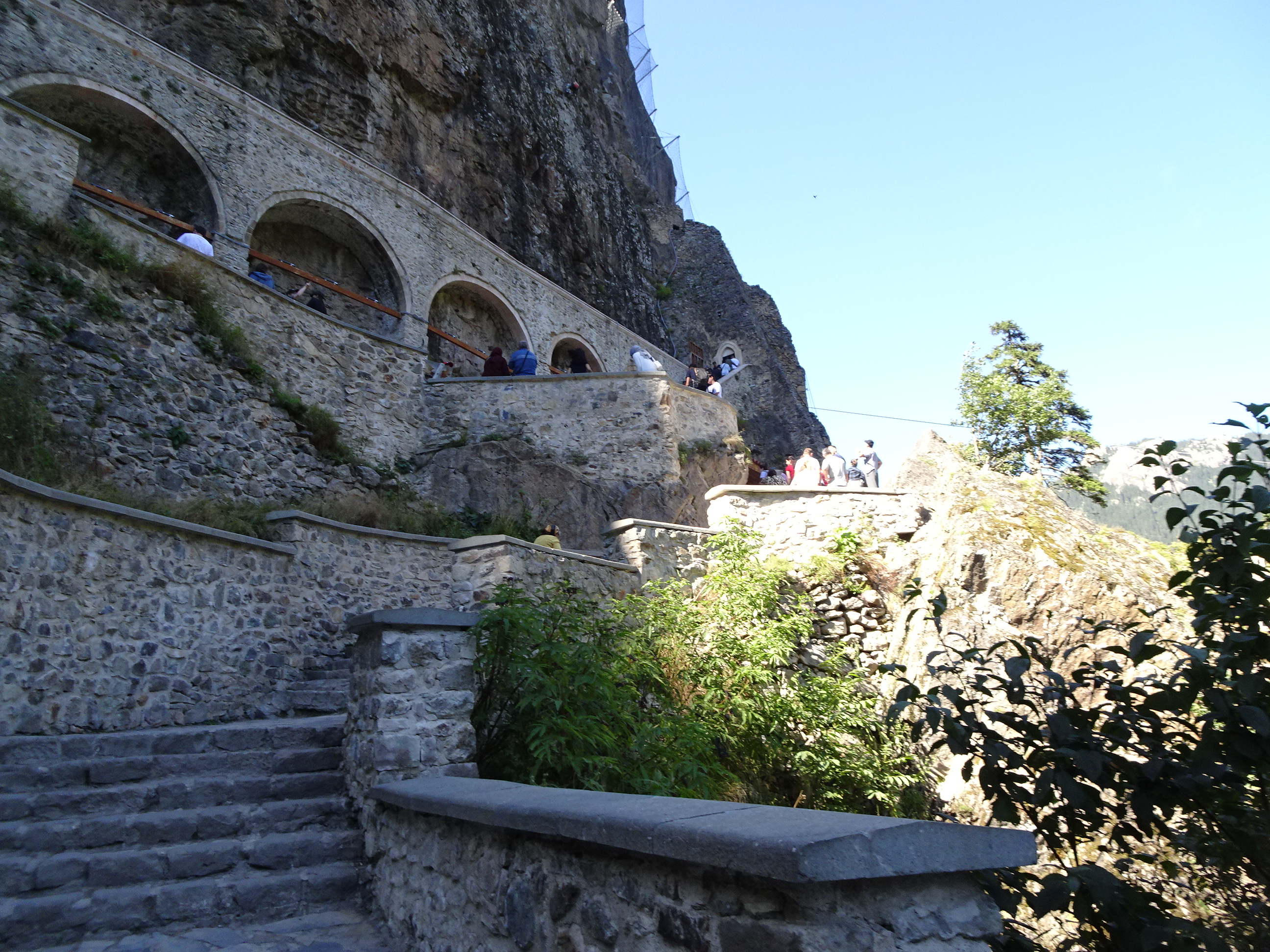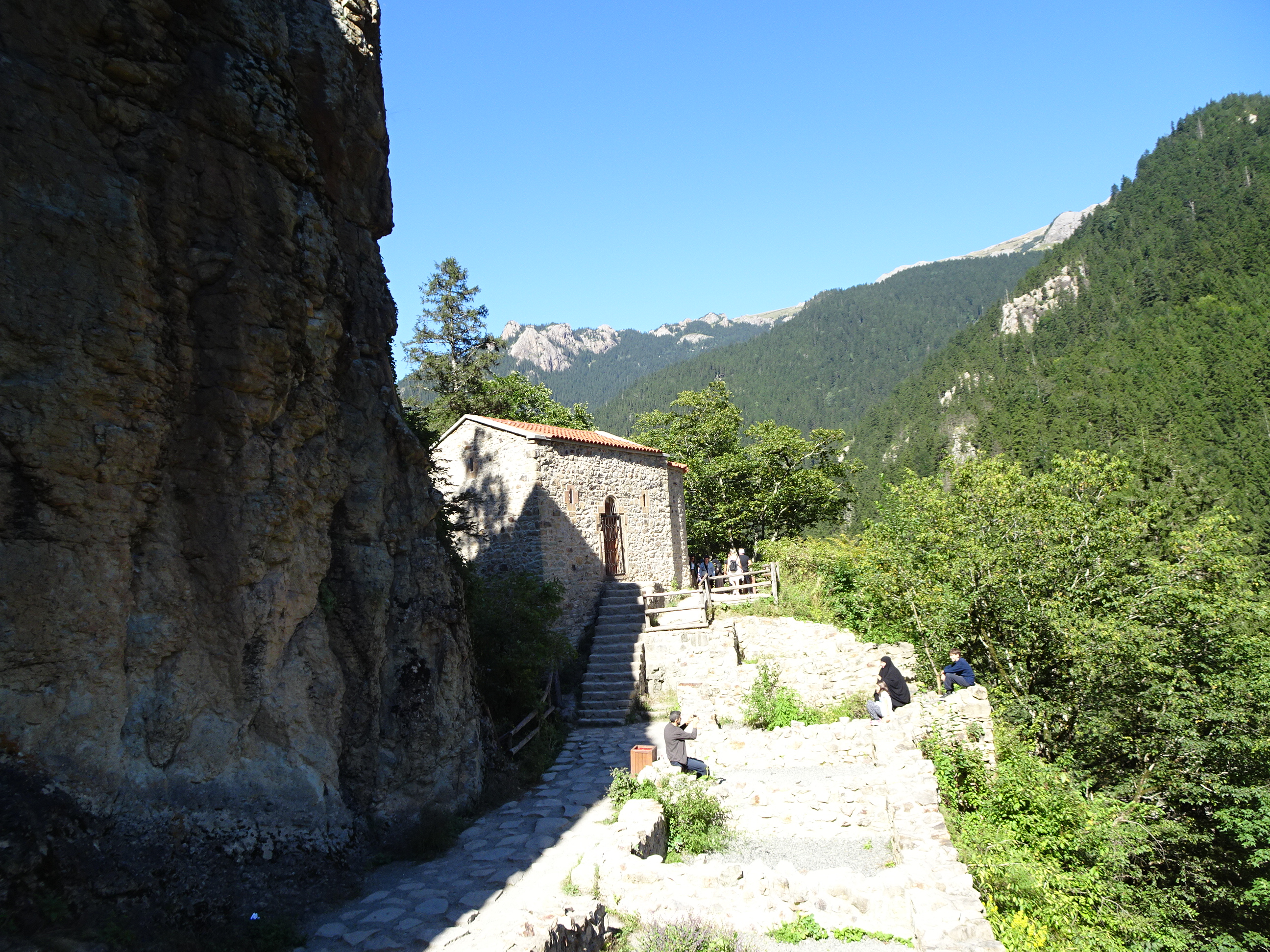 Din curtea bisericii se vede frumos valea și stâncile de la Sumela