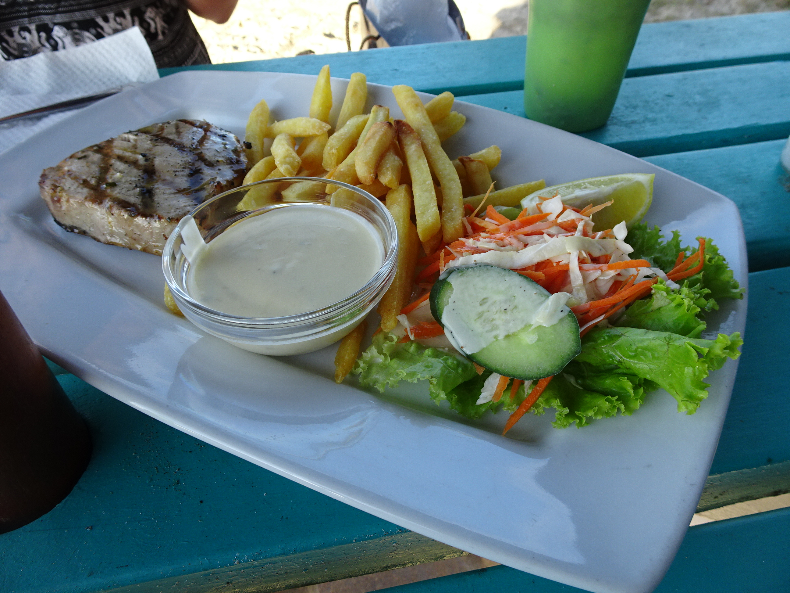 Noi am preferat să încercăm restaurantele locale. Nu sunt multe, cel mai apropiat restaurant mai deosebit era la 5 kilometri de noi în golful din Grande Baie.