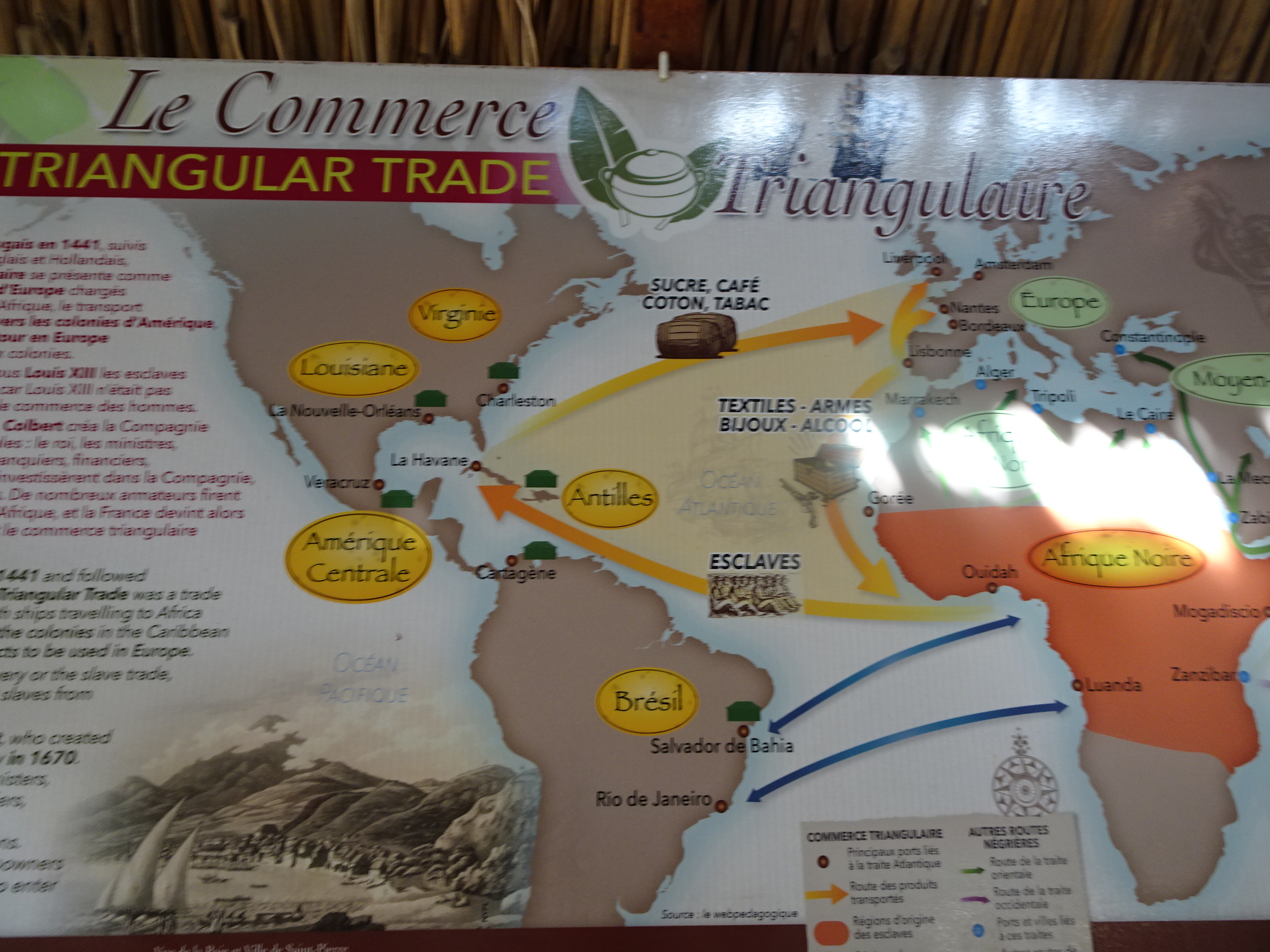 Acesta este triunghiul comerțului cu Lumea Nouă. Europenii duceau bunuri și arme în Africa centrală pentru a cumpăra la schimb sclavi, aceștia erau duși pe vapoare spre Americi pentru ca apoi vasele să se întoarcă pe continent pline de bunuri scumpe precum zahăr, cafea, tutun sau bumbac.