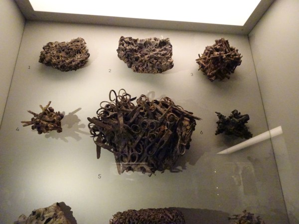 Cea mai tulburătoare vitrină: așa au fost transformate de lavă obiecte de metal precum foarfeci, cuie sau șuruburi.