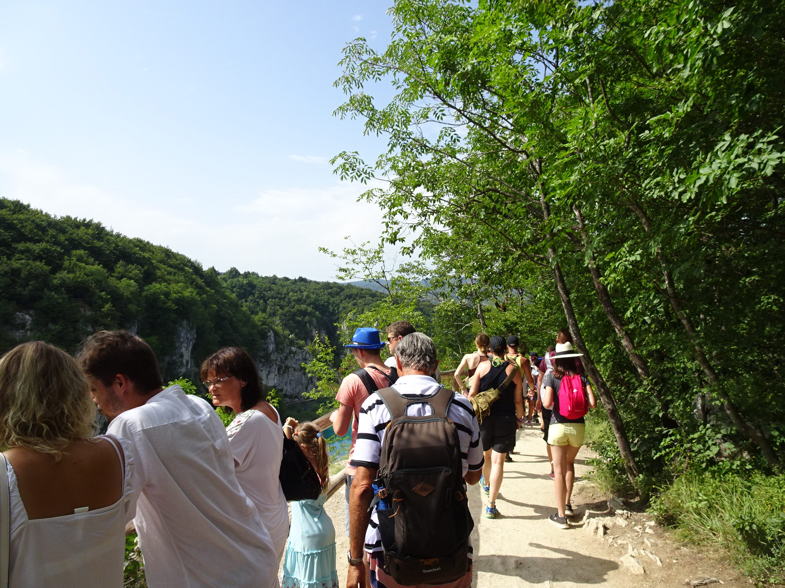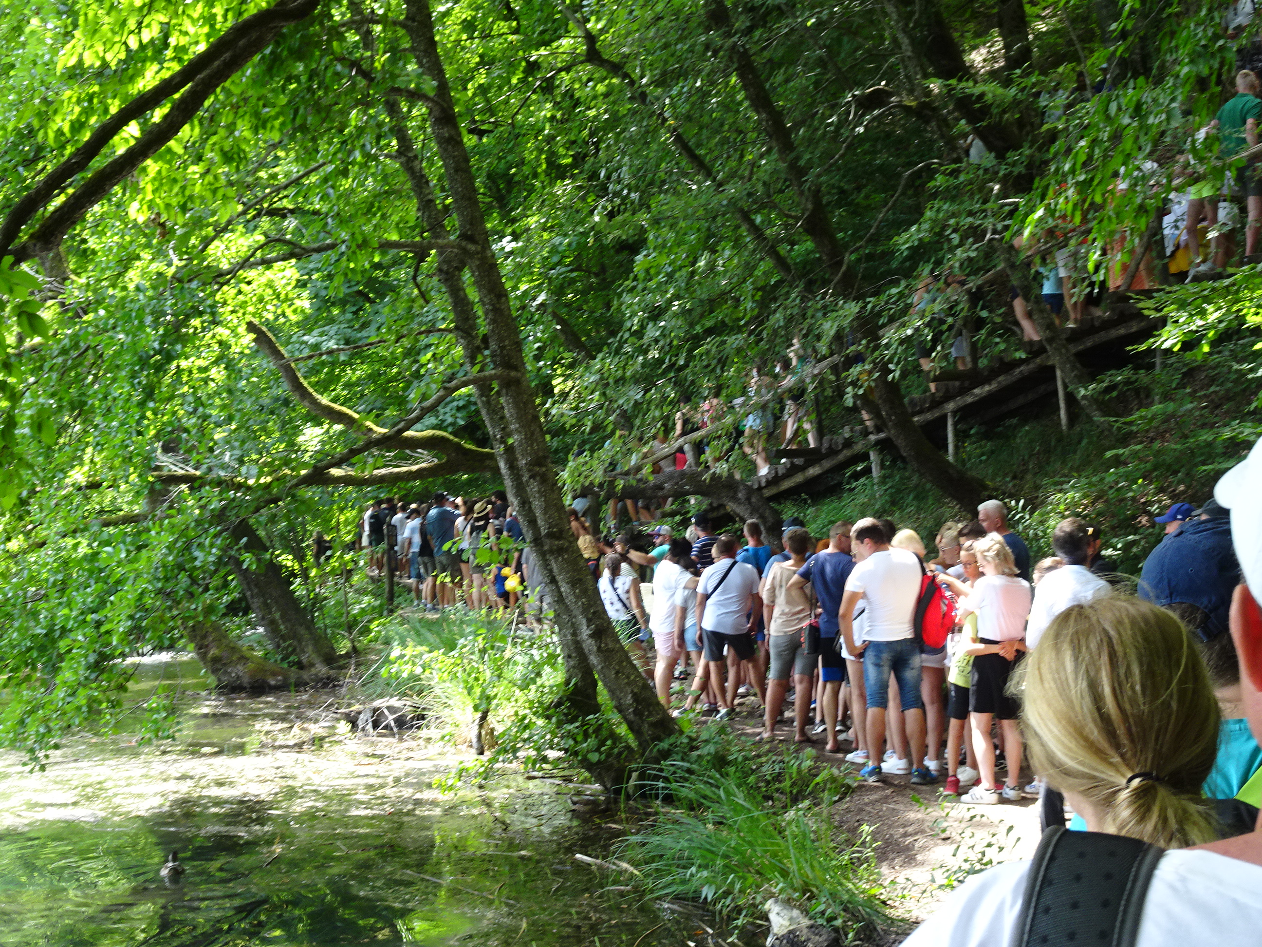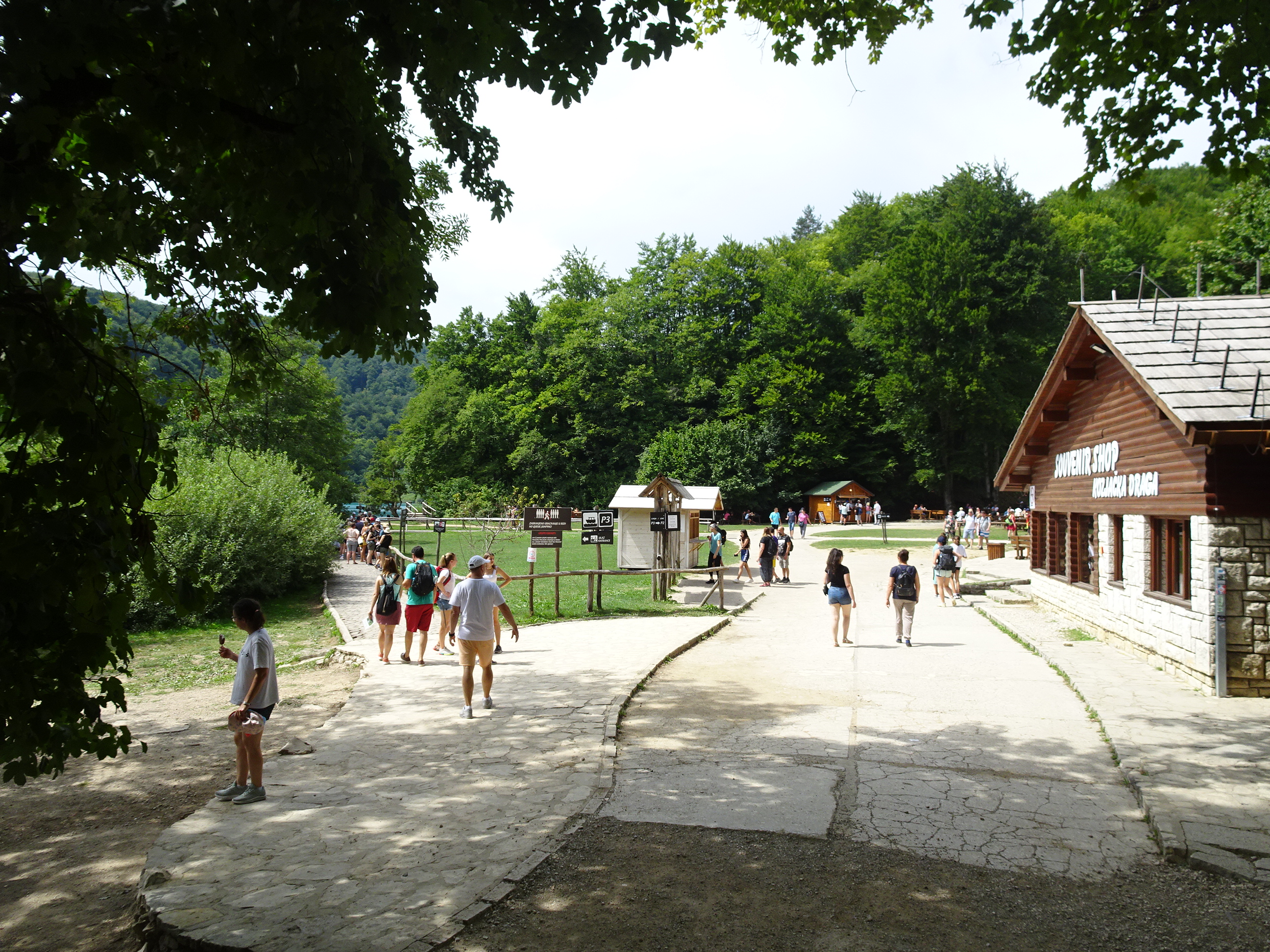 La intrare era aglomerație mare. Multă lume venise fără rezervare și au aflat la fața locului că nu există bilete disponibile. Noi, având rezervarea făcută, am intrat imediat fără probleme. Recomandare: obligatoriu în sezonul de vară biletele la Plitvice trebuie cumpărate cu 1-2 săptămâni în avans pentru a evita surprizele neplăcute. Biletele includ ora exactă de intrare dar și poarta de acces.