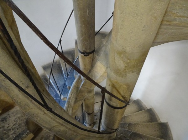 Urcarea în turn nu e treabă ușoară, sunt câteva sute de scări. Acestea sunt construite în spirală dublă, cu un sens pentru urcare și altul la coborâre.