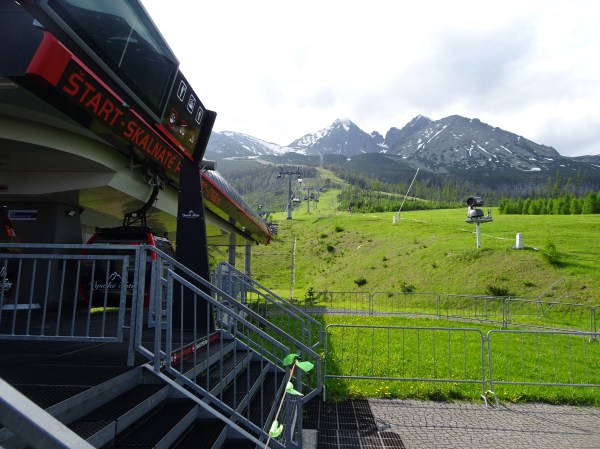 La prima oprire doar am schimbat cabinele. Gondolele de aici sunt mai mari și fac 12 minute până la Skalnate Pleso la 1751 de metri.