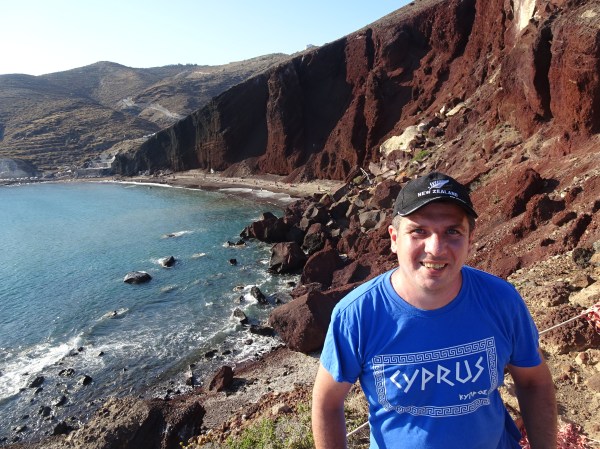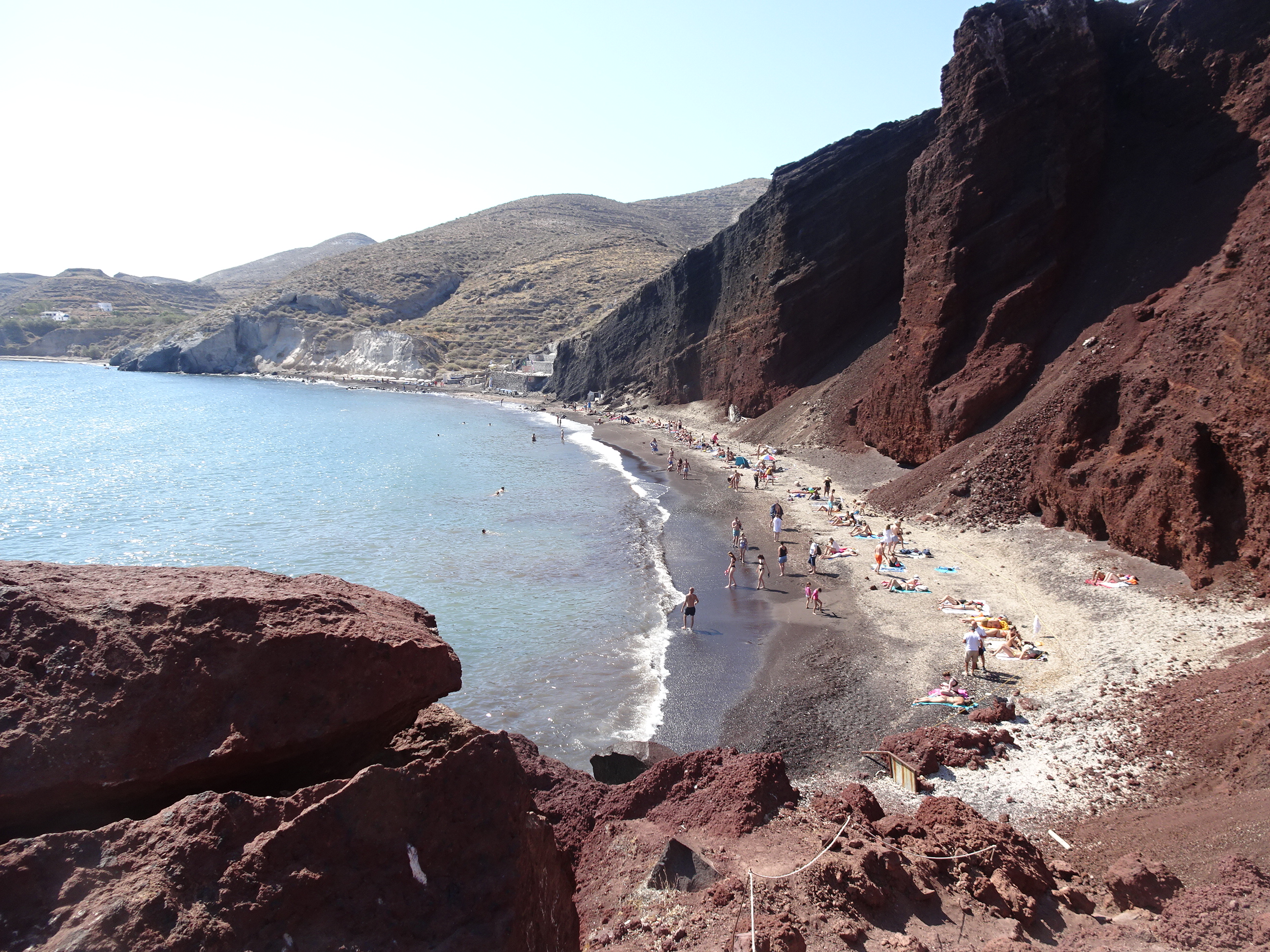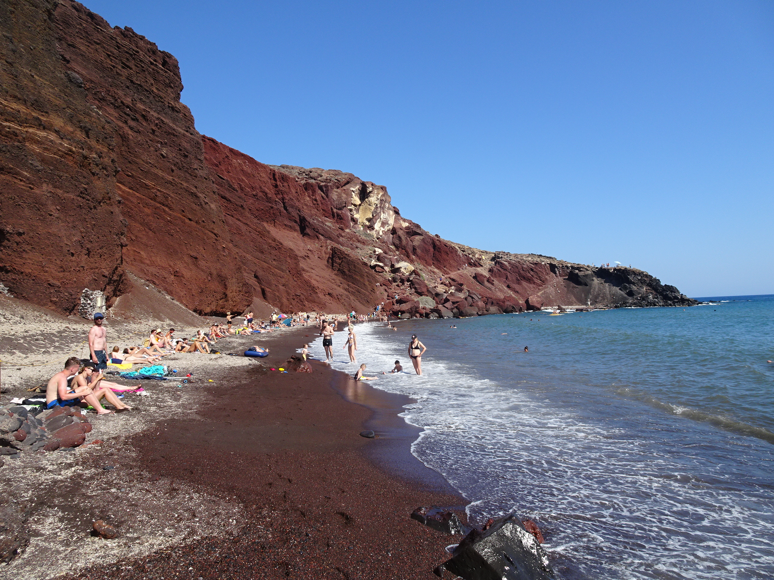 Problema cu Red Beach este că este foarte mică și cu greu se poate găsi loc să te așezi, mai ales că accesul este interzis în zona apropiată de peretele de stâncă unde pot cădea pietre.