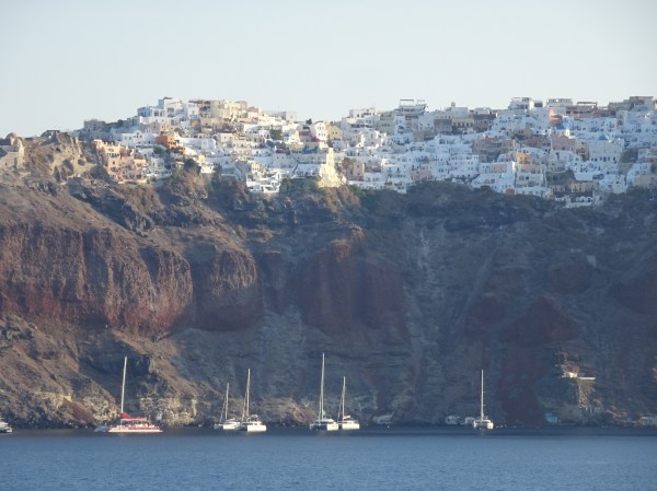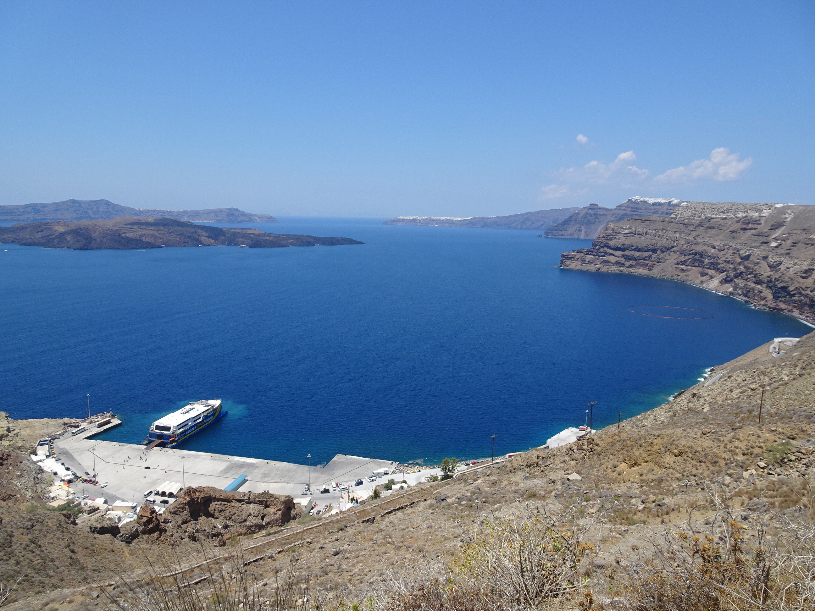Vederea peste portul maritim din Santorini