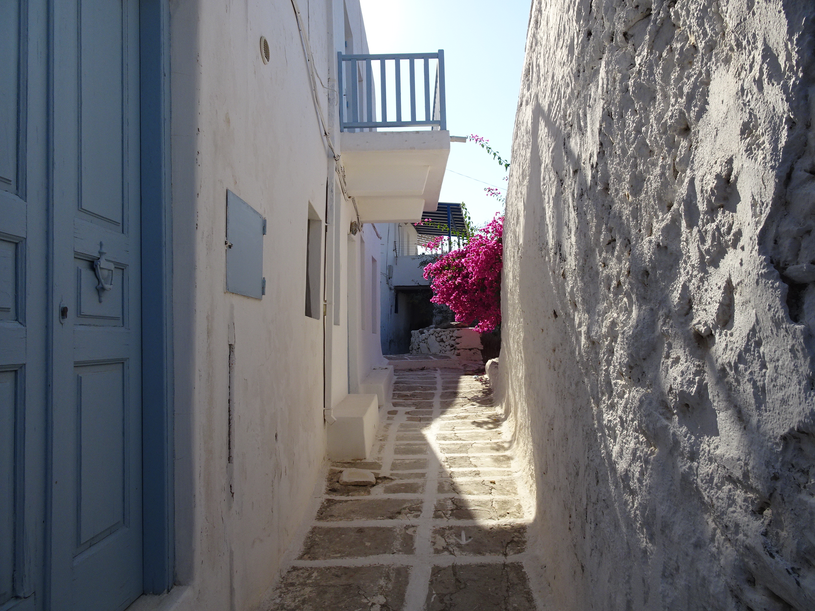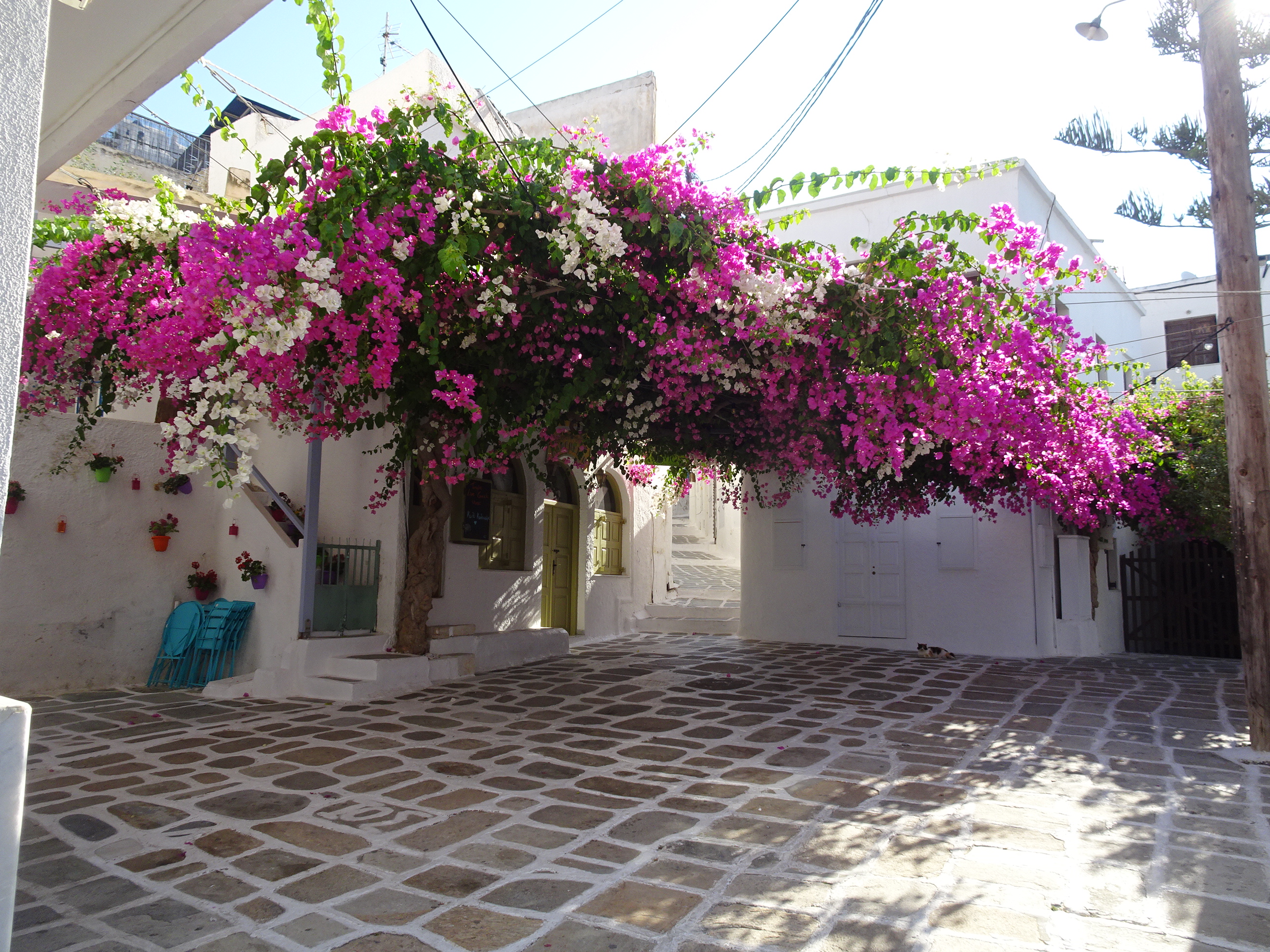 Chora este un labirint întortocheat de străduțe printre case albe cu ferestre albastre și o mulțime de flori multicolore.