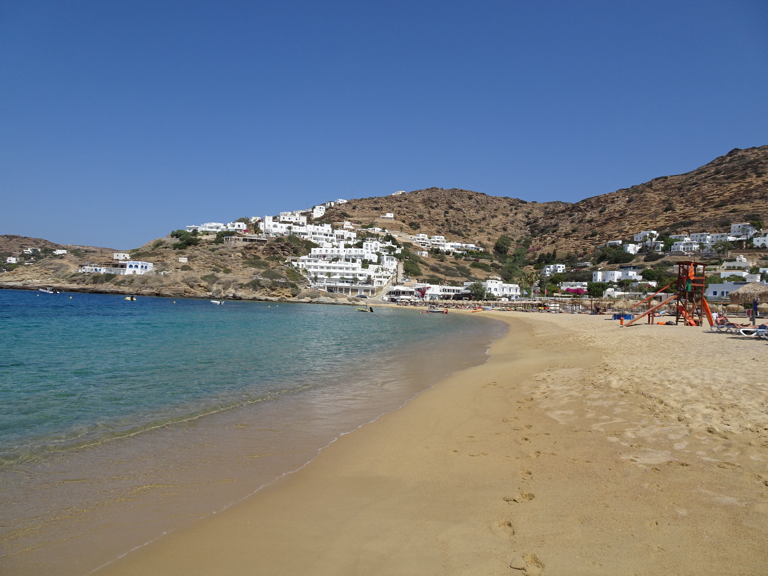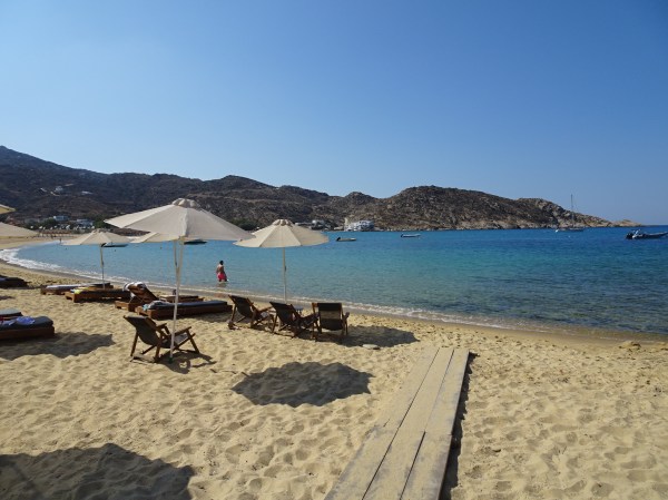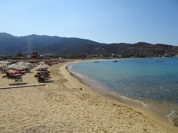 Plaja Milopotas era aproape goală când am fost acolo. Mai mult, șezlongurile erau gratuite (se aștepta doar consumație de la bar)