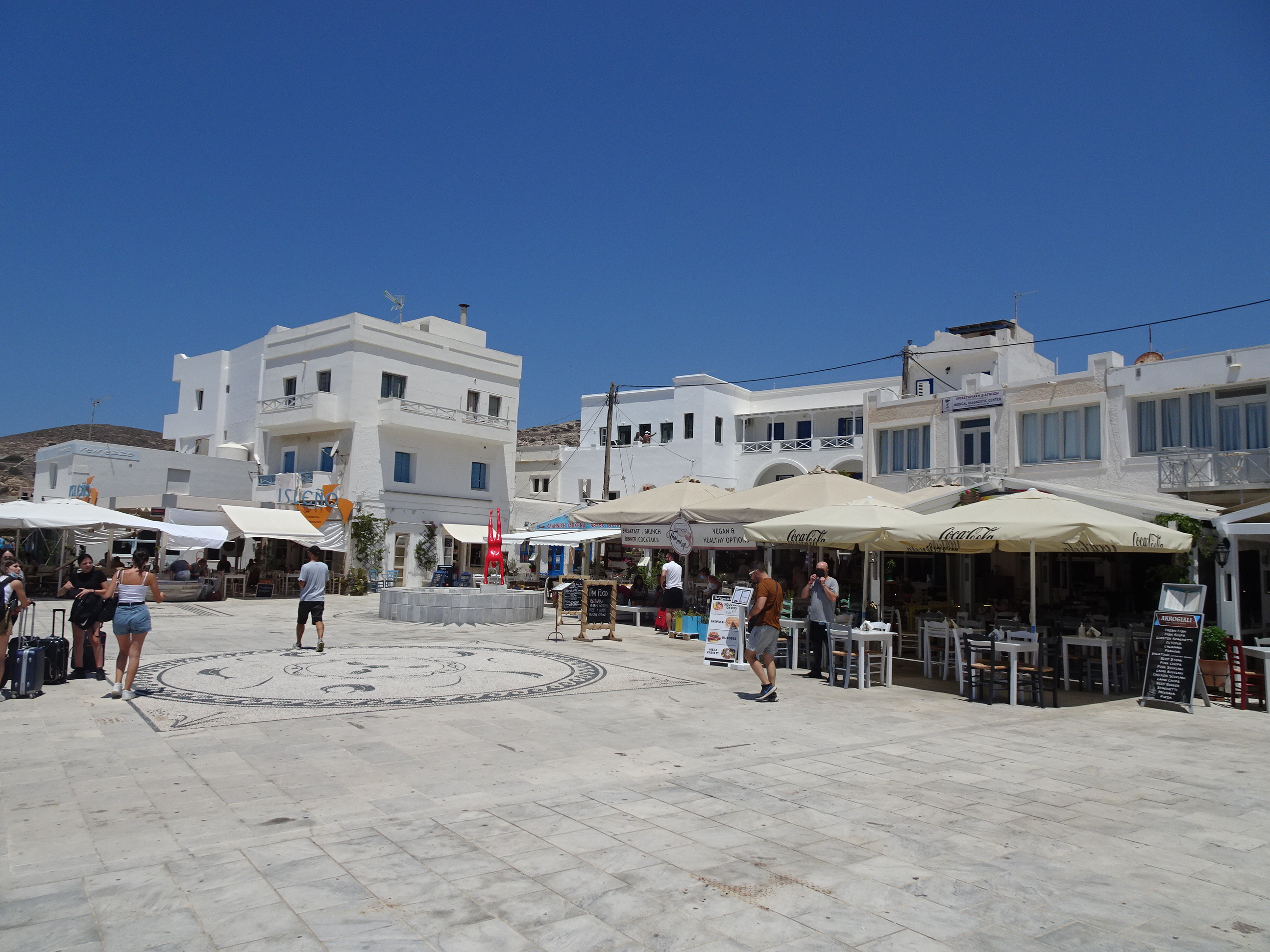 Portul din Ios e un loc și el pitoresc. Sunt o mulțime de terase de unde se poate lua o gustare înainte de îmbarcarea pe vapor. Aceasta este piața lui Homer, mare poet al Greciei antice despre care se spune că este înmormântat pe Ios.