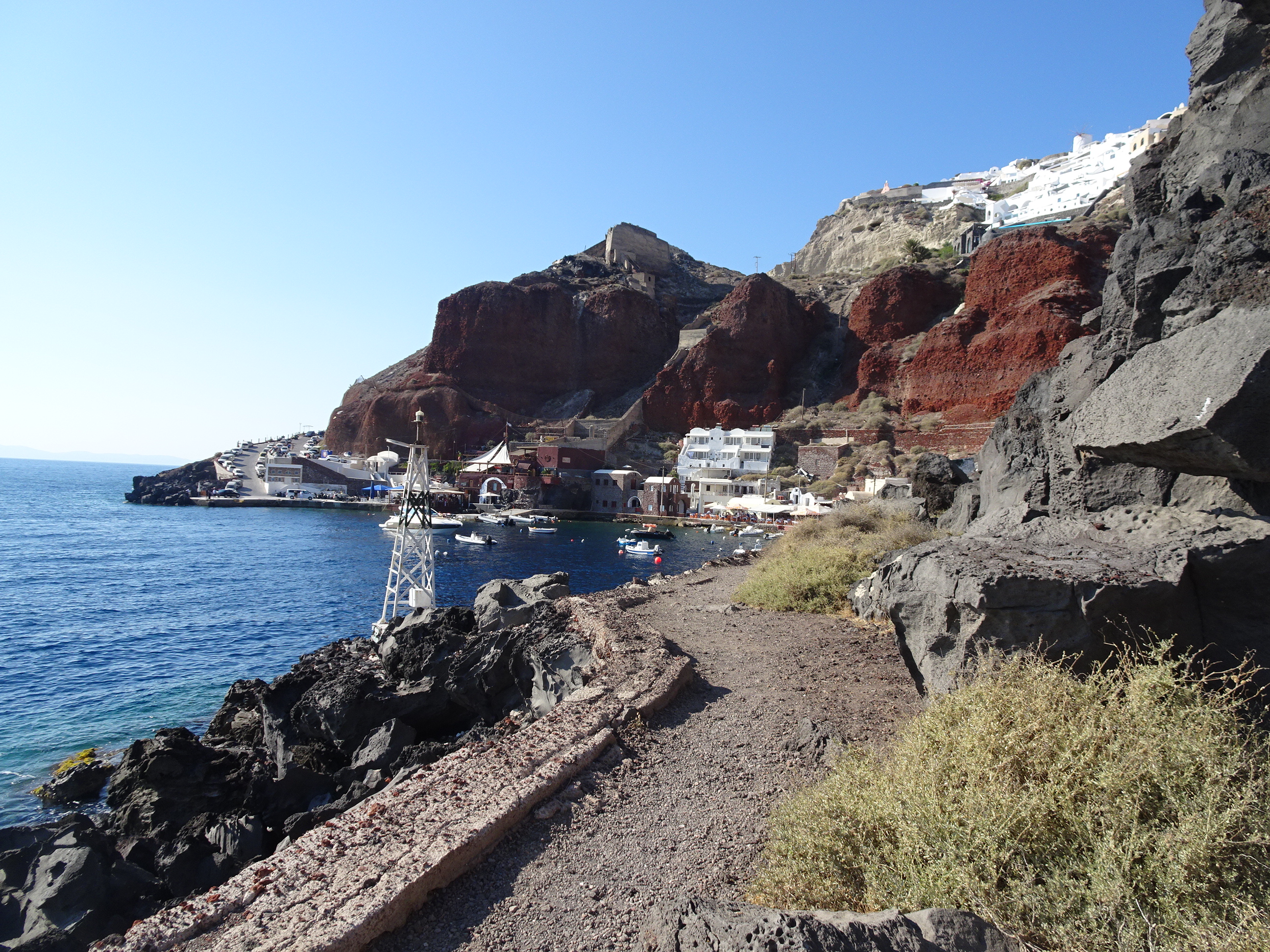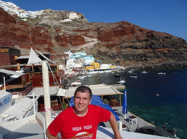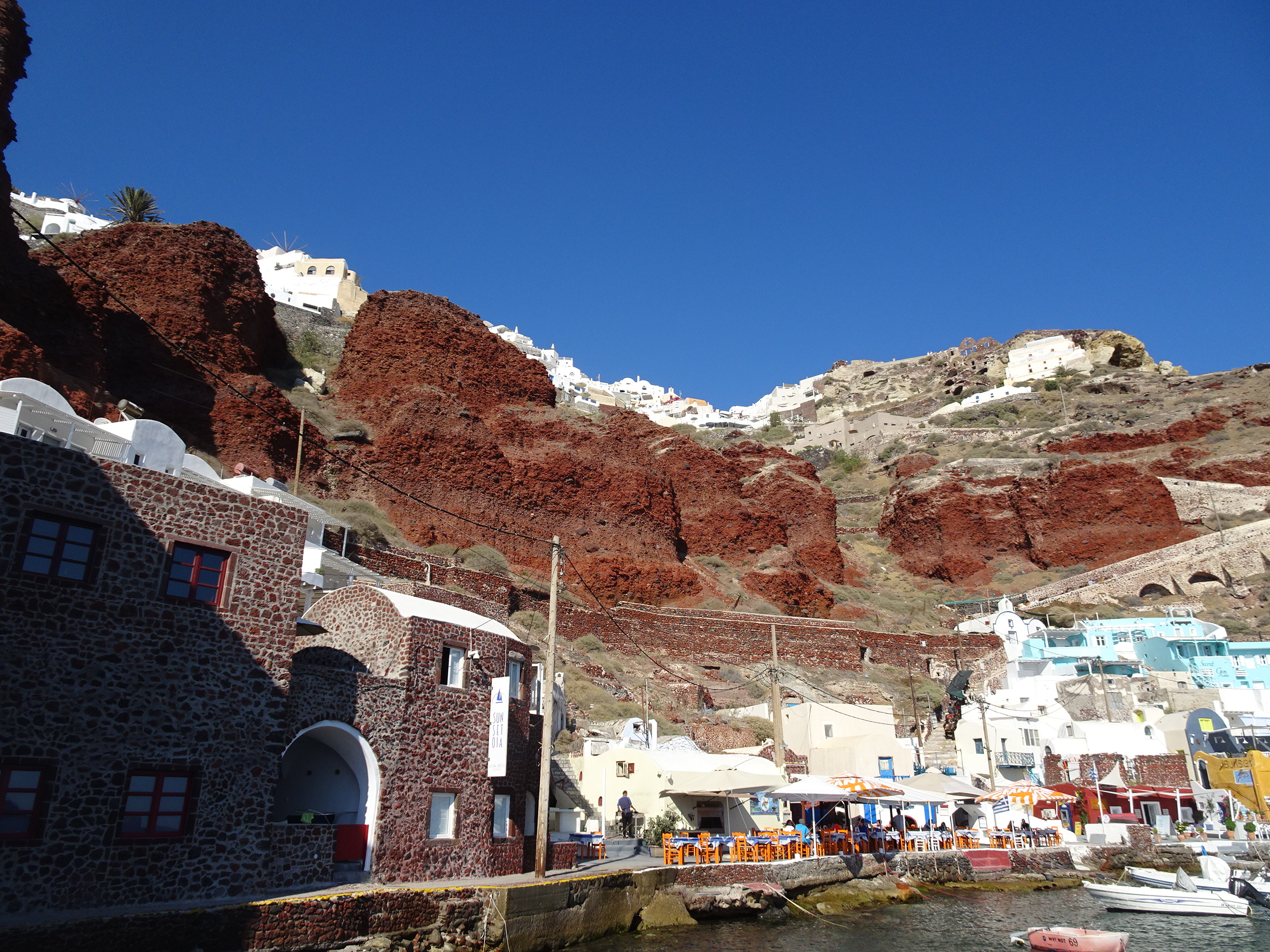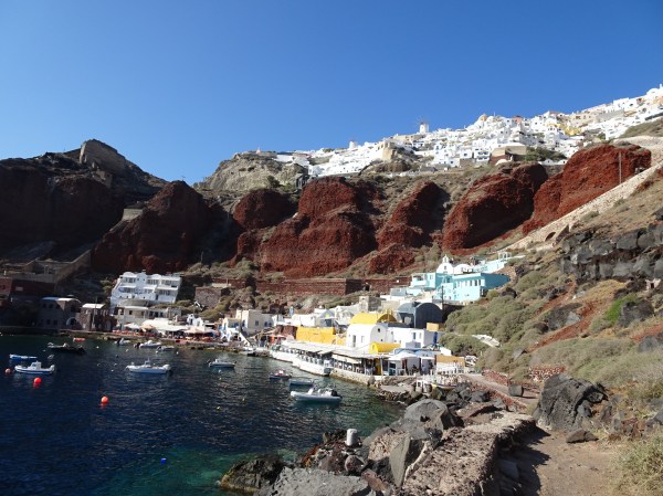 Amoudi Bay este un loc extrem de fotogenic. Stâncile roșii de deasupra creează un contrast minunat cu casele colorate din port.