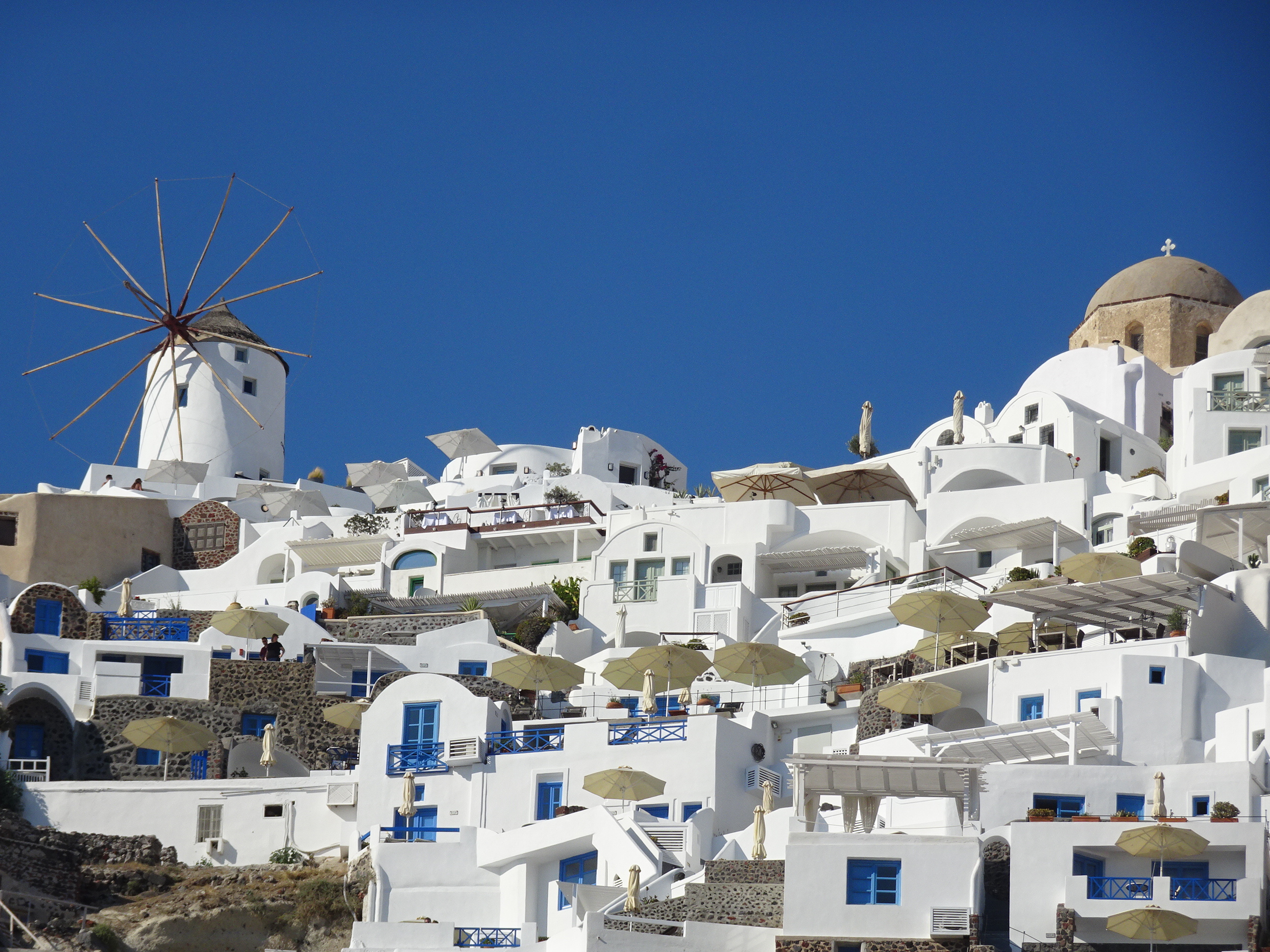 Zoom pe morile și bisericile din Oia
