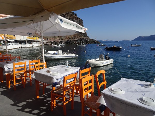Amoudi este plin de restaurante pescărești care oferă vederi grozave de la terasele la malul mării