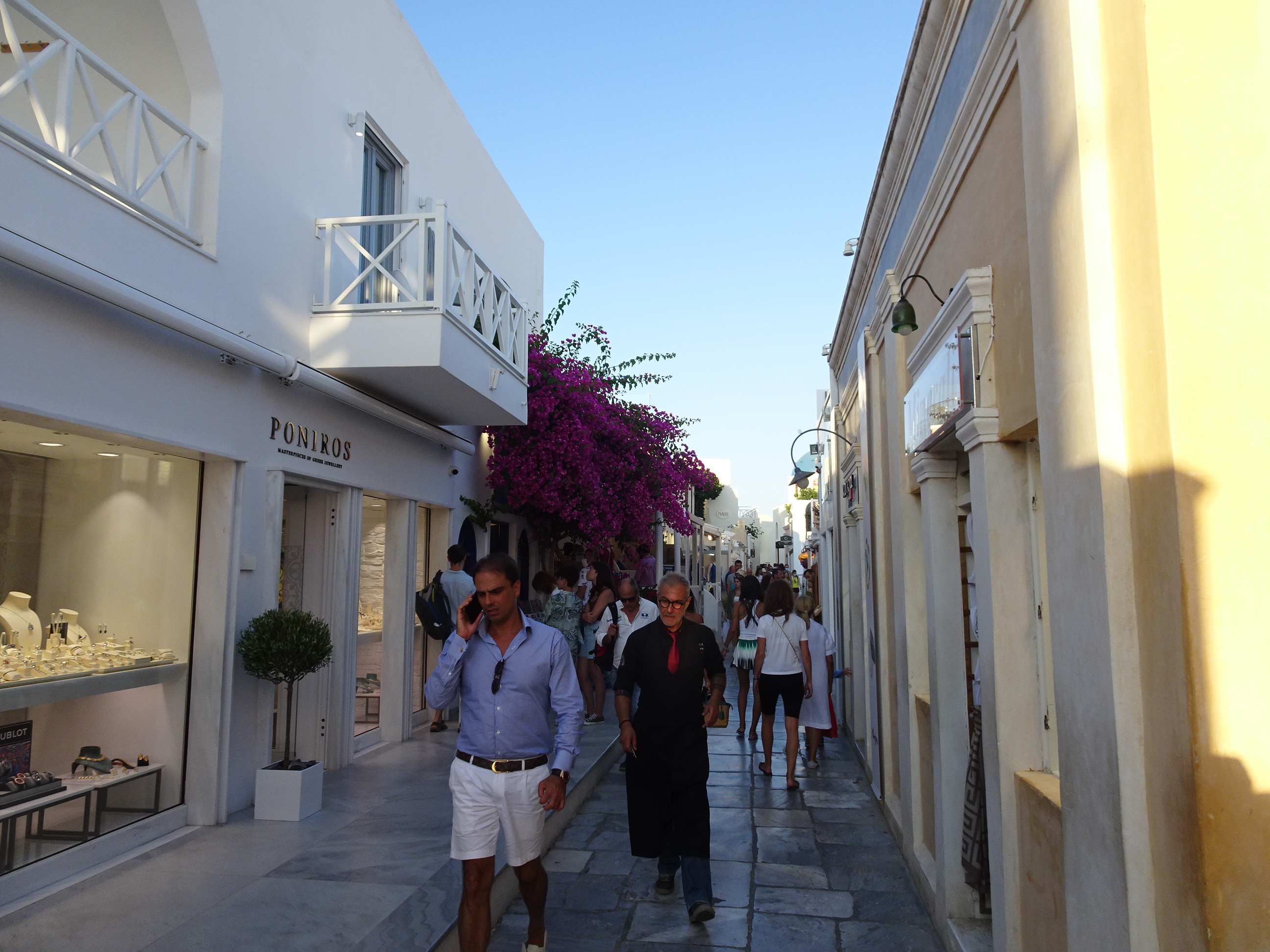 Înainte de asfințit de-abia era loc de mers pe străzile din Oia. Magazinele sunt pline de clienți chiar dacă multe din ele au prețuri cu prea multe zerouri în coadă.