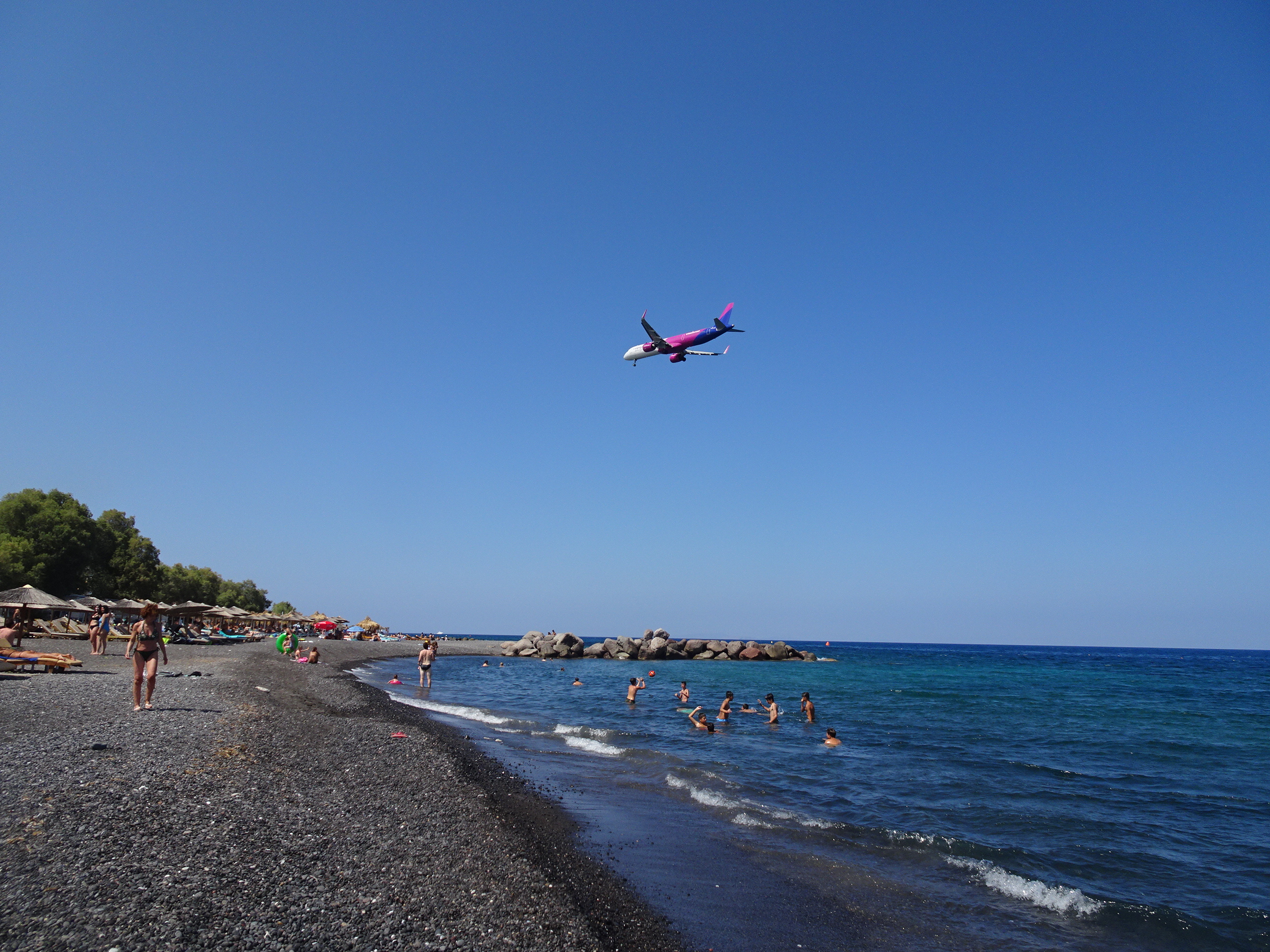 Plaja este un loc bun pentru a urmări avioanele care aterizează în Santorini