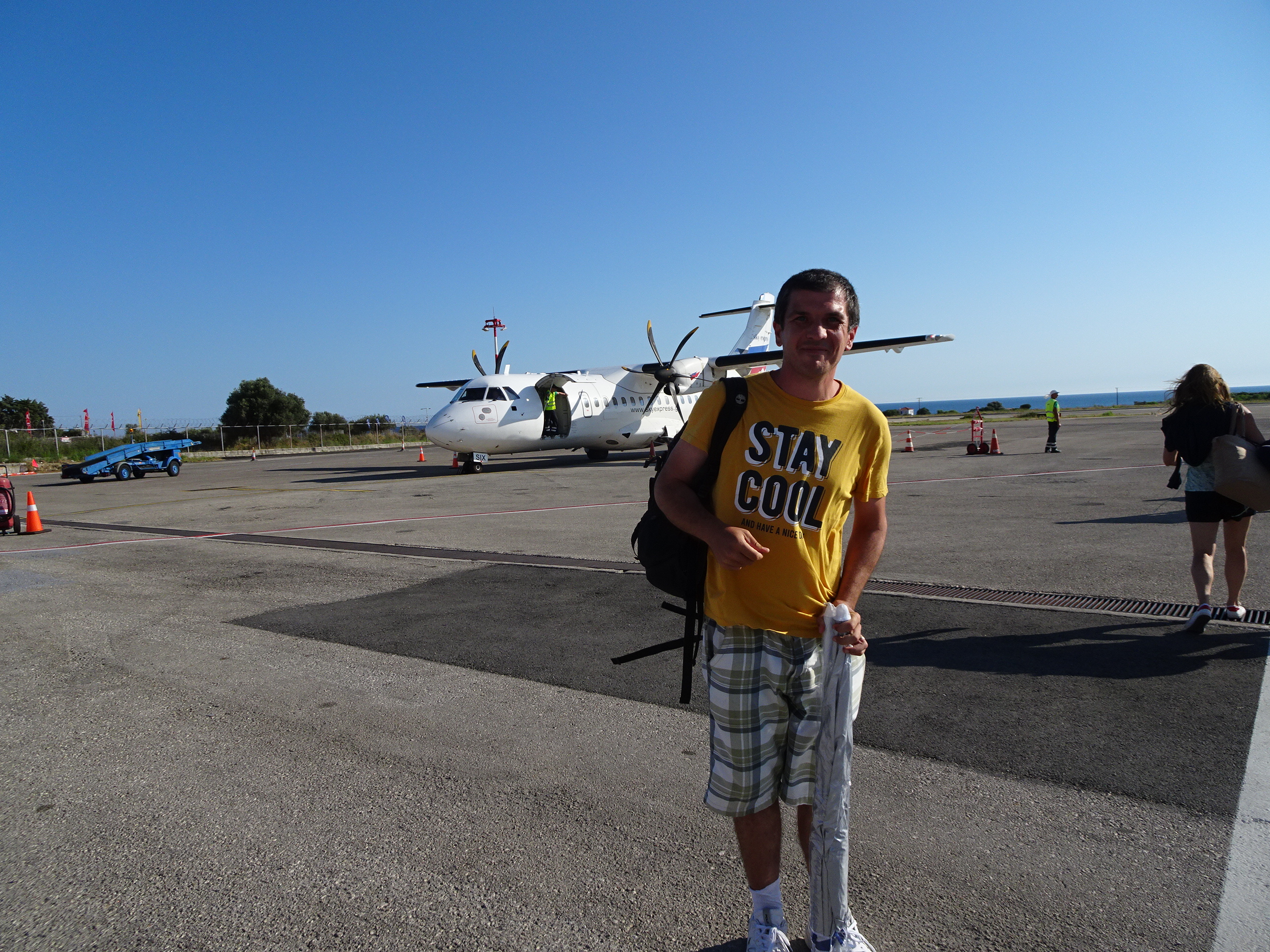 Am plecat așadar cu avionul spre Lefkada. Ca o poveste caraghioasă, în Kefalonia ne-am cumpărat o umbrelă de plajă care ne-a plăcut foarte mult. Mi-am dorit să o luăm cu noi în continuare pe Lefkada, dar nu încăpea în bagajul de cală și știam că nu o putem lua la bagaj de mână. Am decis să o iau cu noi așteptând să fie confiscată la aeroport doar că nimeni n-a zis nimic și m-am trezit urcând cu ea pe avion. A fost apoi mare „distracție” să îi găsesc un loc în micuțul ATR al companiei Sky Express.