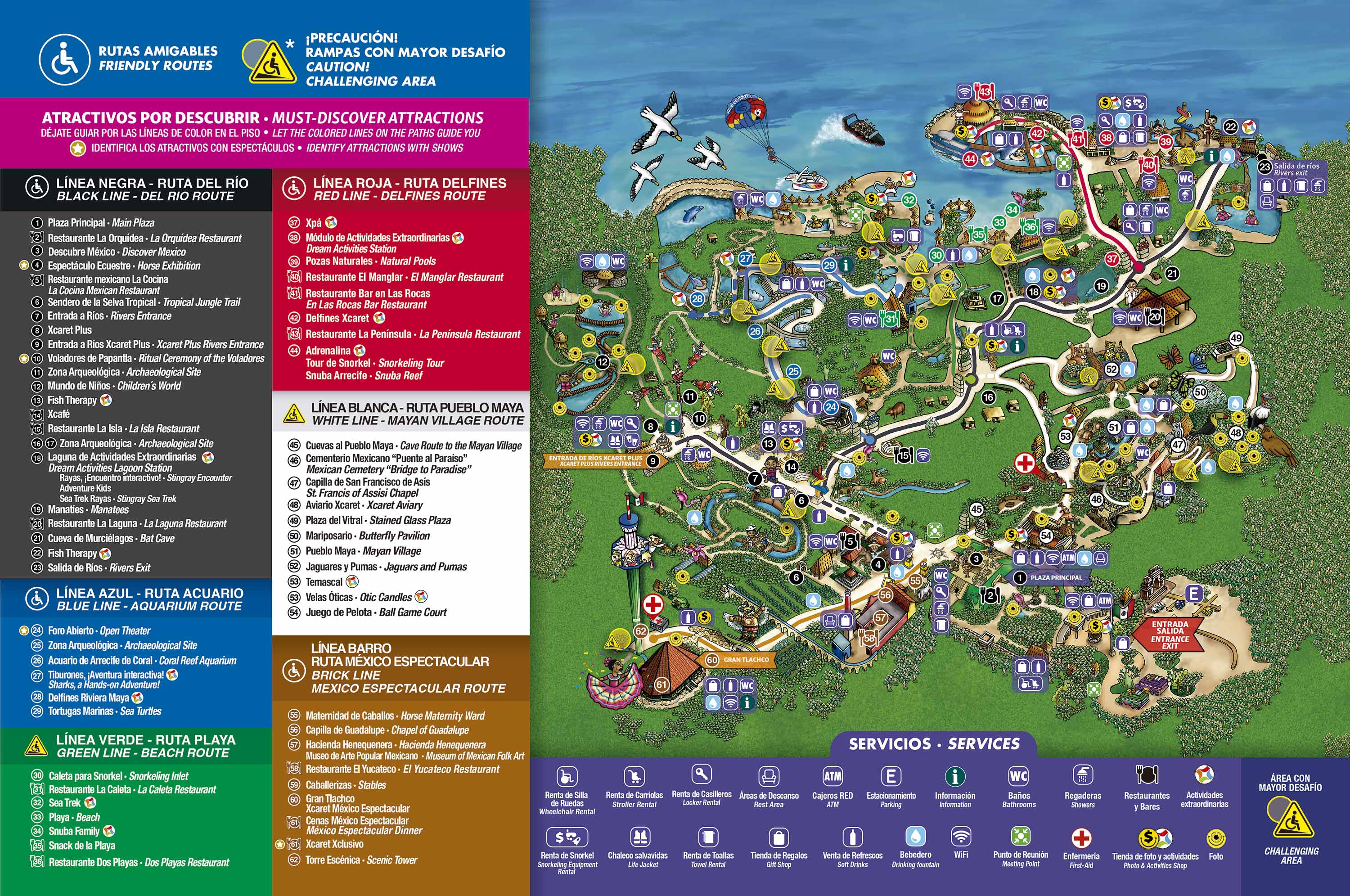 Parcul este imens și greu de acoperit într-o zi întreagă. În cele 3 ore pe care le mai aveam până la spectacol am încercat să văd cât mai multe locuri. Mai jos, harta XCaret – traseele recomandate și atracțiile principale.