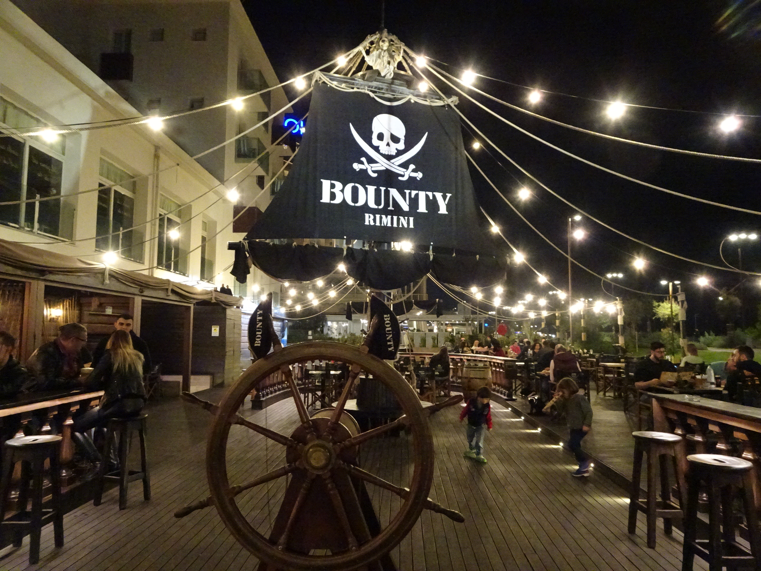 Am descoperit la doi pași de hotel un restaurant foarte bun. Bounty este restaurantul piraților din Rimini. Terasa are forma unui vapor, interiorul arată ca o insulă din Caraibe iar ospătarii sunt toți îmbrăcați în costume de pirați. Mai important, mâncarea este excelentă. Ne-a plăcut așa mult încât acolo am servit cina în fiecare seară.