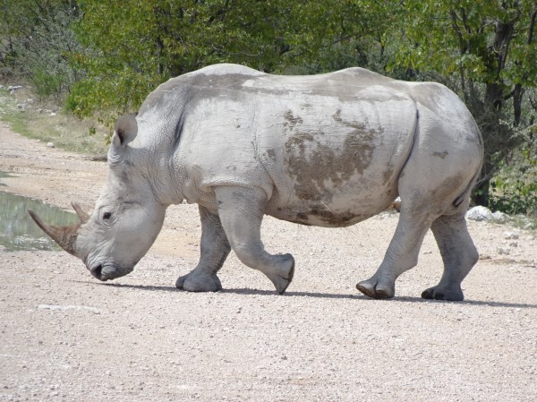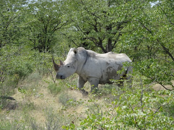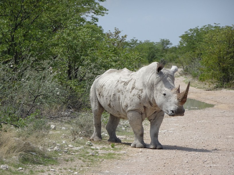 Pe drum, chiar în fața jeepului nostru a apărut un rinocer alb. Nu e deloc un animal care se întâlnește des prin Etosha, chiar și ghidul ne-a spus că în ani de zile de tururi nu mai văzuse unul. Mai mult, rinocerul nu a fost deloc sfios și a petrecut mult timp pozând pentru noi în apropiere.