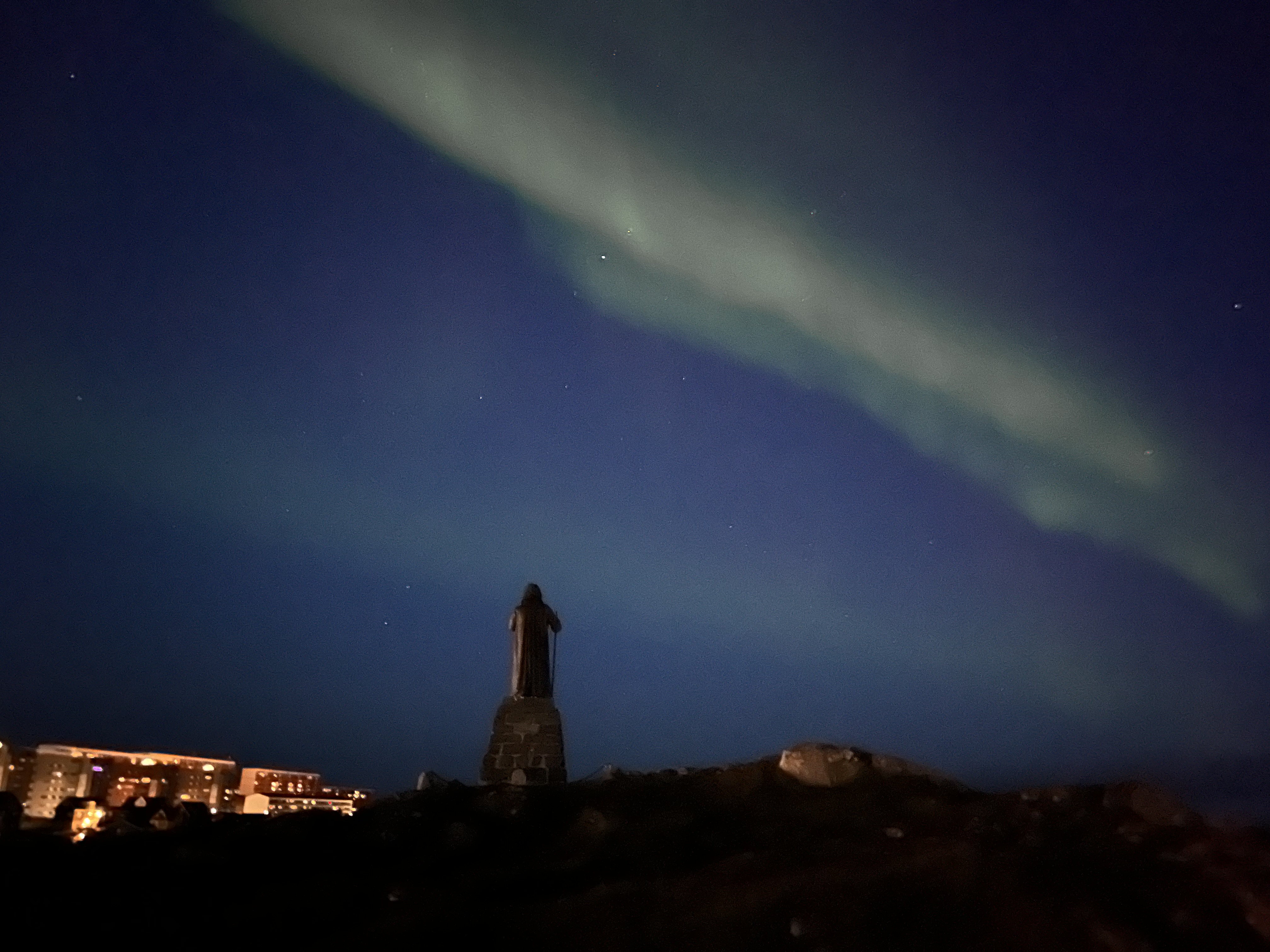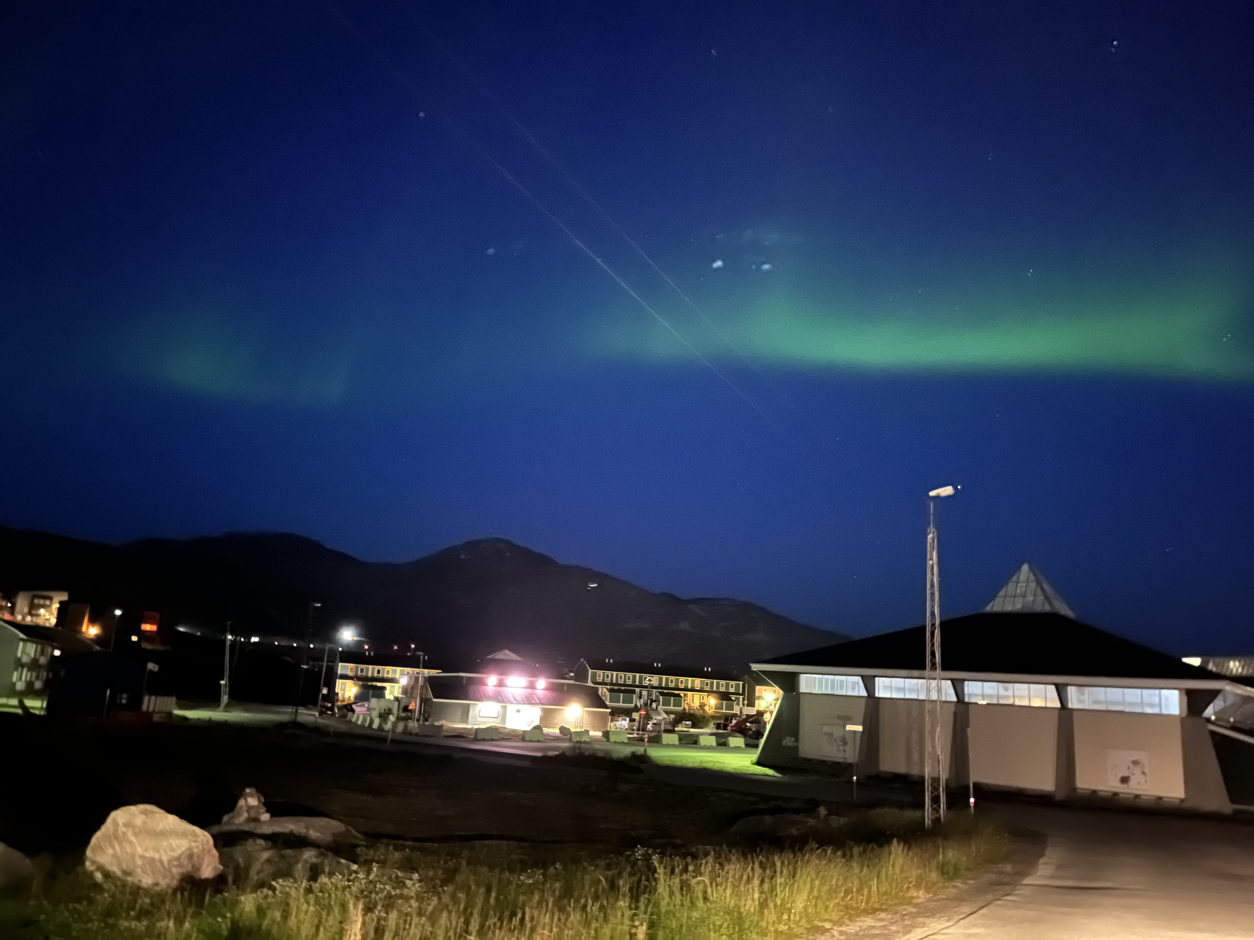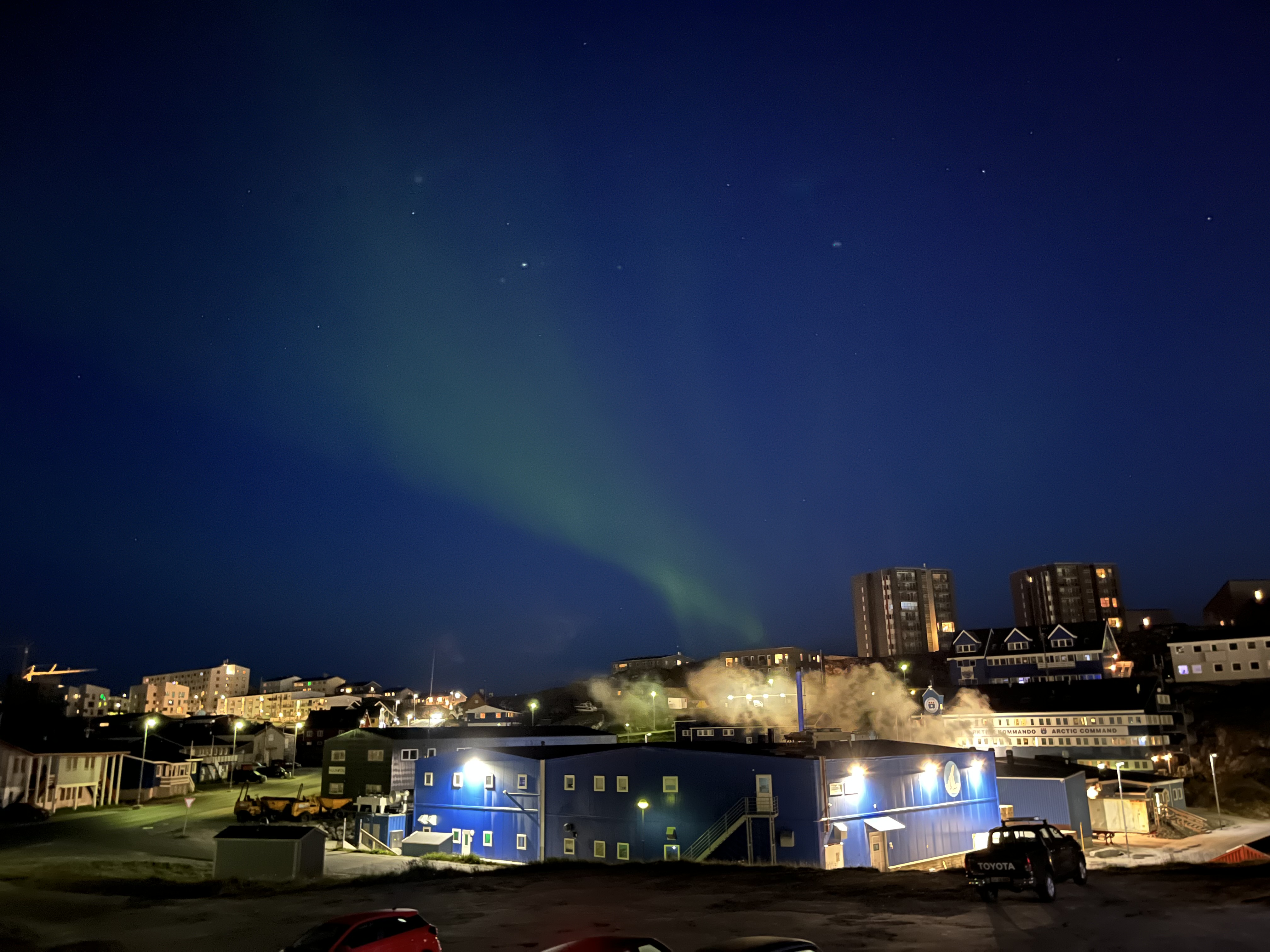 Asta este adevărat în zonele mai nordice, dar la Nuuk (aflat mai la sud) este posibil să vezi luminile nordului în cele 2-3 ore ale nopții când chiar se întunecă atât timp cât apare o erupție solară puternică iar cerul este senin. În acea noapte s-au îndeplinit toate condițiile și ni s-a arătat Aurora. Era atât de puternică încât se vedea chiar din oraș, cu toată lumina de acolo.
