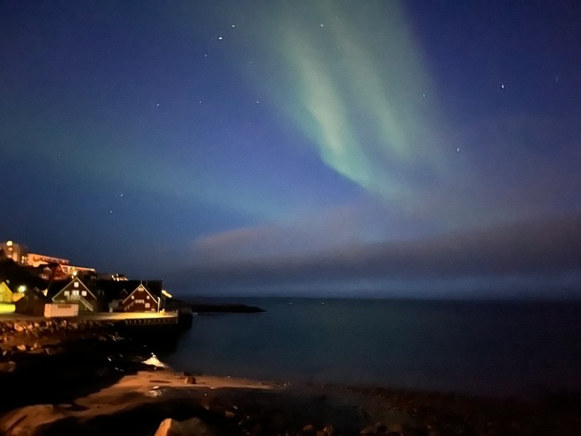 Nu m-am acomodat bine cu fusul orar din Groenlanda (4 ore diferență față de acasă) și am dormit și m-am trezit la ore destul de aiurea. Ziua aceea am adormit devreme și m-am trezit în mijlocul nopții pe la ora 2. Din întâmplare, m-am uitat pe fereastra camerei și nu mi-a venit să cred ce văd. Cerul era luminat în culorile verzi ale Aurorei Boreale!
