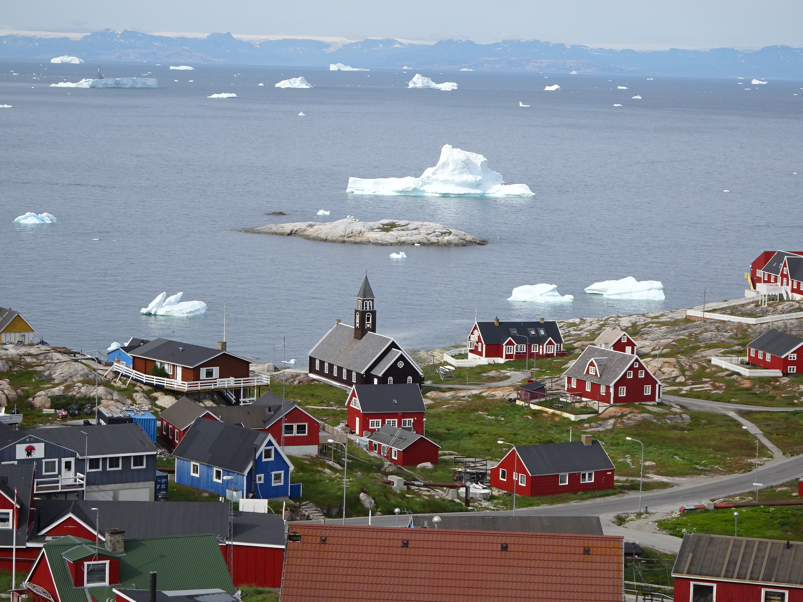 O nouă panoramă de care să te îndrăgostești văzută de la terasa hotelului. Arată splendid casele colorate din orașul vechi și la fel de impresionante sunt sutele de blocuri de gheață plutitoare de pe Disko Bay.