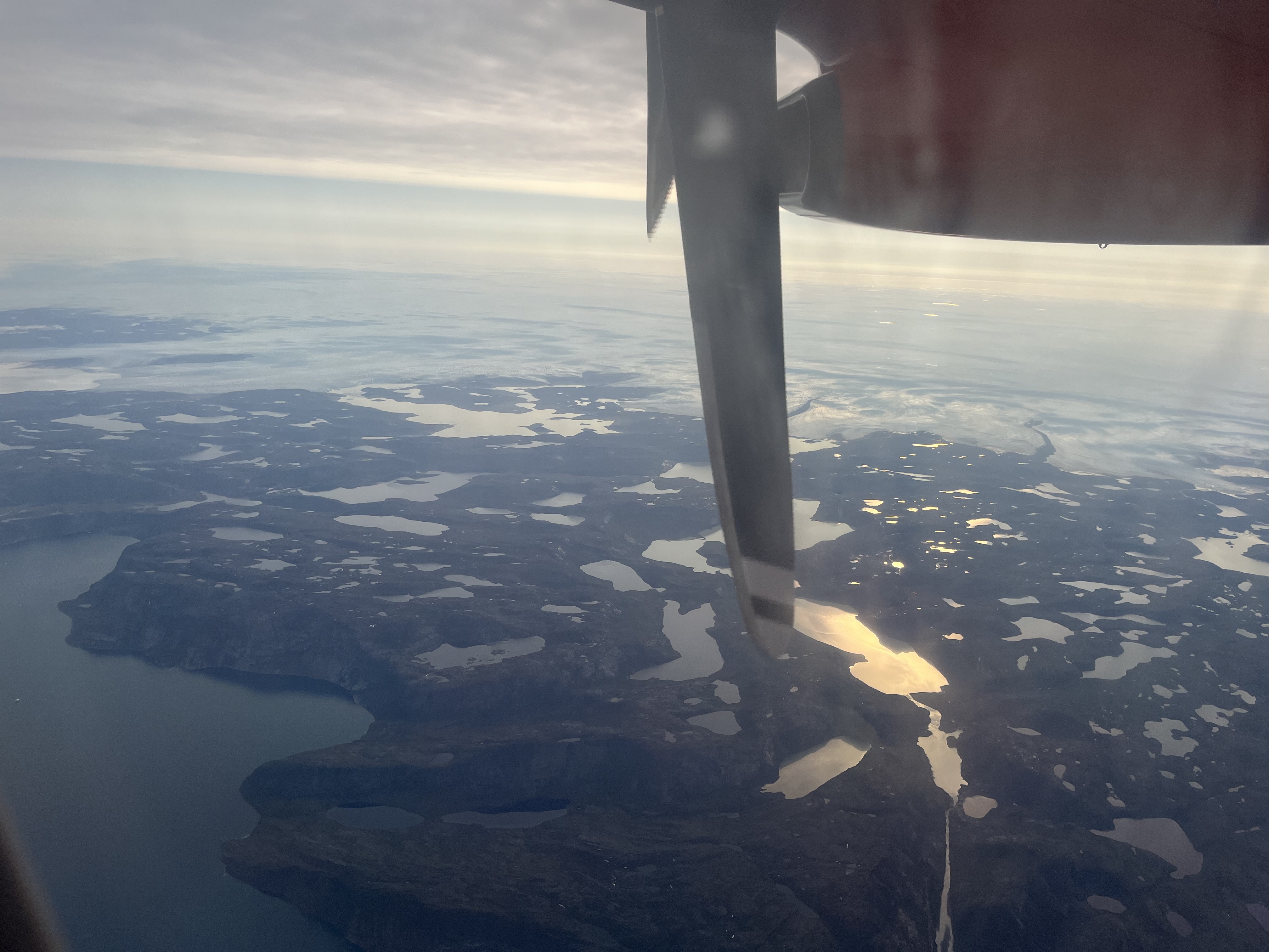 Admirând peisajul Groenlandei de la geam – se vede zona verde înțesată de lacuri la țărm și mai departe nesfârșita calotă glaciară.