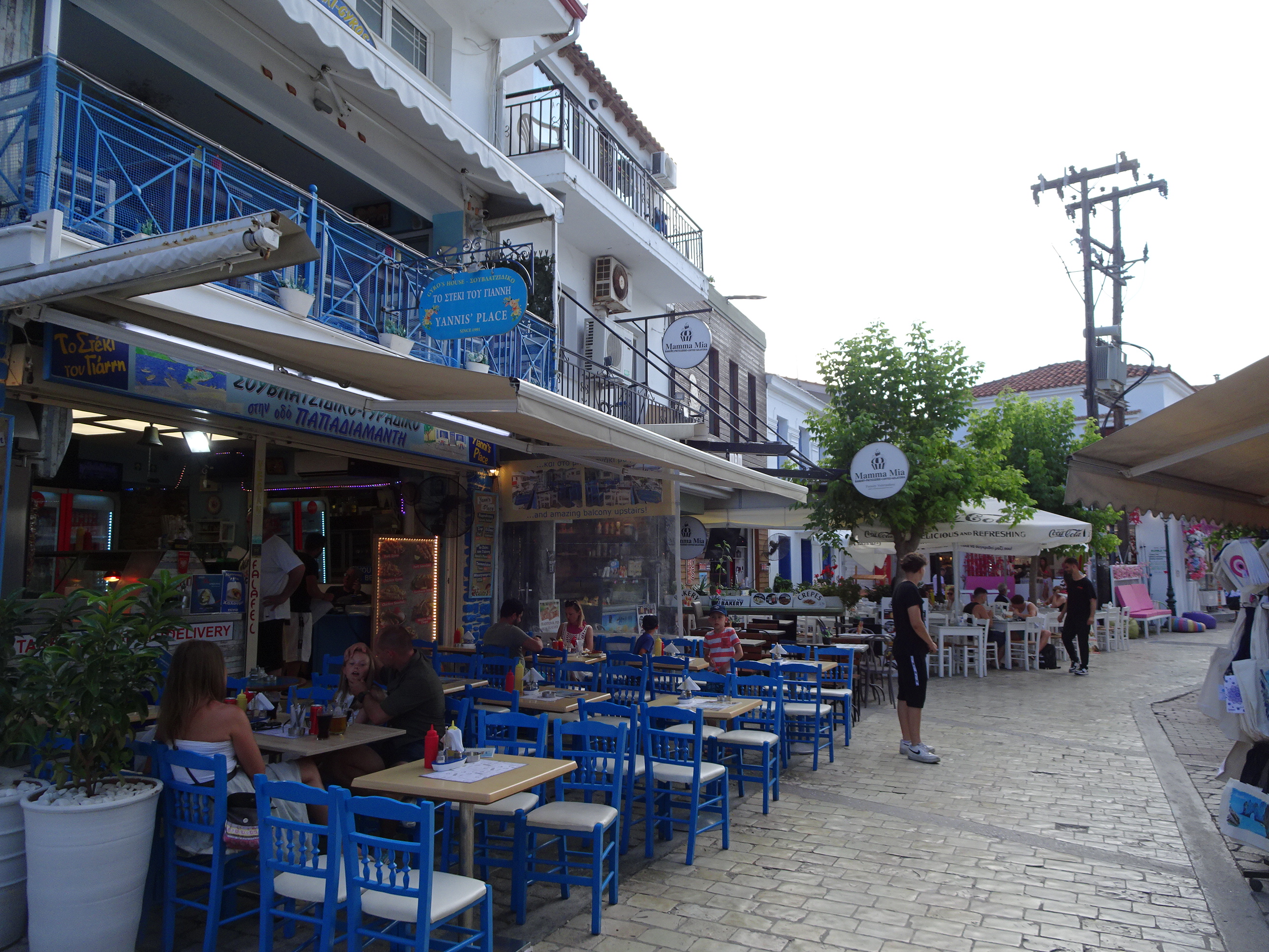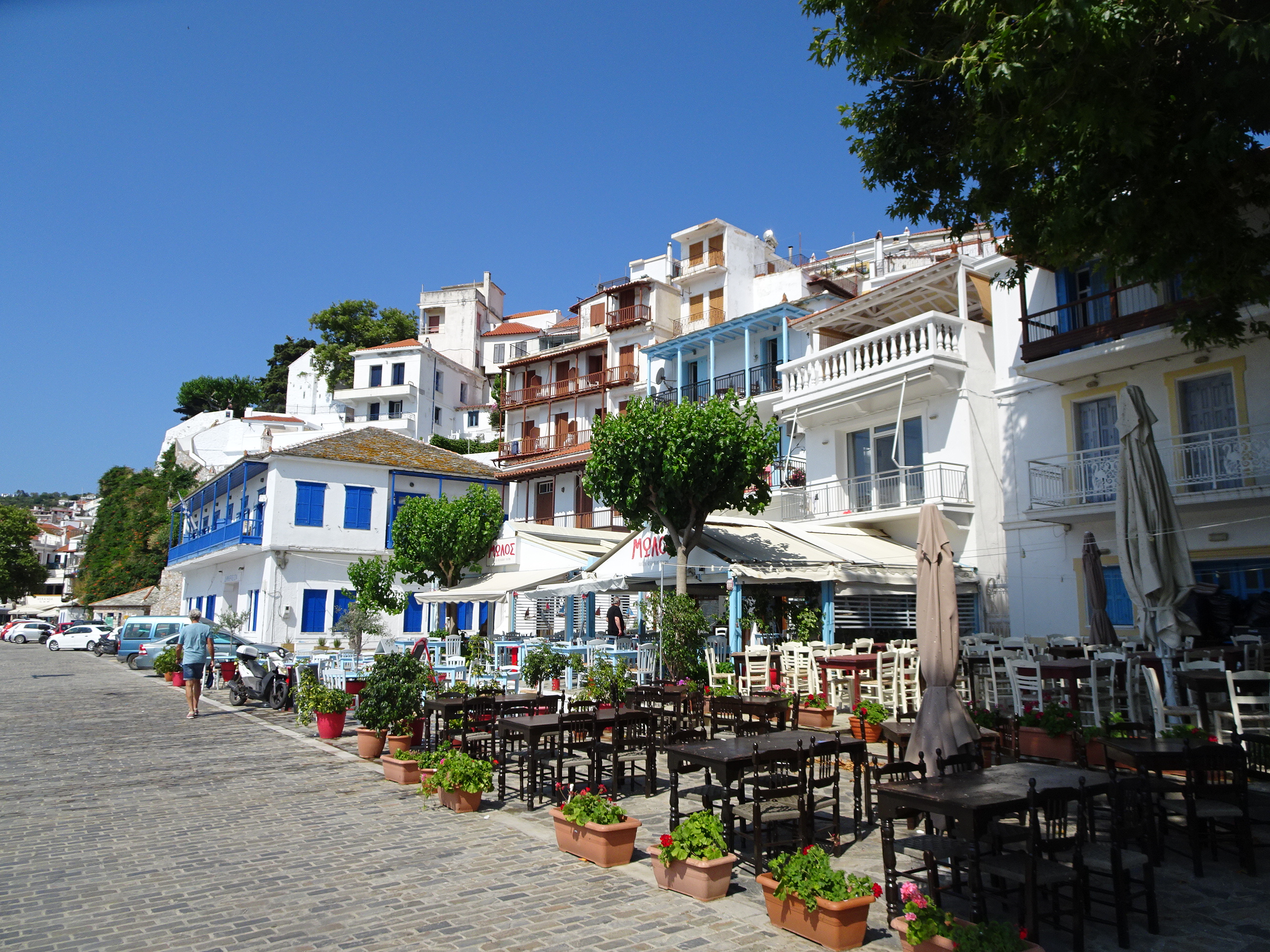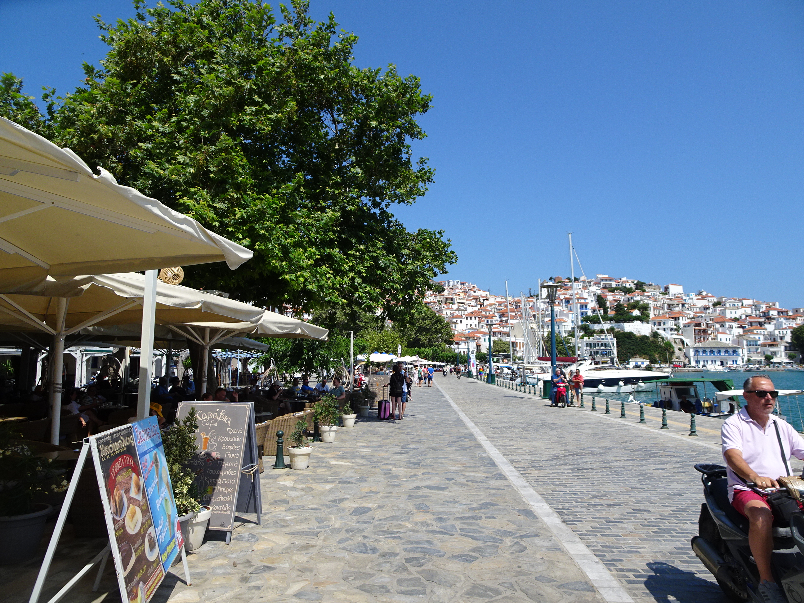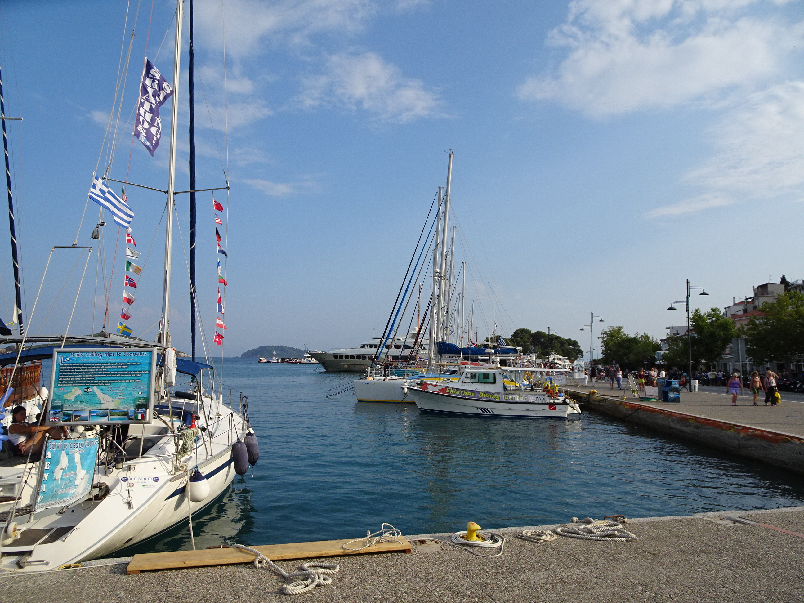 Pe faleză stau ancorate ambarcațiunile care duc turiștii zi de zi în excursii pe mare. Cel mai popular tur este spre plaja Lalaria, aflată în nordul Skiathos și accesibilă numai dinspre mare.