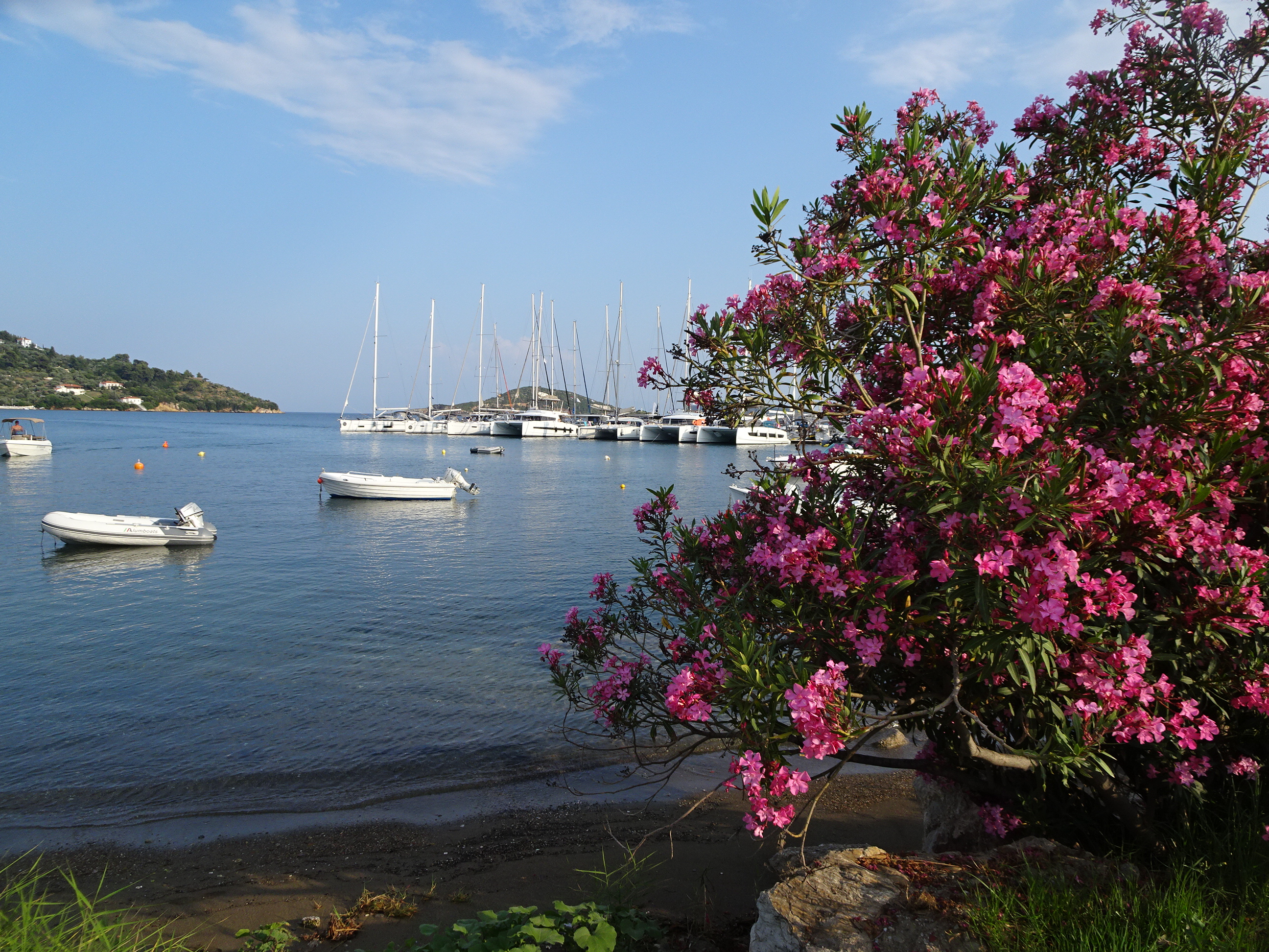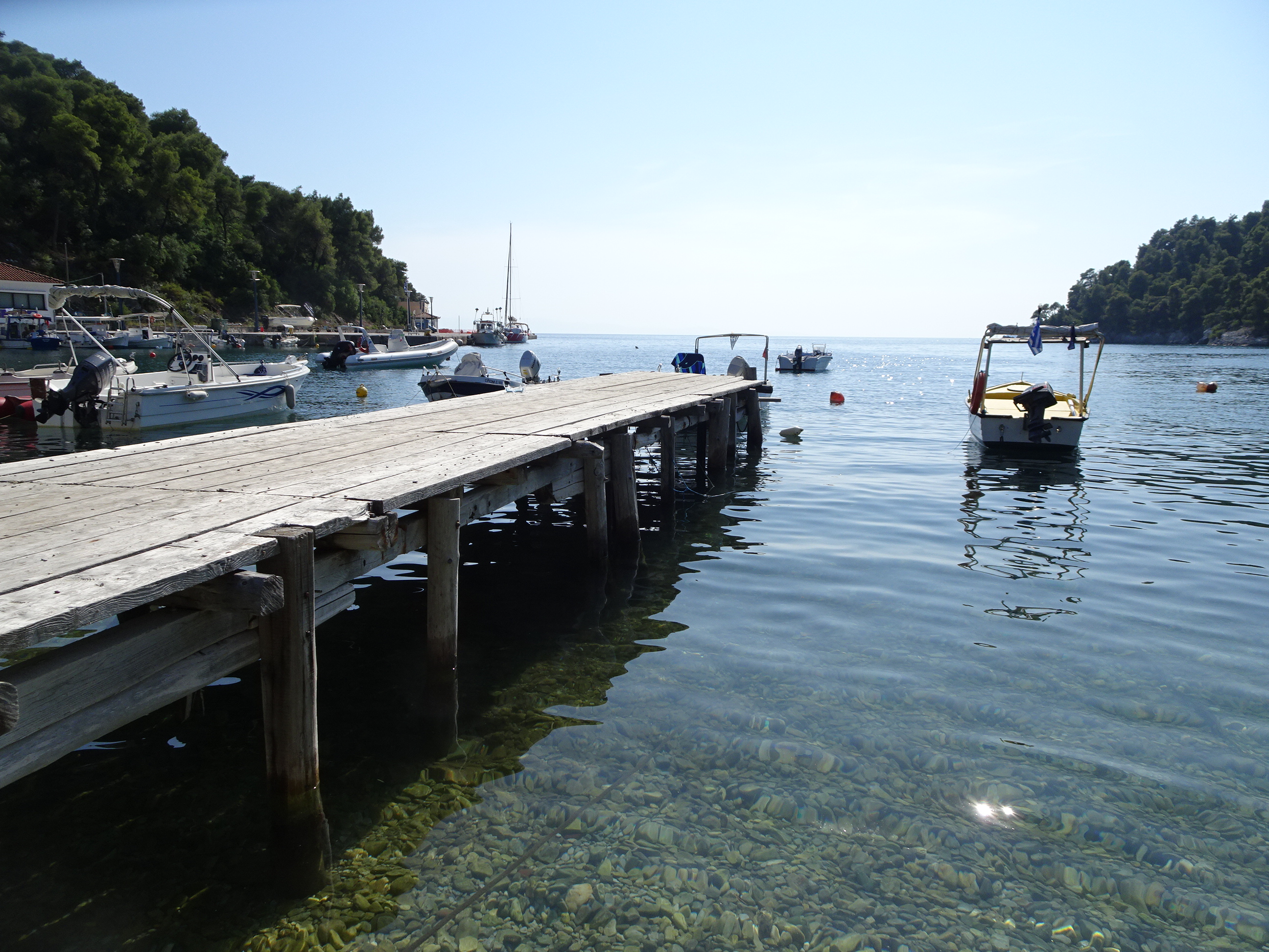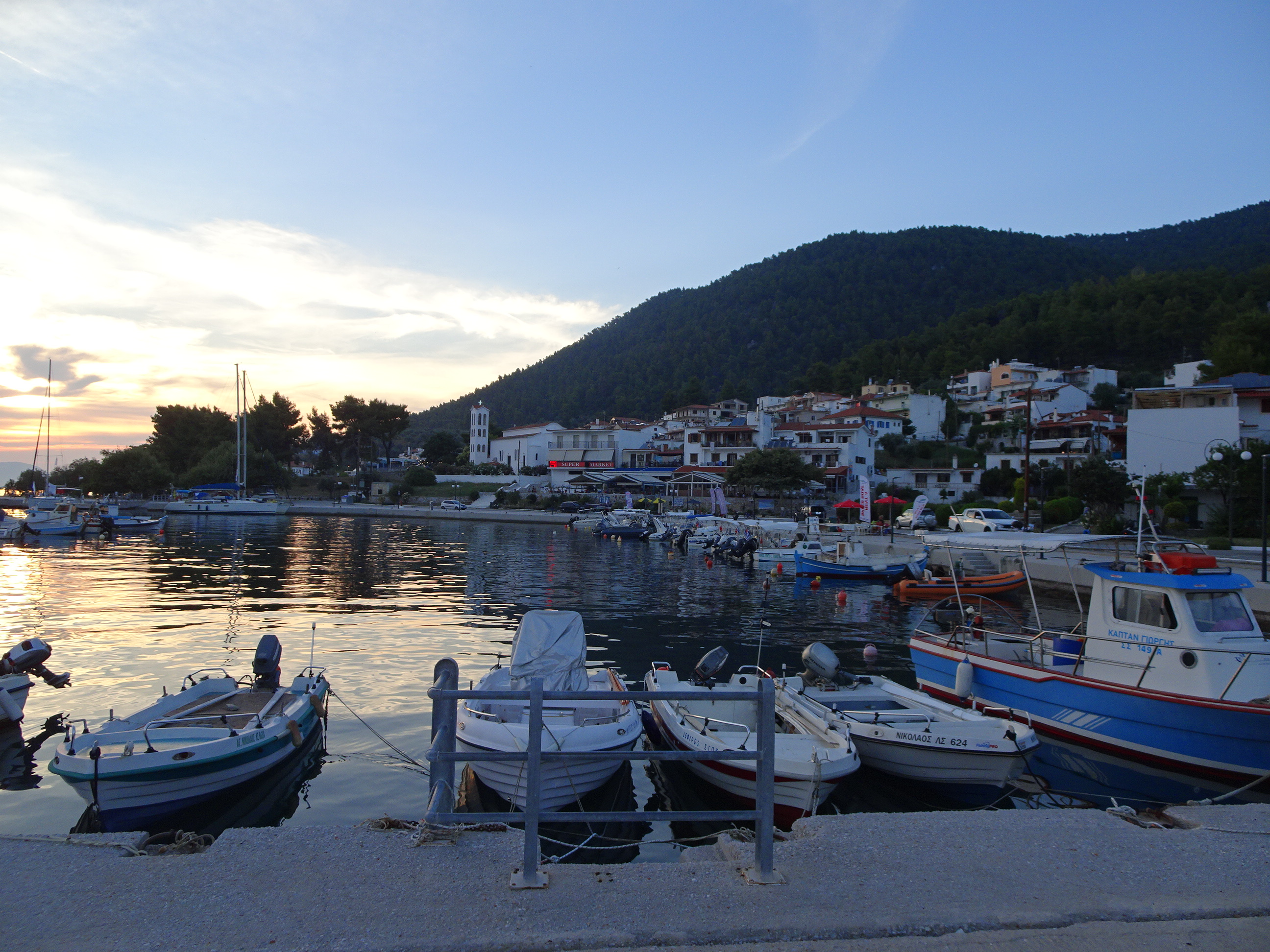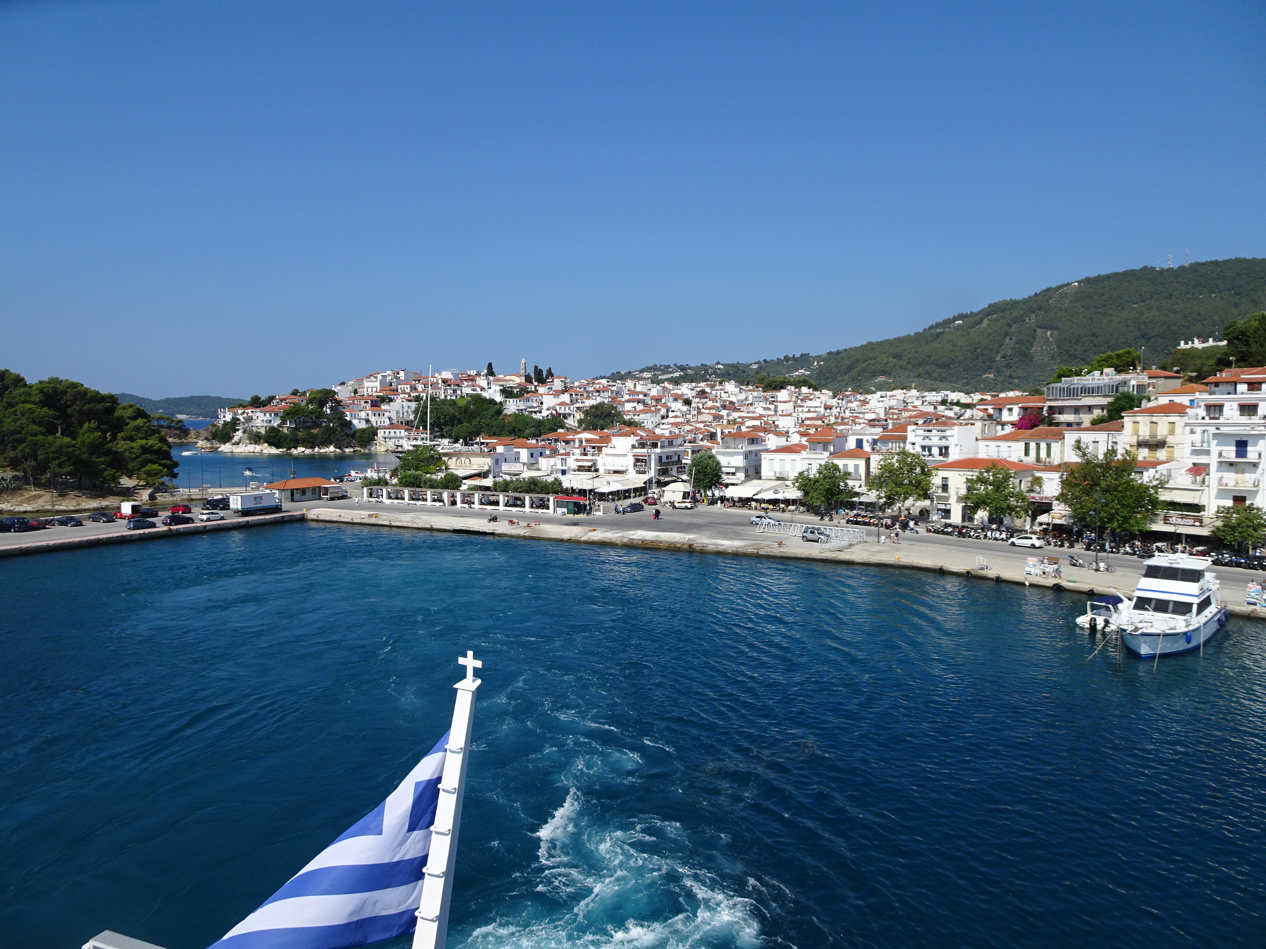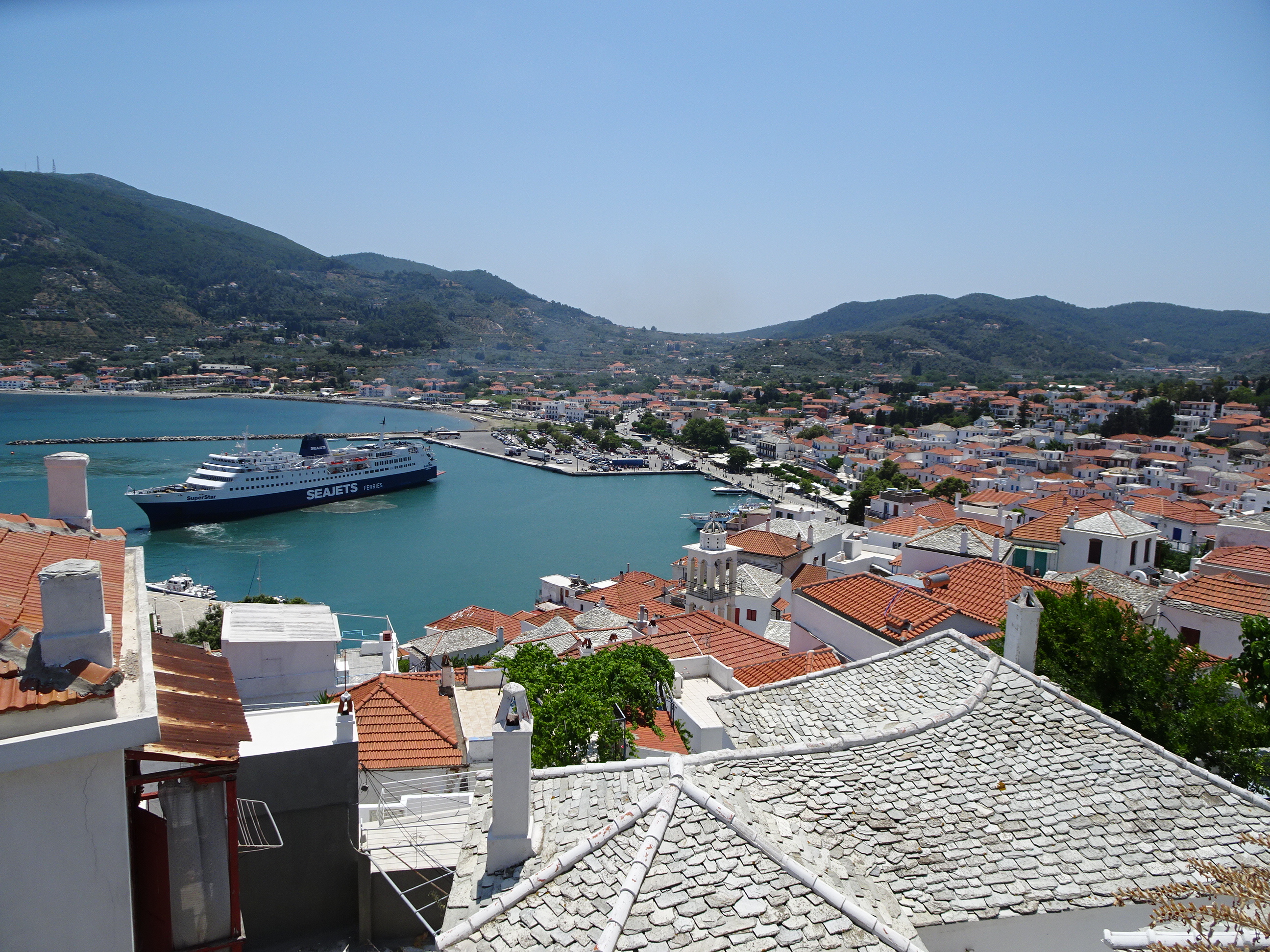 Drumul pe mare a durat o oră și jumătate. Există două porturi unde se poate ajunge în Skopelos: cel principal din Skopelos Town și cel din Glossa. Glossa se află pe coasta vestică, mult mai aproape și drumul transferul pe mare durează numai 45 de minute, dar până în capitală se mai merge o oră pe șosea. Pentru noi, a fost mai convenabil ruta mai lungă care ne ducea direct în portul Skopelos unde aveam și cazarea.