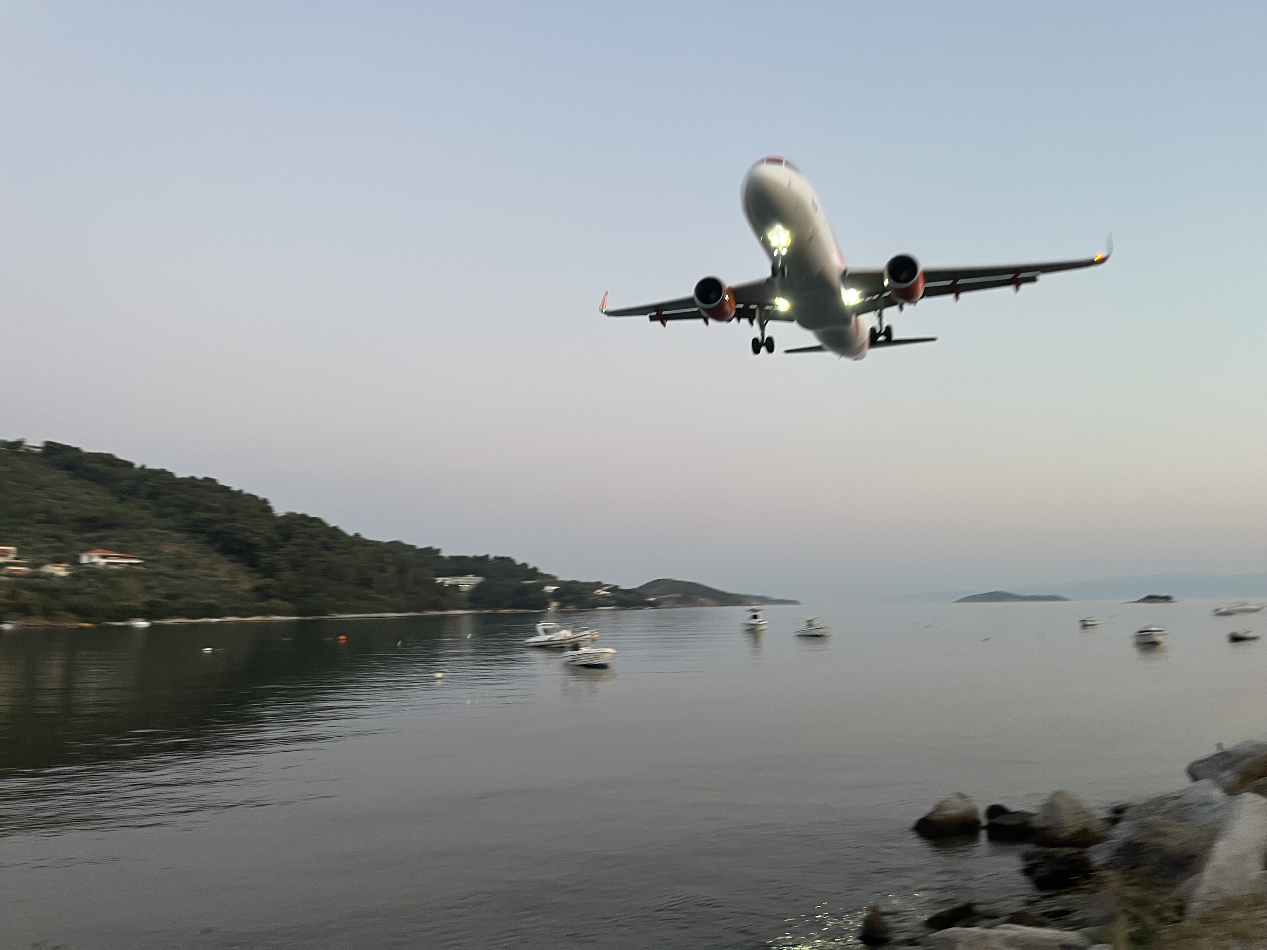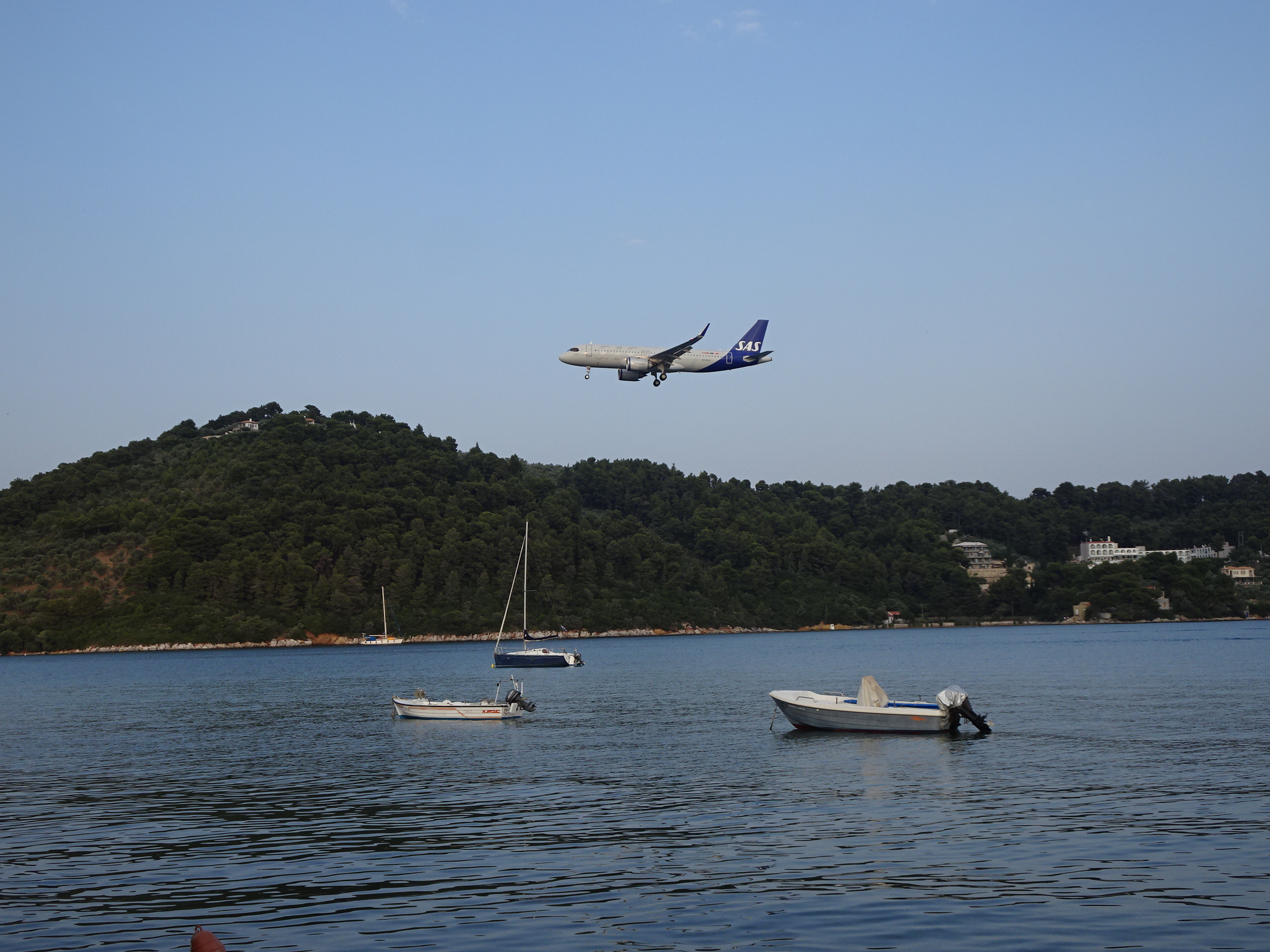 Am plecat dimineața de pe Otopeni și în mai puțin de o oră începeam deja coborârea pentru aterizare. Aeroportul din Skiathos este unul special: are o pistă foarte scurtă (1,6 kilometri) și este considerat dificil pentru piloți. Aterizarea acolo este o experiență.