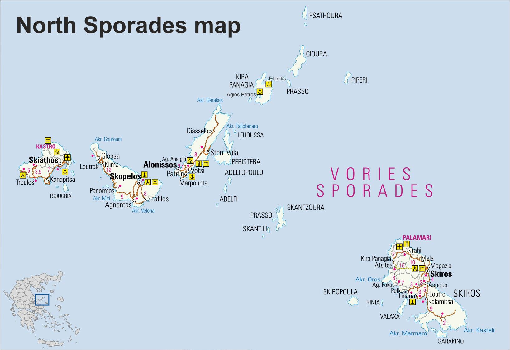 Sunt peste 20 de insule în Sporade, dar numai 3 dintre ele sunt destinații turistice importante: Skiathos, Skopelos și Alonissos. Dintre ele, Skiathos este insula cea mai populară, cu un port turistic mereu aglomerat și cu sute de hoteluri și pensiuni. Skopelos este cea mai mare insulă, cea care se bucură de cele mai multe plaje și este renumită ca insula unde s-a filmat musicalul Mamma Mia. Alonissos este de departe insula cea mai liniștită, ideală pentru cei care caută un concediu de relaxare.