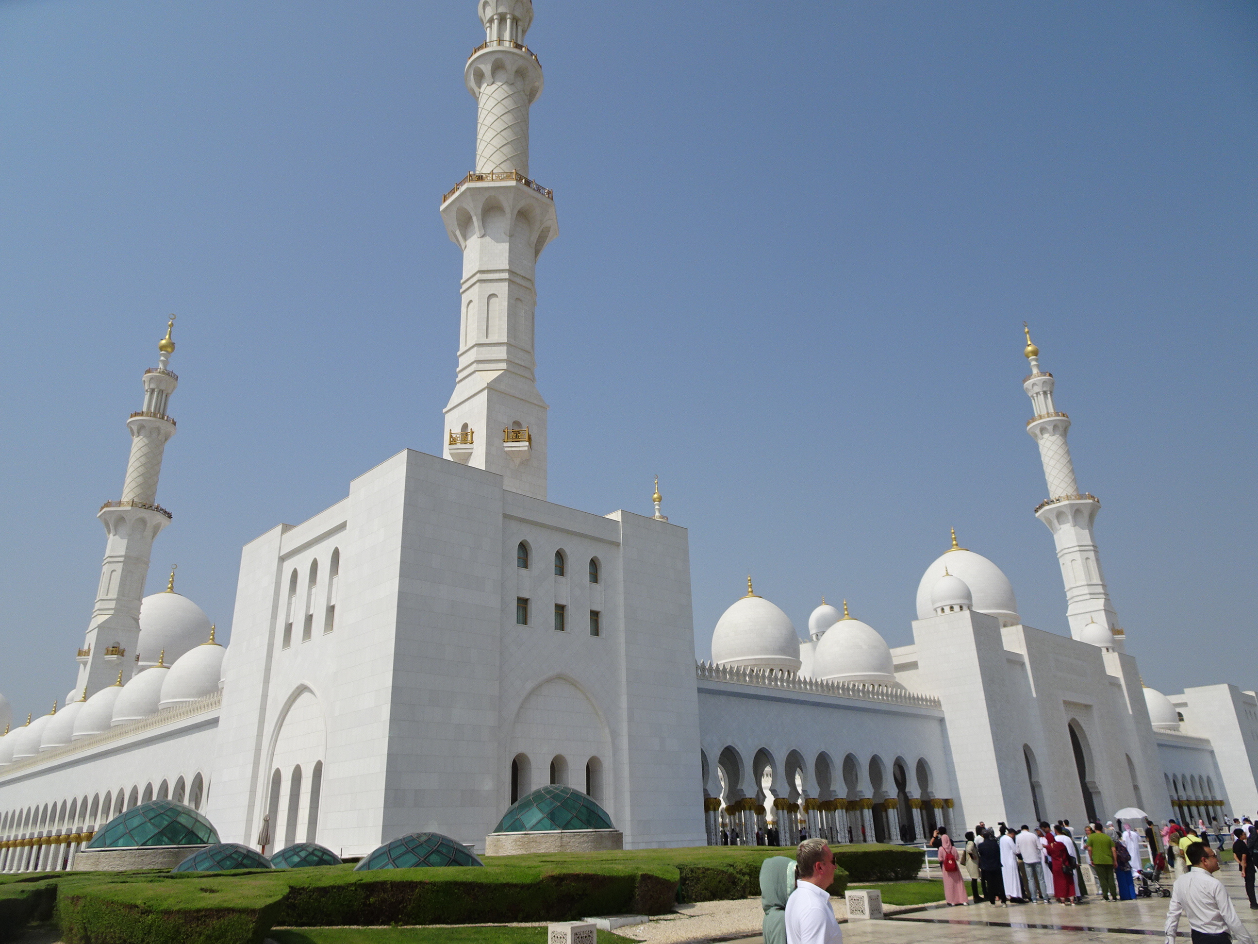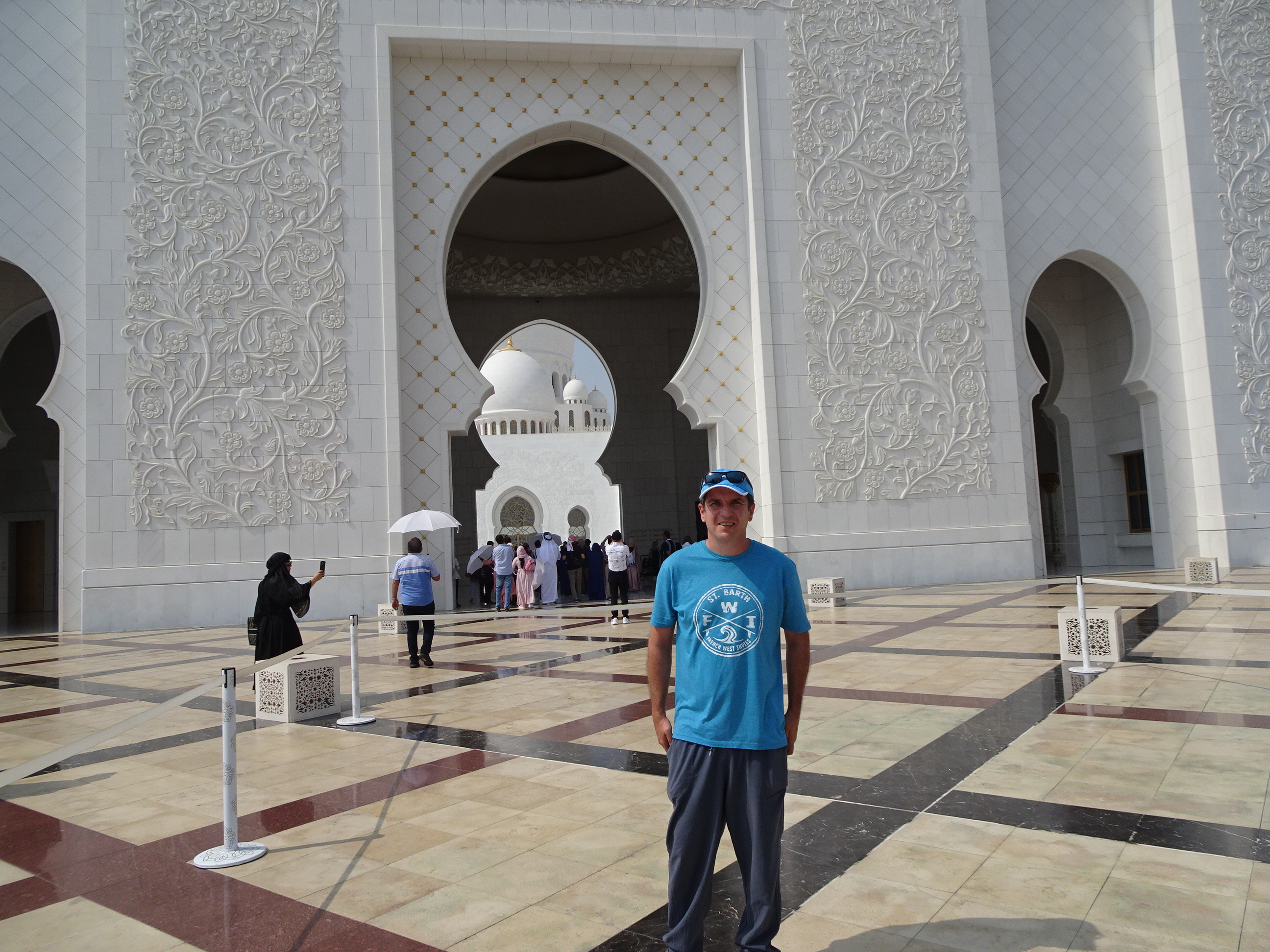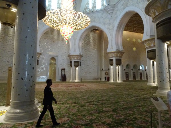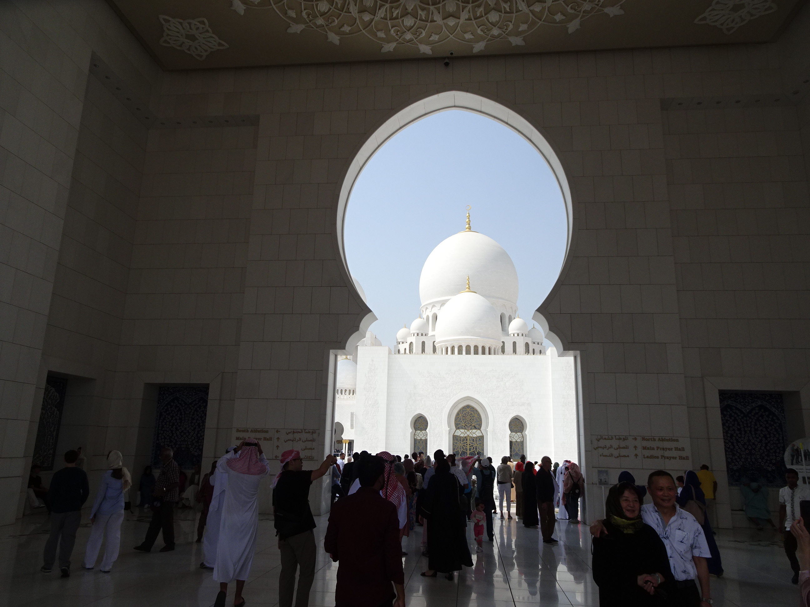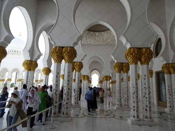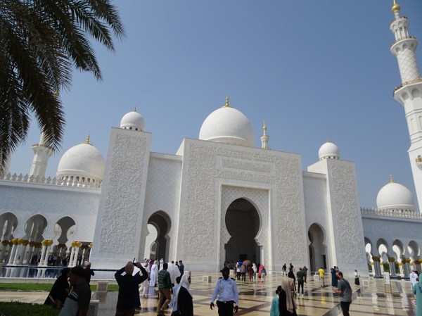 După ce am străbătut toate coridoarele și pasajele, am ajuns la intrarea în moschee. Chiar dacă nu este o construcție veche, istoria sa neavând nici două decenii, consider că moscheea din Abu Dhabi e probabil cea mai frumoasă din lume. Detaliile sale arhitecturale sunt unice iar într-o zi însorită albul cupolelor efectiv iți ia ochii.