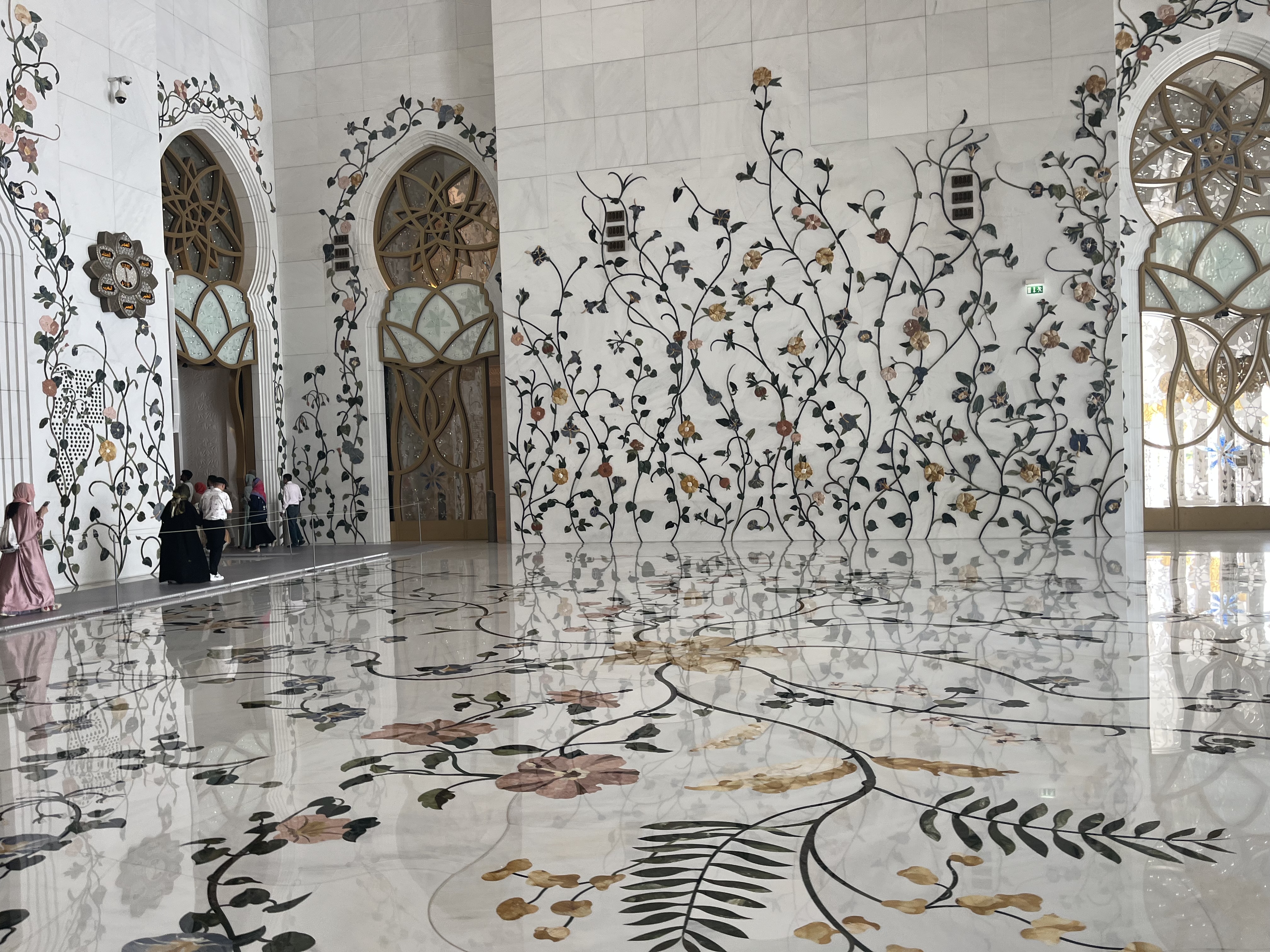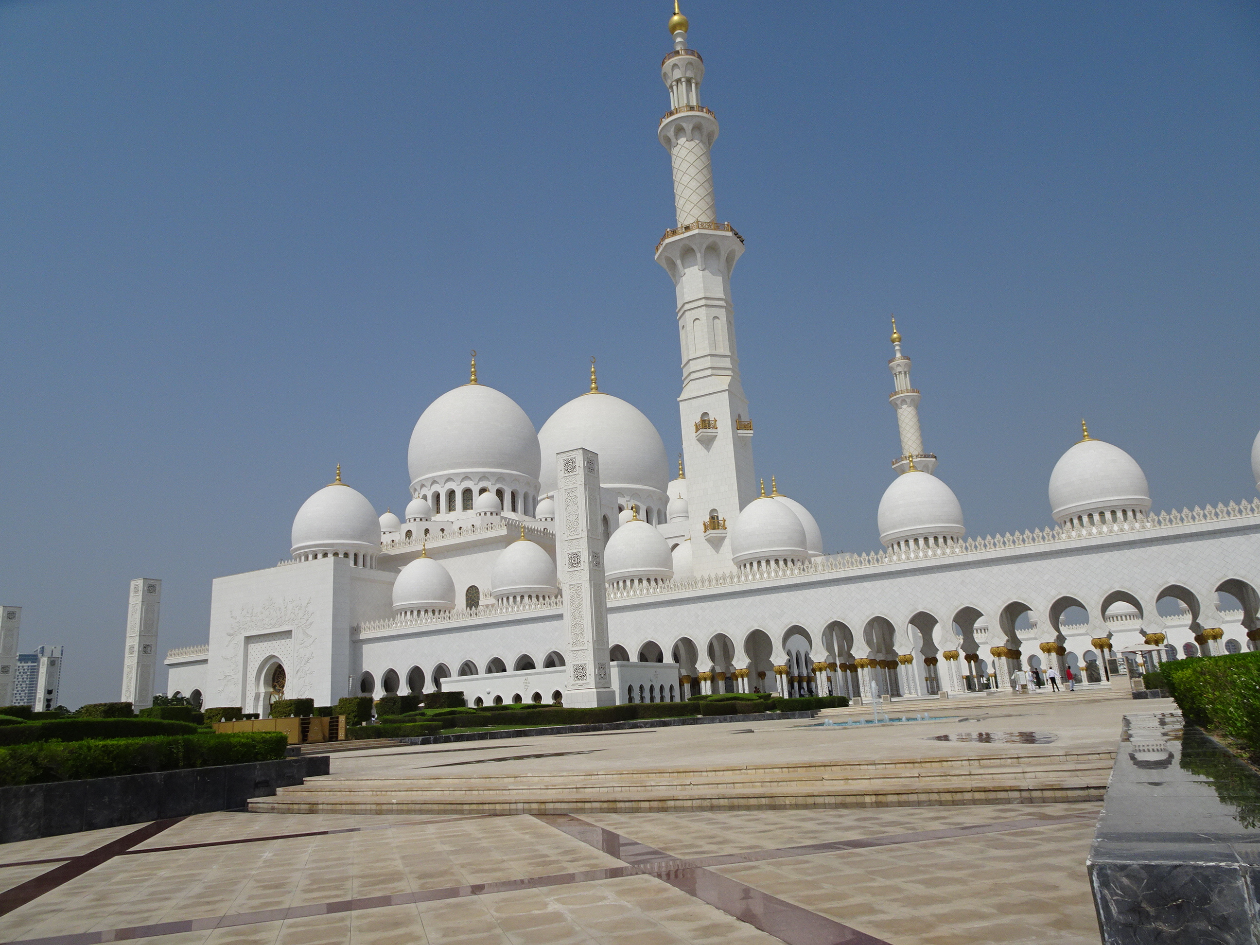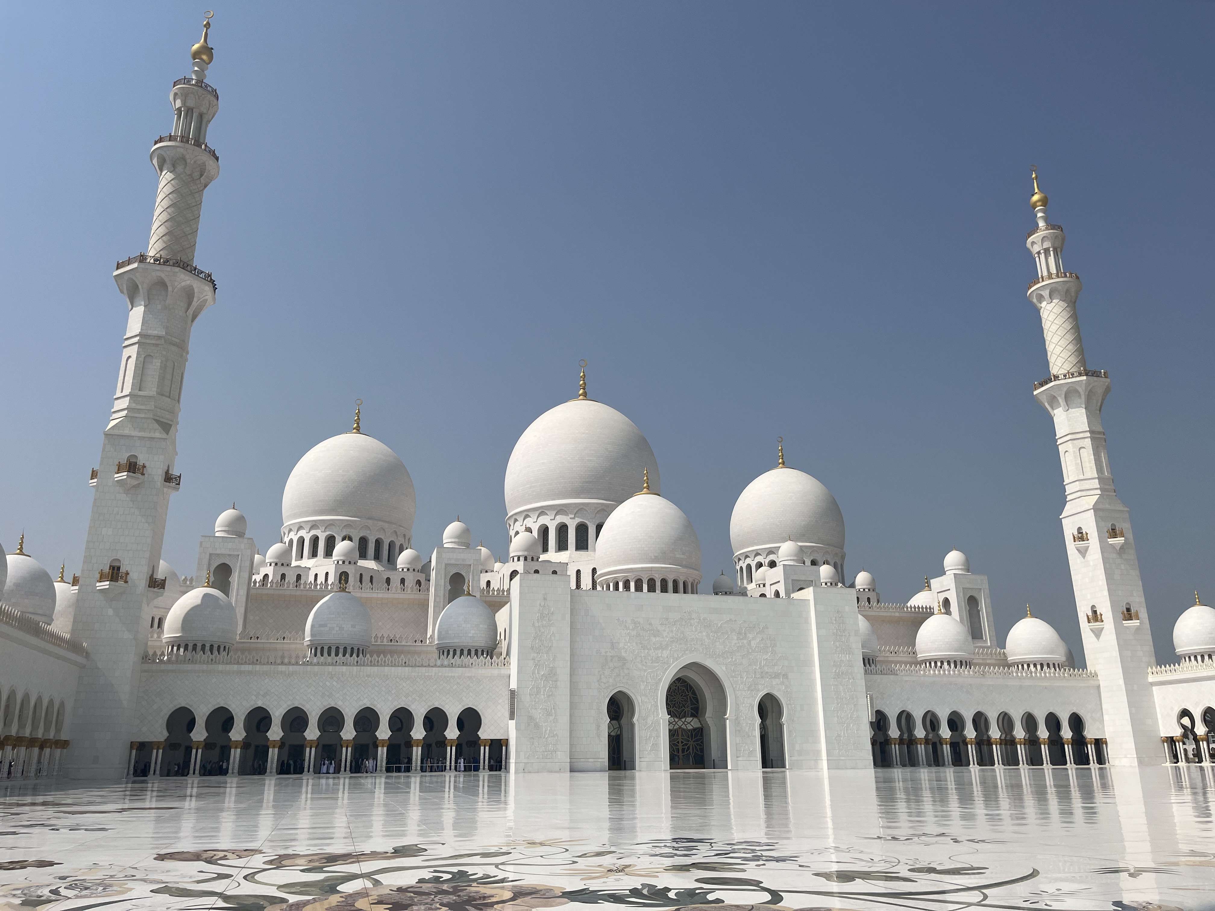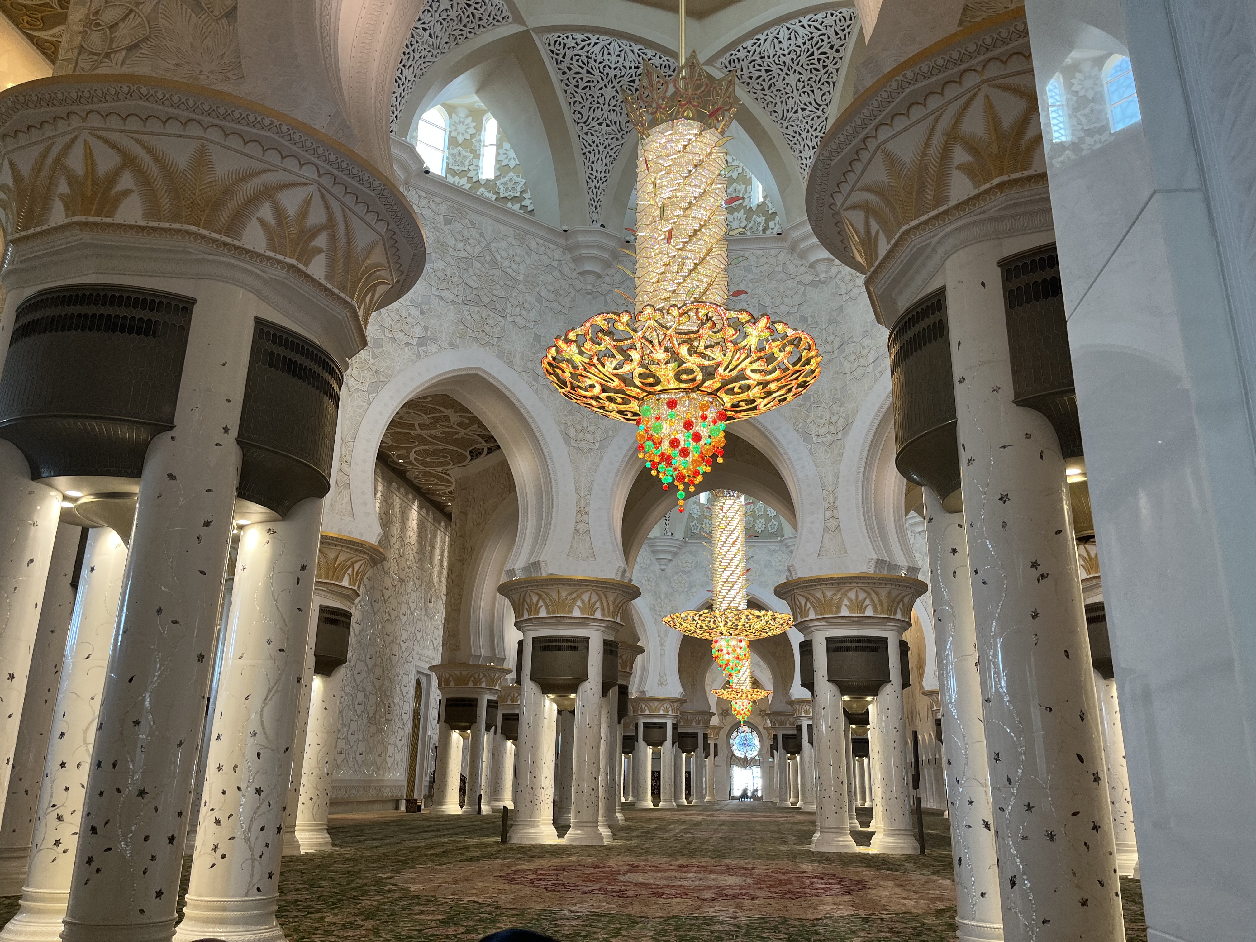 După ce am străbătut toate coridoarele și pasajele, am ajuns la intrarea în moschee. Chiar dacă nu este o construcție veche, istoria sa neavând nici două decenii, consider că moscheea din Abu Dhabi e probabil cea mai frumoasă din lume. Detaliile sale arhitecturale sunt unice iar într-o zi însorită albul cupolelor efectiv iți ia ochii.