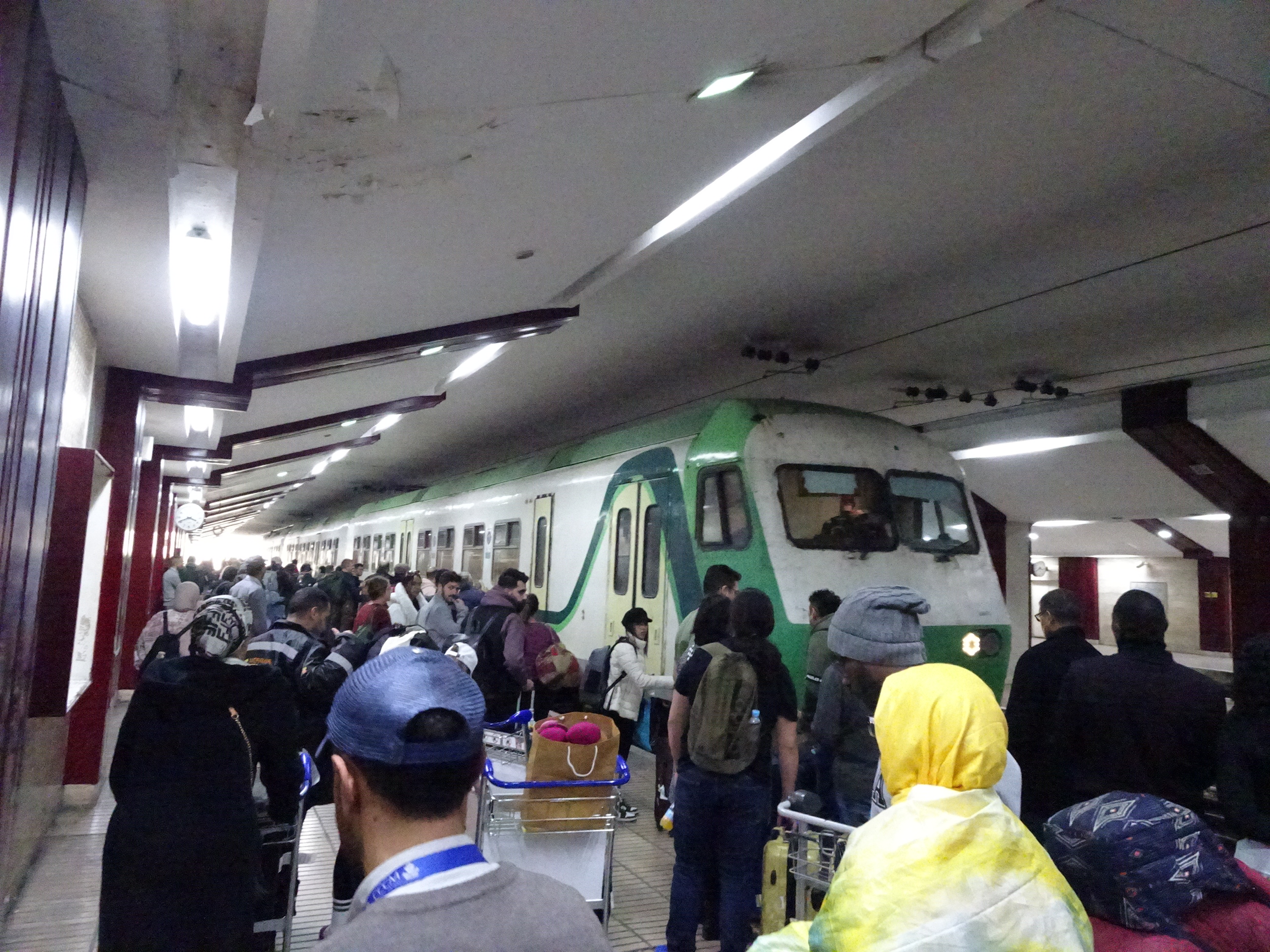 Aeroportul Casablanca se află destul de departe de centru. Mi s-a recomandat trenul ca cel mai rapid mod de a ajunge în oraș. El este într-adevăr rapid, doar că nu circulă foarte des. Am avut mult de așteptat până a venit următorul, iar când a venit se strânseseră deja sute de oameni.