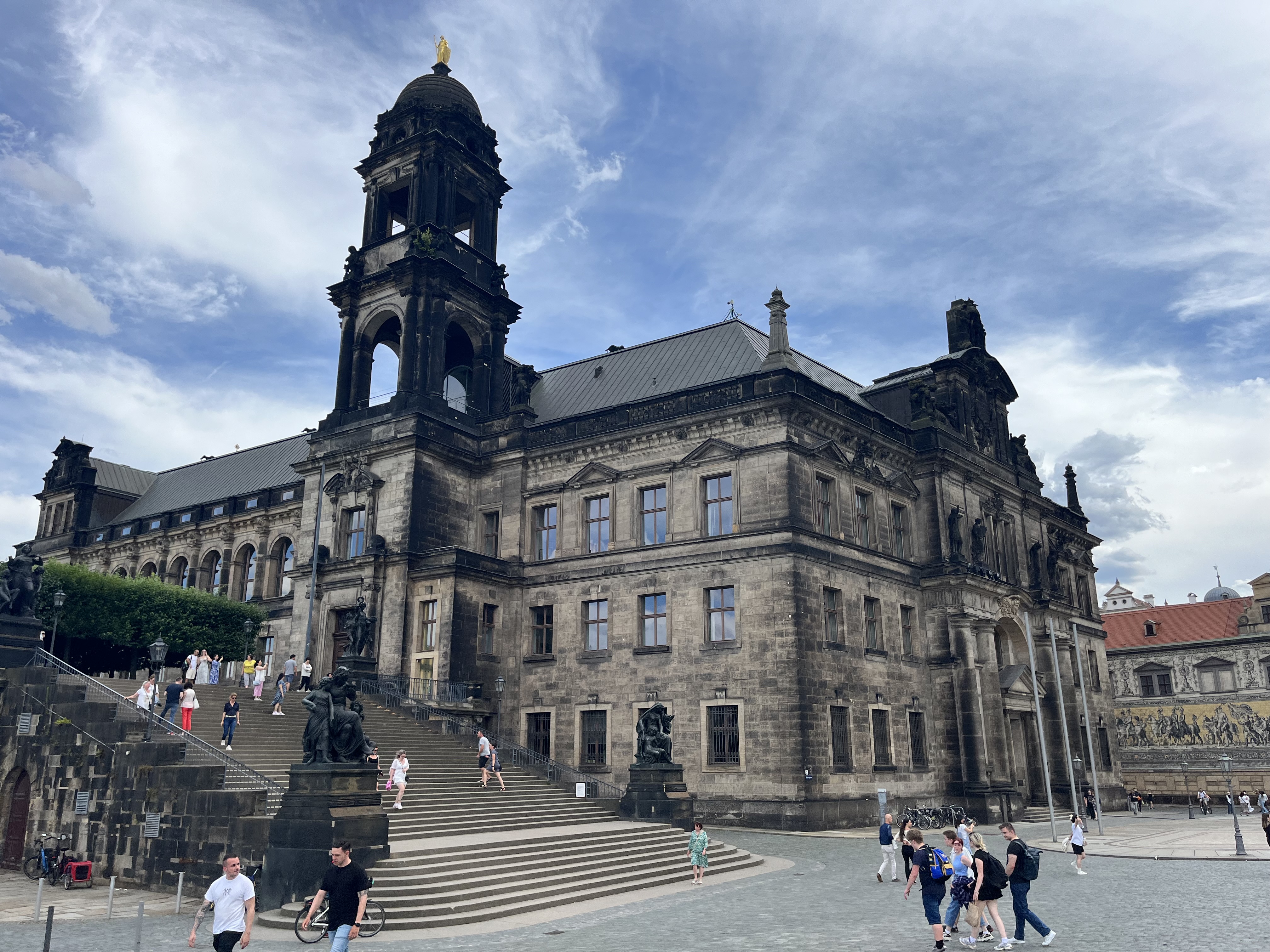 Fațada Dresden Schloss, o clădire superbă în stil gotic. Cărămizile negre arse de incendiul de după bombardament au fost păstrate intenționat așa cum erau.