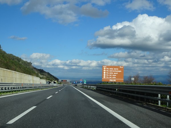Am continuat apoi spre Tropea pe autostrada A2. Tronsonul dintre Scilla și Vibo este unul din cele mai nou construite și are zeci de tuneluri și viaducte care traversează dealurile Calabriei