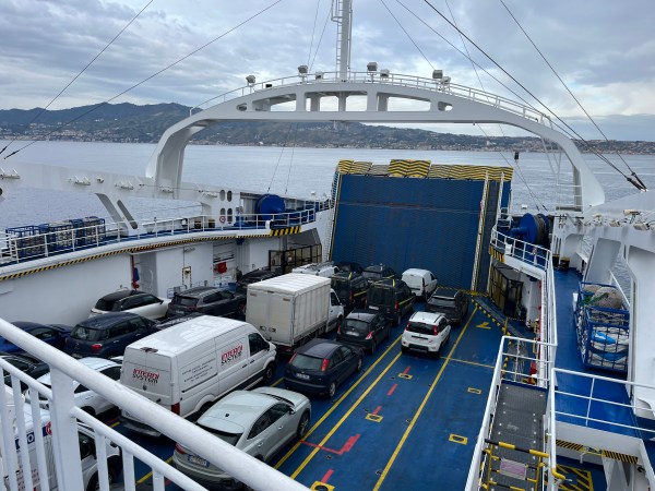 Dimineața, am revenit în Sicilia cu feribotul. De data aceasta, am prins aglomerație și a fost foarte convenabil că aveam deja biletul de întoarcere cumpărat de la Messina.