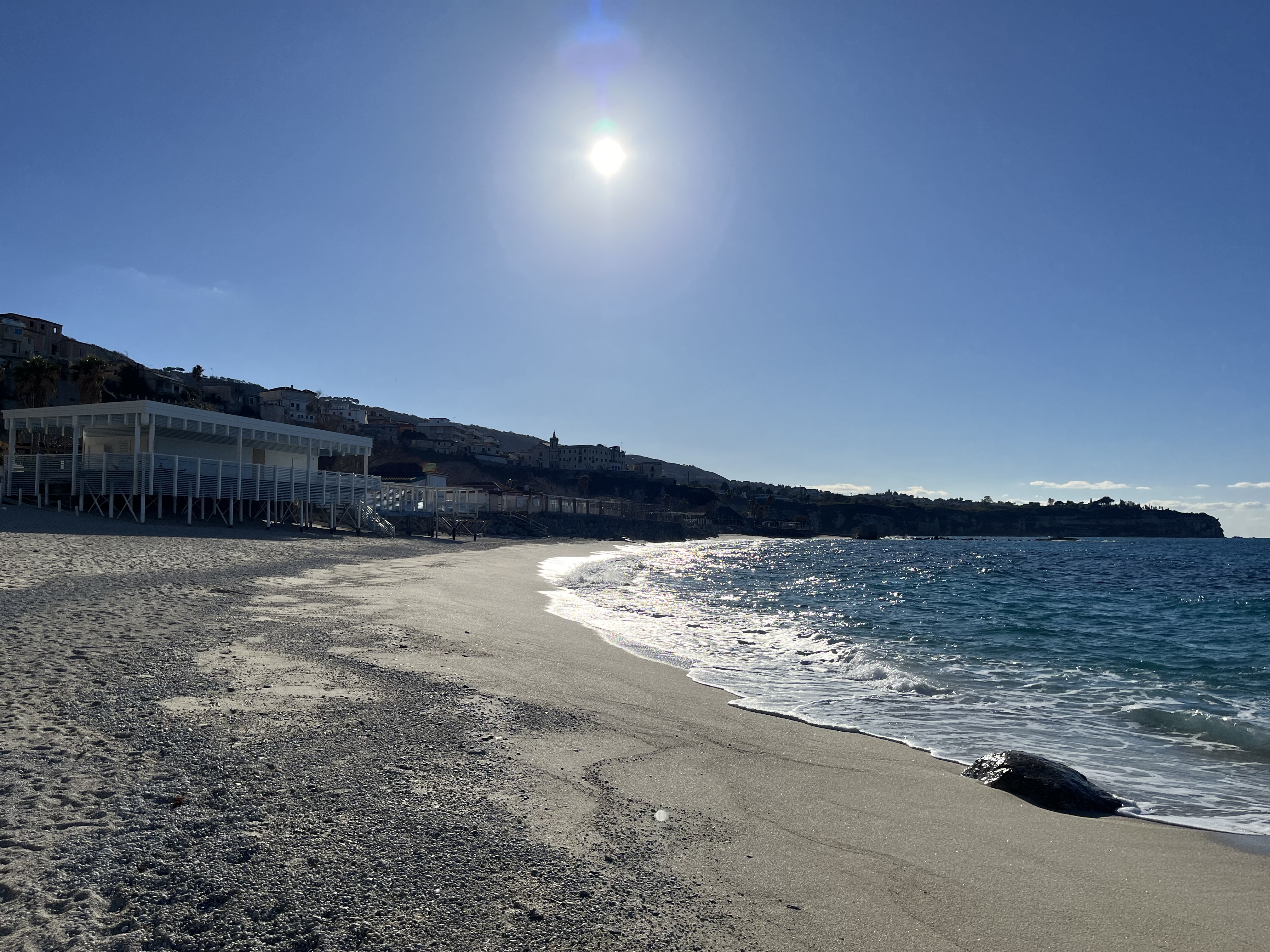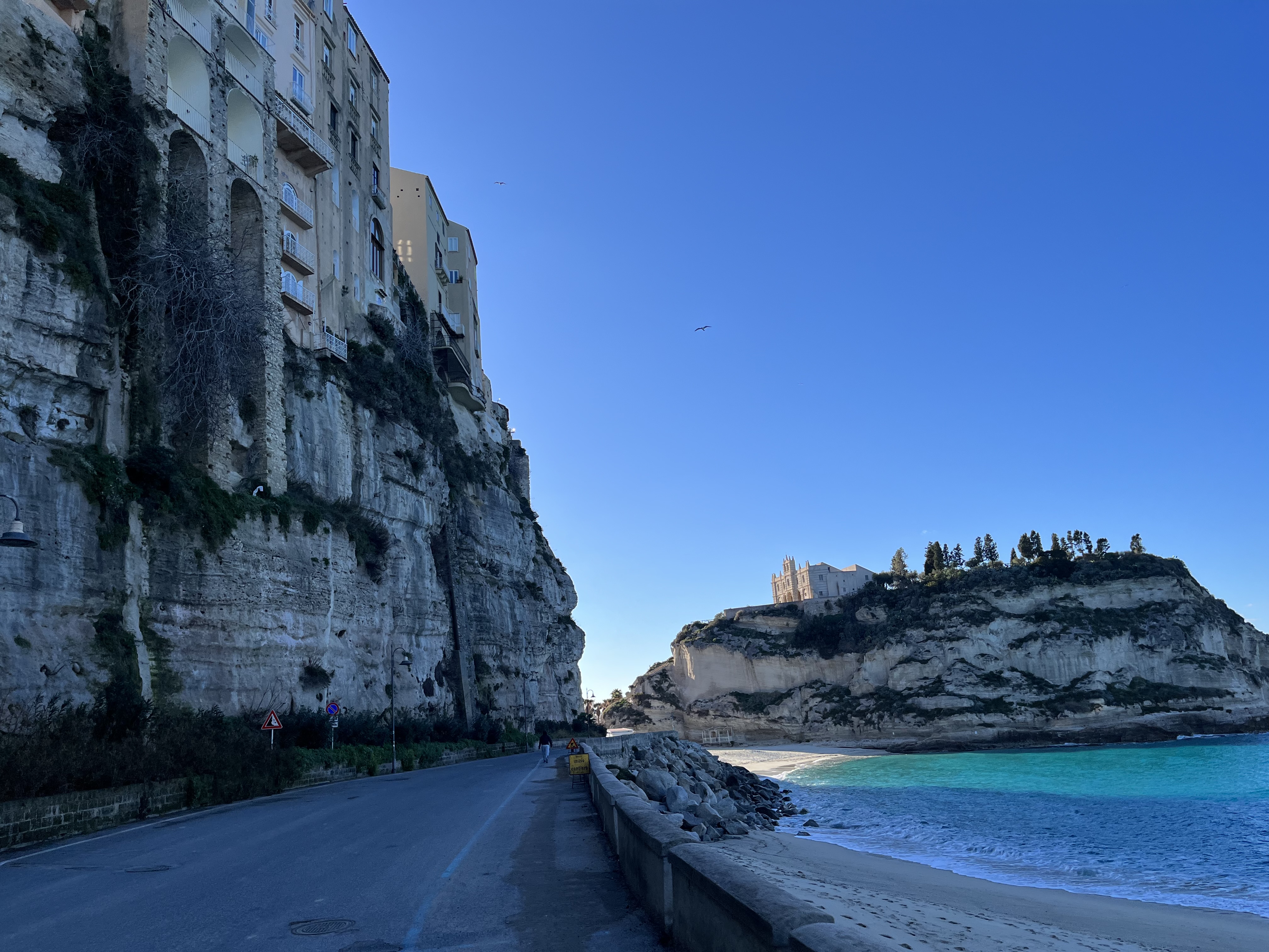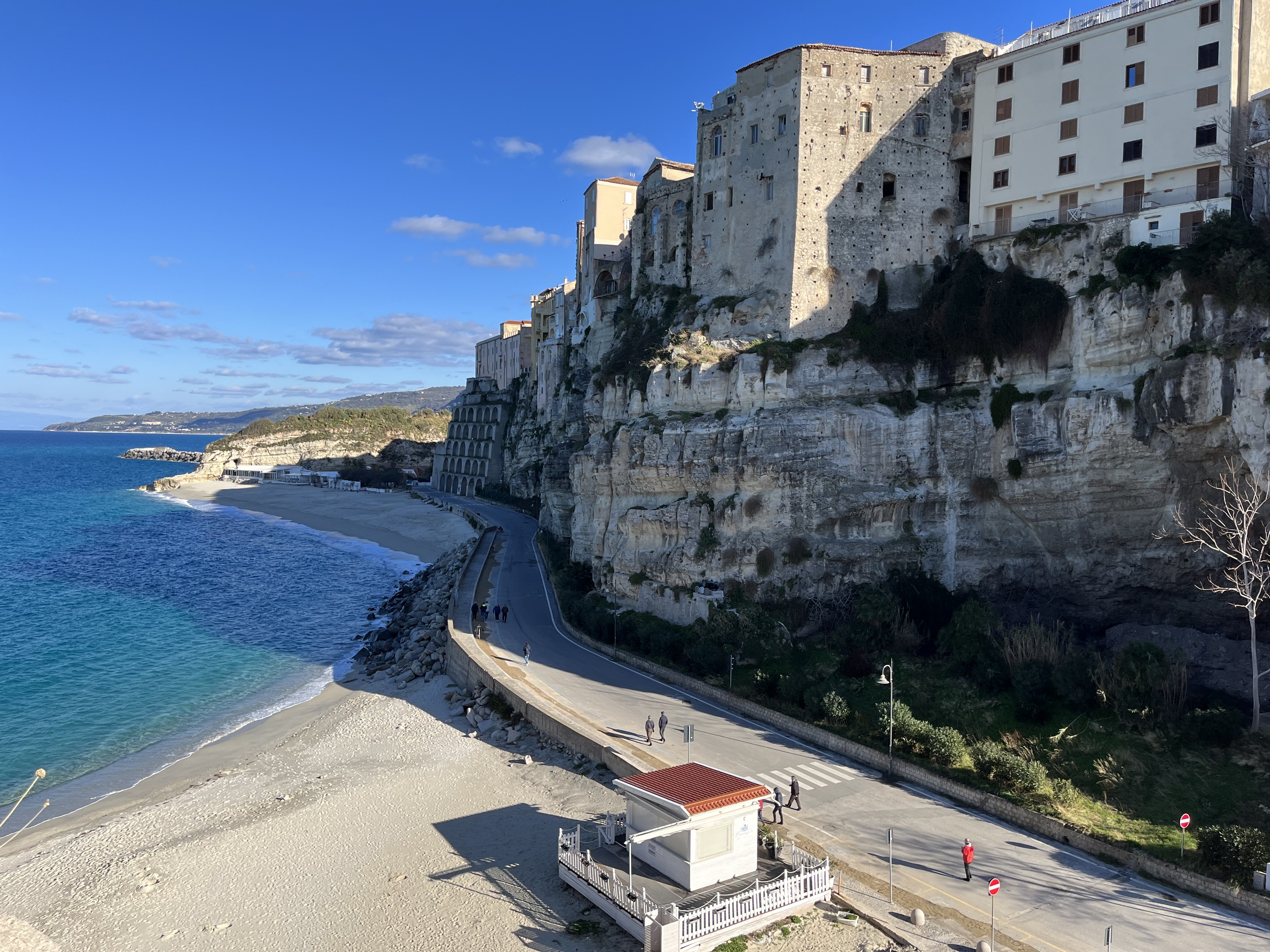 Pentru că vremea era așa frumoasă nu am mers întâi la hotel, ci direct către plaja din Tropea. Am înțeles imediat de ce locul este atât de apreciat de italieni. Plaja are nisip alb, fin, o mare foarte limpede iar peisajul sub stâncile abrupte este superb.